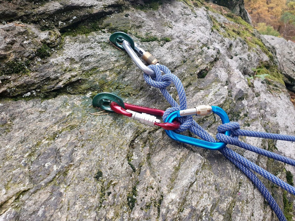 Wir nutzten die am „Turm der Mächtigen“ im Klettergarten oberhalb (nördlich) der Burgruine eingerichteten Übungsrouten mit bis zu vier (kurzen)