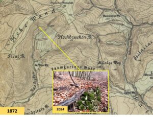 Die gelbe Markierung durch den Kasgraben nahm ihren Anfang beim Gasthaus „Zum grünen Jäger“ und führte hinauf zur Quelle der Jagdgöttin. Eine nette Symbolik, die heute in dieser Form aber leider nicht mehr stimmt, denn der „Grüne Jäger“, einst ein Fixpunkt in der Wienerwaldtopographie, wurde 2015 abgerissen. Die Göttin der Jagd und ihr kleines Bründl am Abhang des Hochbruckenberges werden hingegen noch lange weiterleben.