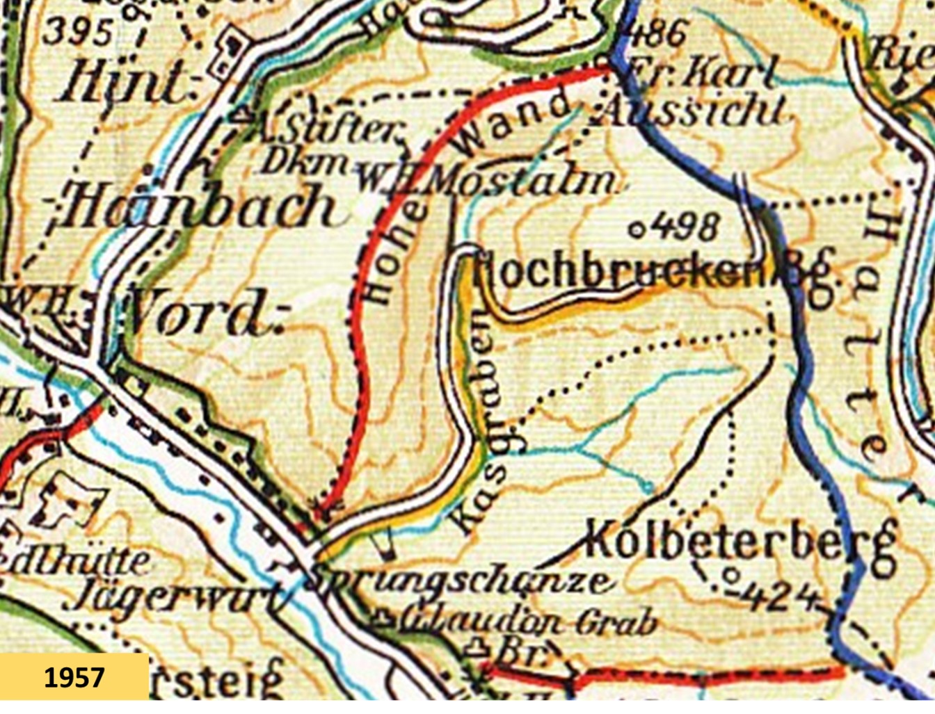 Um 1900 und noch viele Jahre danach bedeutete Schisport vorwiegend Schiwandern, Schispringen und Langlaufen. Und so ist es nicht weiter verwunderlich, dass es auch in Wien drei große Schisprungschanzen gab. Eine Schanze befand sich am Cobenzl, eine am Himmelhof und eine im Kasgraben bei Hadersdorf. Ihr ging eine kleinere Schanze, die sogenannte Buchbergschanze, südlich des alten Restaurants „Zum grünen Jäger“ voraus. Sie befand sich am nördlichen Abhang des Buchberges, oberhalb der heutigen Hundeschule, war aber nur einen Winter lang (1931) in Betrieb. Während die Wienerwaldschanze im Kasgraben tiefe Spuren im Bodenrelief des Wienerwaldes hinterlassen hat, lässt sich der Standort der wesentlich kleineren Buchbergschanze nur mehr erahnen.
