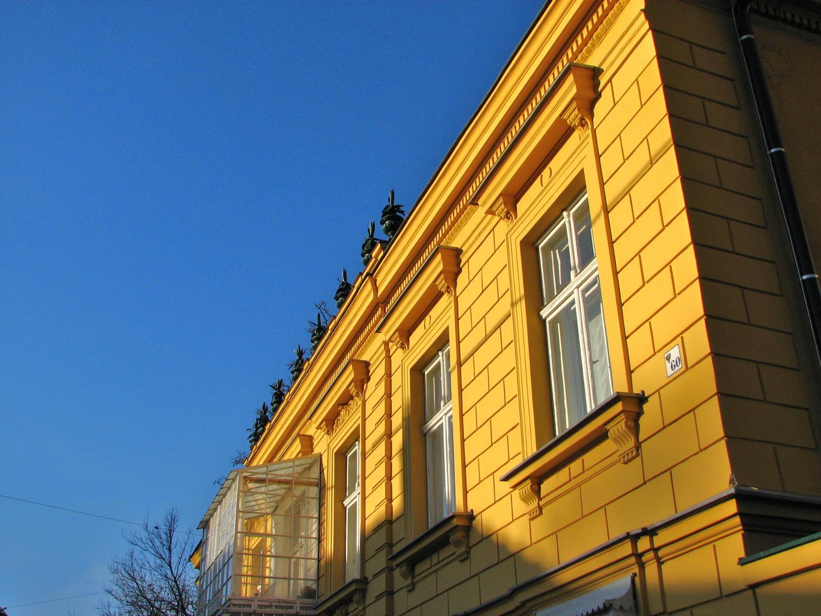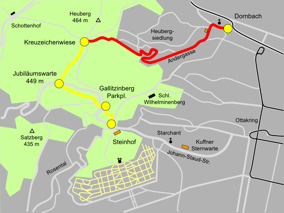 Die gelbe Markierung führt nun von der Jubiläumswarte auf einem breiten Waldweg abwärts zum Parkplatz am Gallitzinberg. Auf der angrenzenden Lagerwiese befand sich einst ein Steinbruch. Der gelb markierte Weg quert hier die Johann-Staud-Straße, führt am Parkplatz vorbei und erreicht kurz darauf Steinhof. Neben dem Toreingang zu den Steinhofgründen blickt einem stolz und wehrhaft das rote Gebäude der Feuerwache Am Steinhof entgegen.