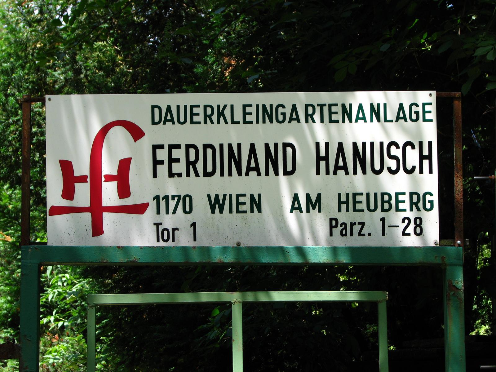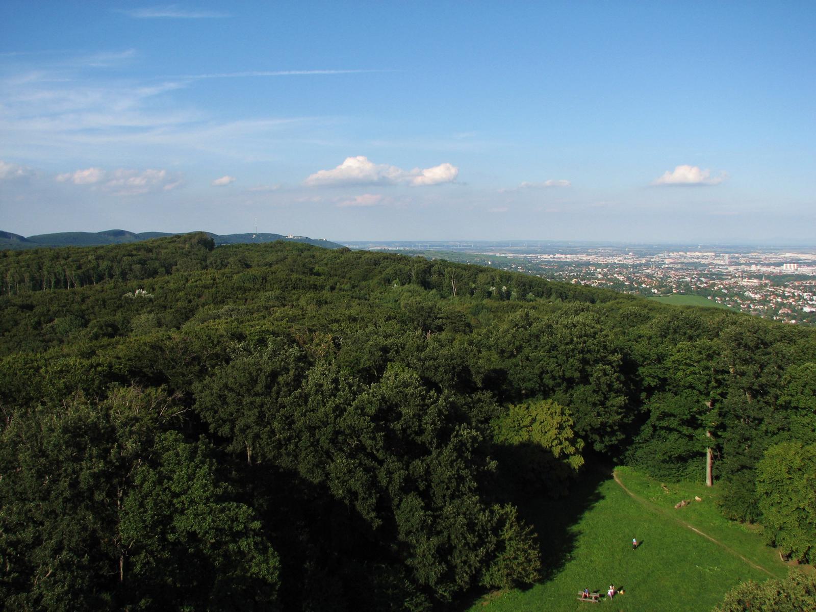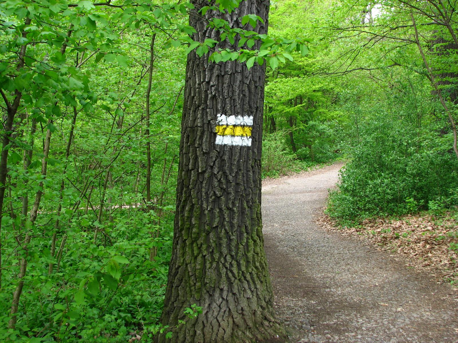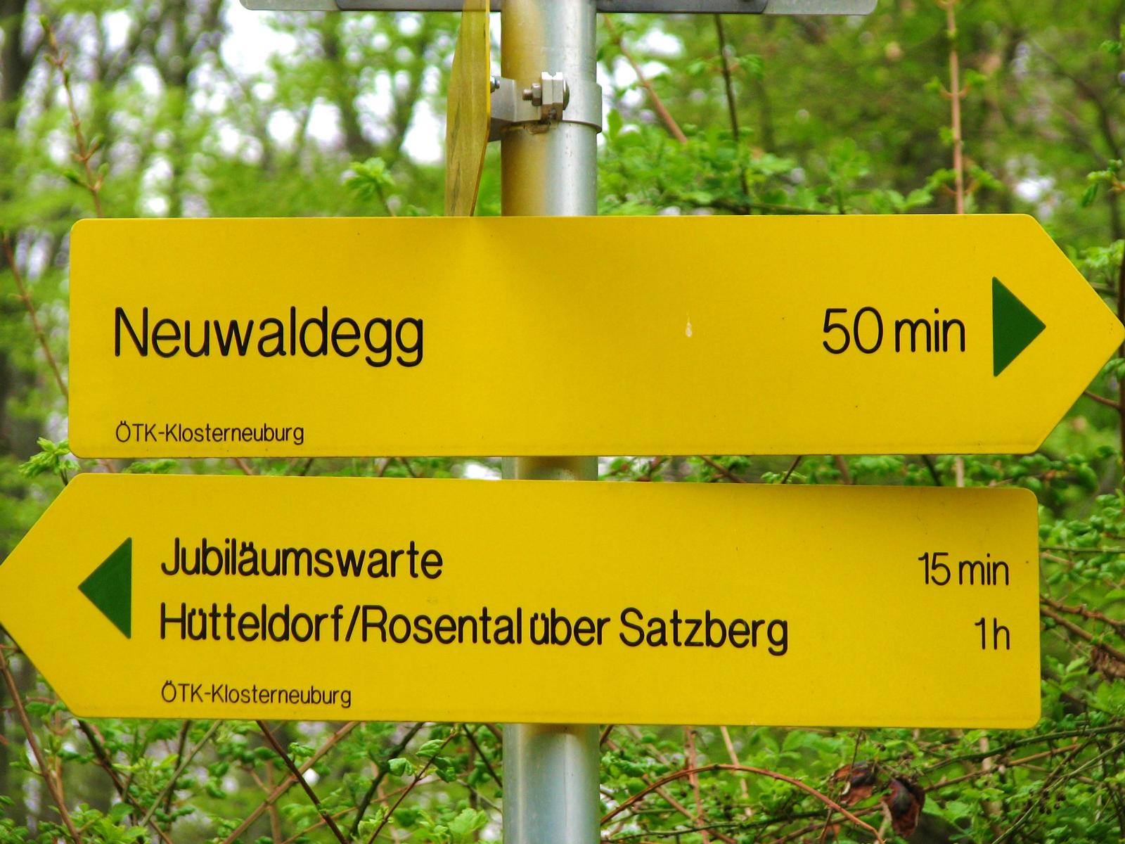 Von der Röntgengasse biegt die rote Markierung nun in die Schrammelgasse ein. Gegenüber der Hausnummer 28 verlässt man die asphaltierten Siedlungsgassen und wandert nun am unteren Rand der Kleingartenanlage „Ferdinand Hanusch“ bis zum Waldrand des Heuberges. Ab hier geht es durch den Buchenhochwald zügig bergauf, an einer gemauerten alten Quellfassung vorbei, bis zum Wegknotenpunkt Kreuzeichenwiese, wo sich sieben markierte und einige unmarkierte Wanderwege kreuzen. Die Kreuzeichenwiese ist eine beliebte Ausflugswiese im Einzugsbereich von Ottakring. Hier folgt man dem gelben Wegweiser, der Richtung Jubiläumswarte zeigt und wandert nun der gelben Markierung folgend – die hier auch von einer grünen Markierung begleitet wird – über die Kreuzeichenwiese bis zur unübersehbaren, sich in den Himmel schraubenden Jubiläumswarte, dem höchsten Punkt dieser Wanderung.