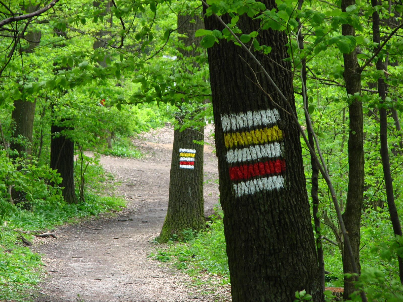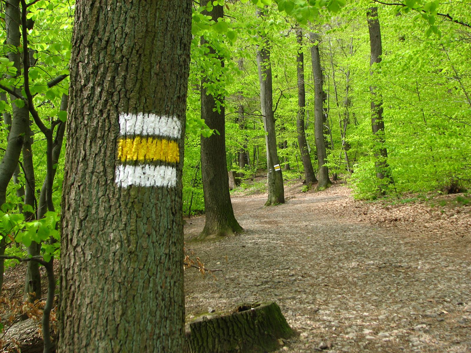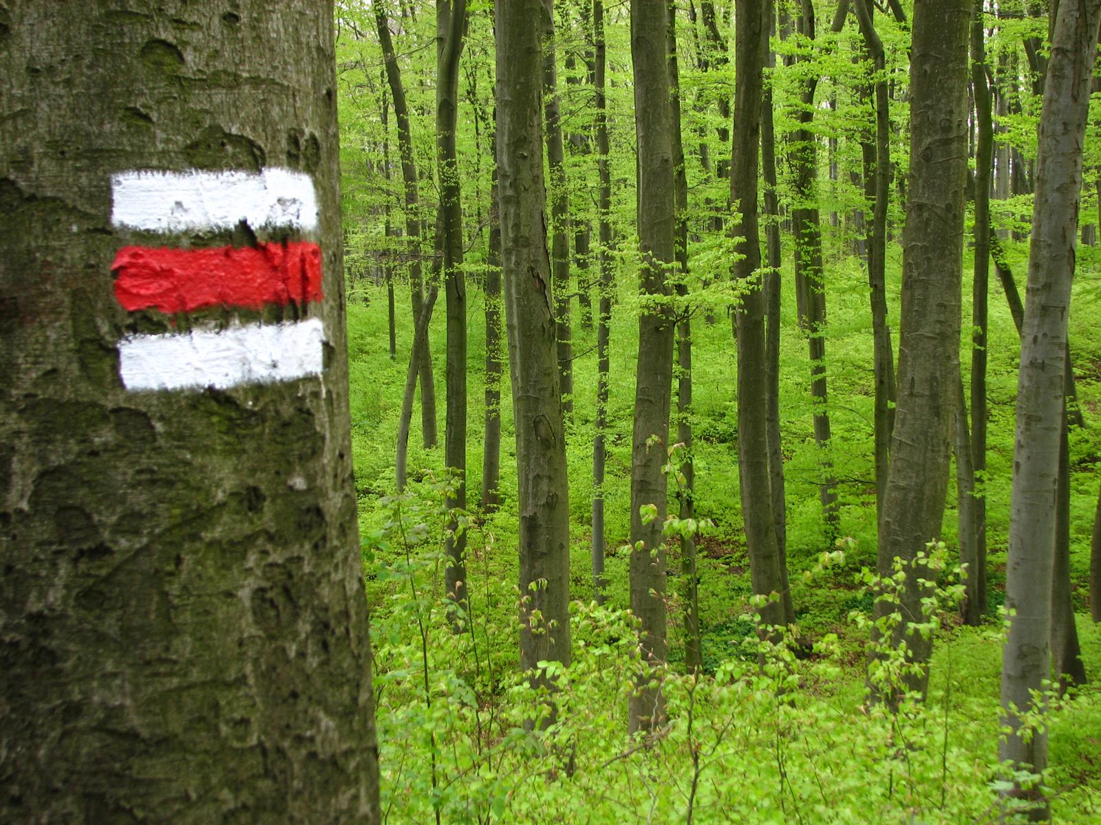 Von der Röntgengasse biegt die rote Markierung nun in die Schrammelgasse ein. Gegenüber der Hausnummer 28 verlässt man die asphaltierten Siedlungsgassen und wandert nun am unteren Rand der Kleingartenanlage „Ferdinand Hanusch“ bis zum Waldrand des Heuberges. Ab hier geht es durch den Buchenhochwald zügig bergauf, an einer gemauerten alten Quellfassung vorbei, bis zum Wegknotenpunkt Kreuzeichenwiese, wo sich sieben markierte und einige unmarkierte Wanderwege kreuzen. Die Kreuzeichenwiese ist eine beliebte Ausflugswiese im Einzugsbereich von Ottakring. Hier folgt man dem gelben Wegweiser, der Richtung Jubiläumswarte zeigt und wandert nun der gelben Markierung folgend – die hier auch von einer grünen Markierung begleitet wird – über die Kreuzeichenwiese bis zur unübersehbaren, sich in den Himmel schraubenden Jubiläumswarte, dem höchsten Punkt dieser Wanderung.