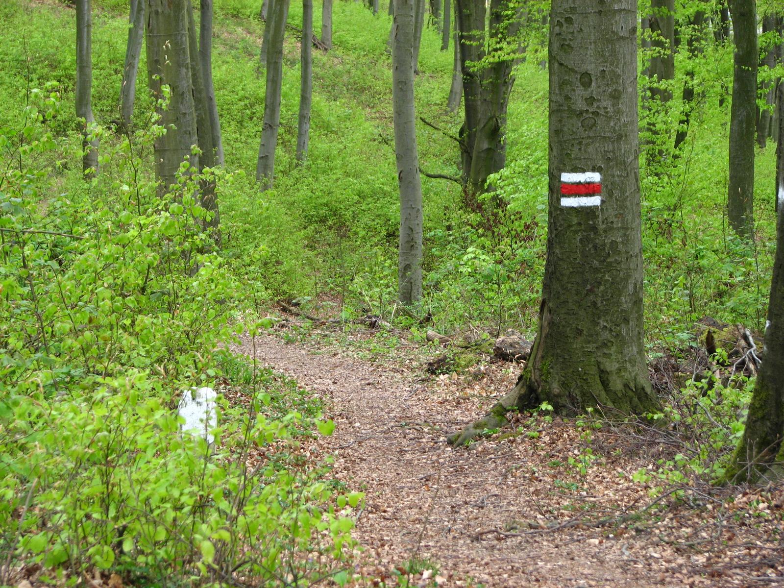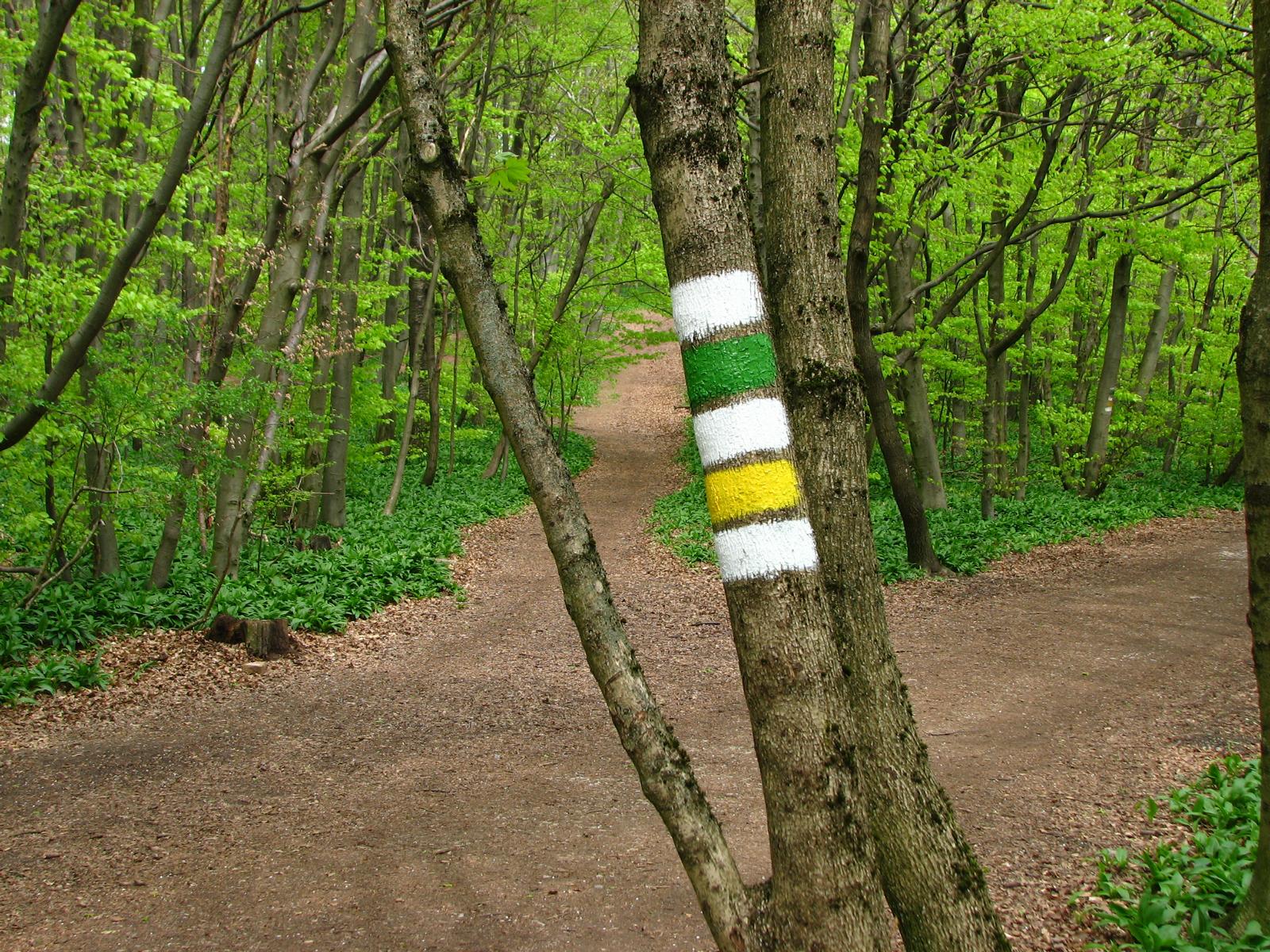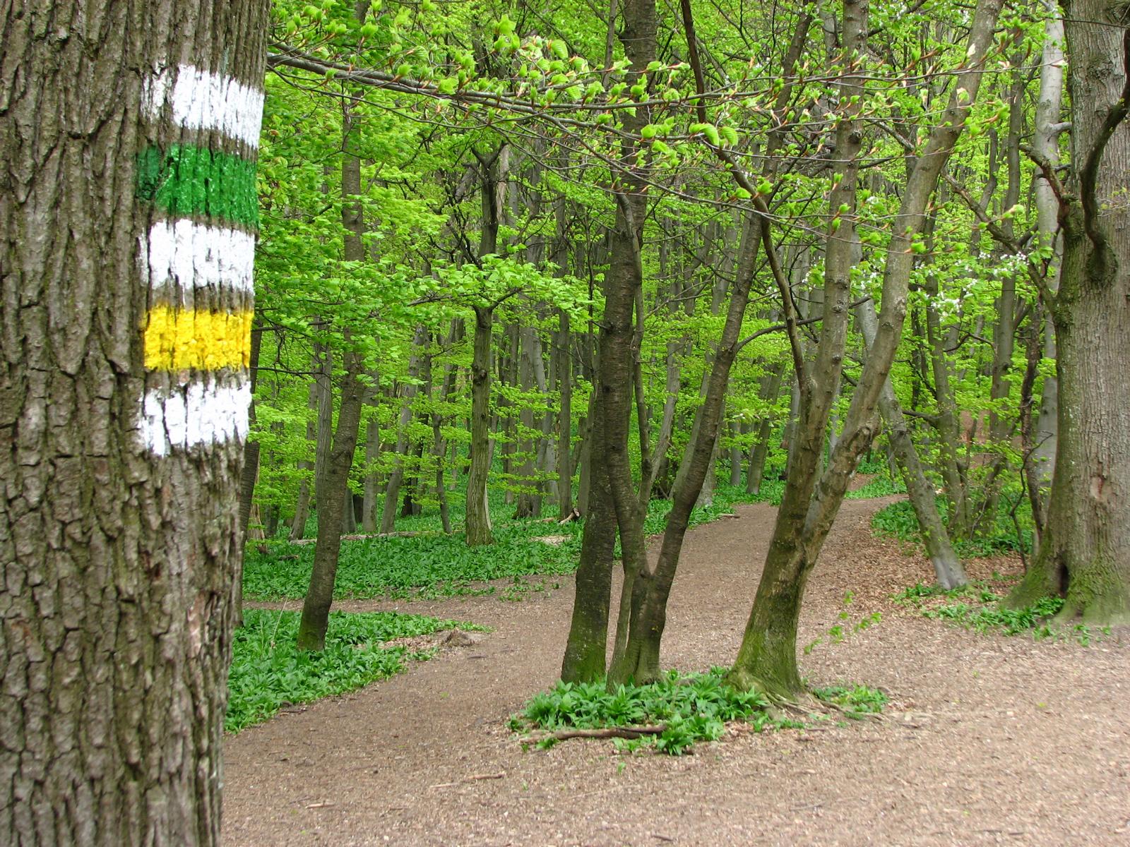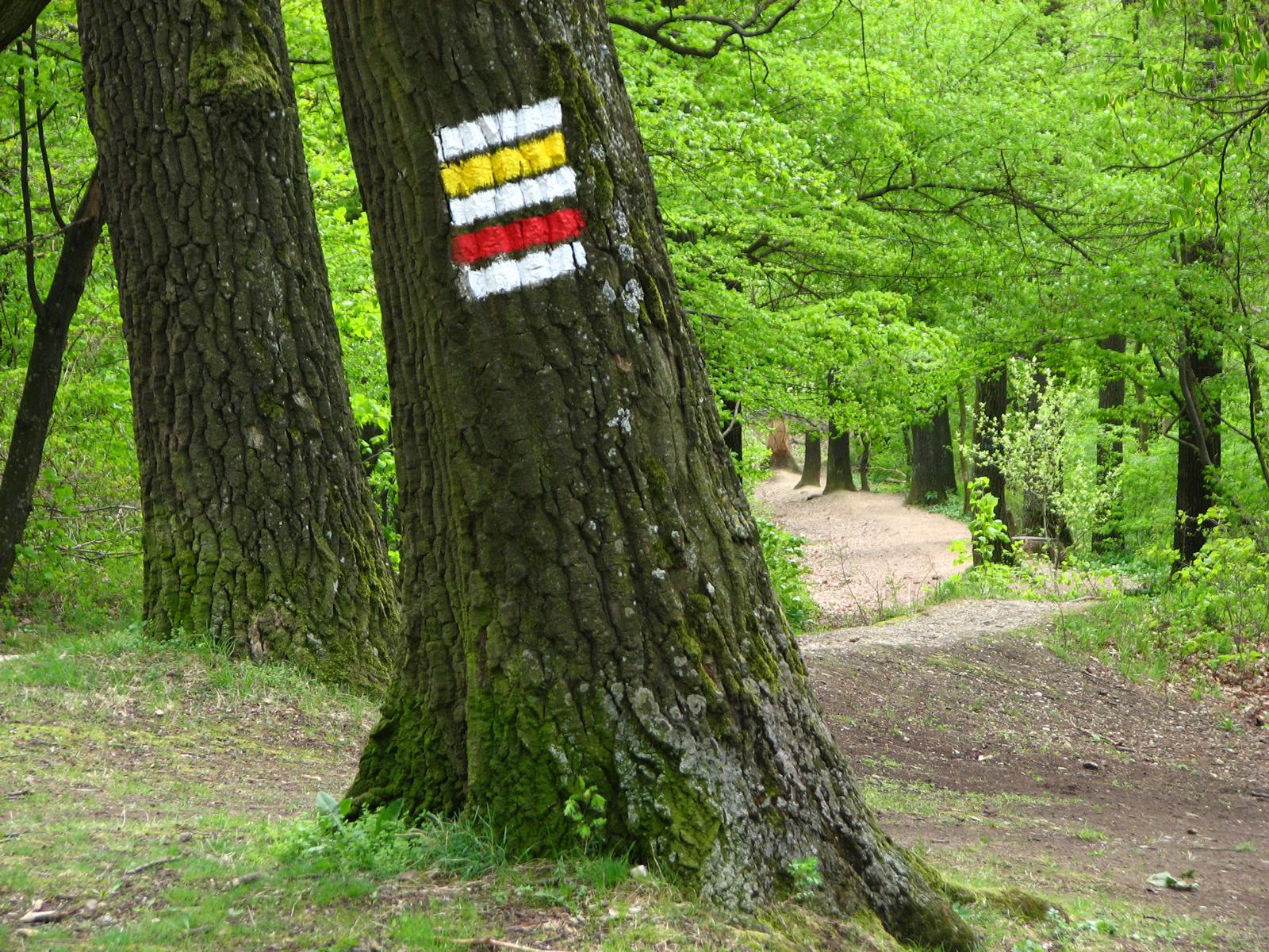 Von der Röntgengasse biegt die rote Markierung nun in die Schrammelgasse ein. Gegenüber der Hausnummer 28 verlässt man die asphaltierten Siedlungsgassen und wandert nun am unteren Rand der Kleingartenanlage „Ferdinand Hanusch“ bis zum Waldrand des Heuberges. Ab hier geht es durch den Buchenhochwald zügig bergauf, an einer gemauerten alten Quellfassung vorbei, bis zum Wegknotenpunkt Kreuzeichenwiese, wo sich sieben markierte und einige unmarkierte Wanderwege kreuzen. Die Kreuzeichenwiese ist eine beliebte Ausflugswiese im Einzugsbereich von Ottakring. Hier folgt man dem gelben Wegweiser, der Richtung Jubiläumswarte zeigt und wandert nun der gelben Markierung folgend – die hier auch von einer grünen Markierung begleitet wird – über die Kreuzeichenwiese bis zur unübersehbaren, sich in den Himmel schraubenden Jubiläumswarte, dem höchsten Punkt dieser Wanderung.