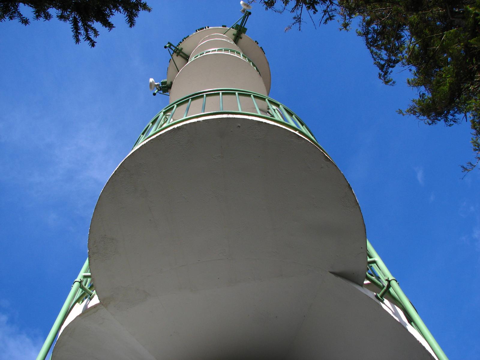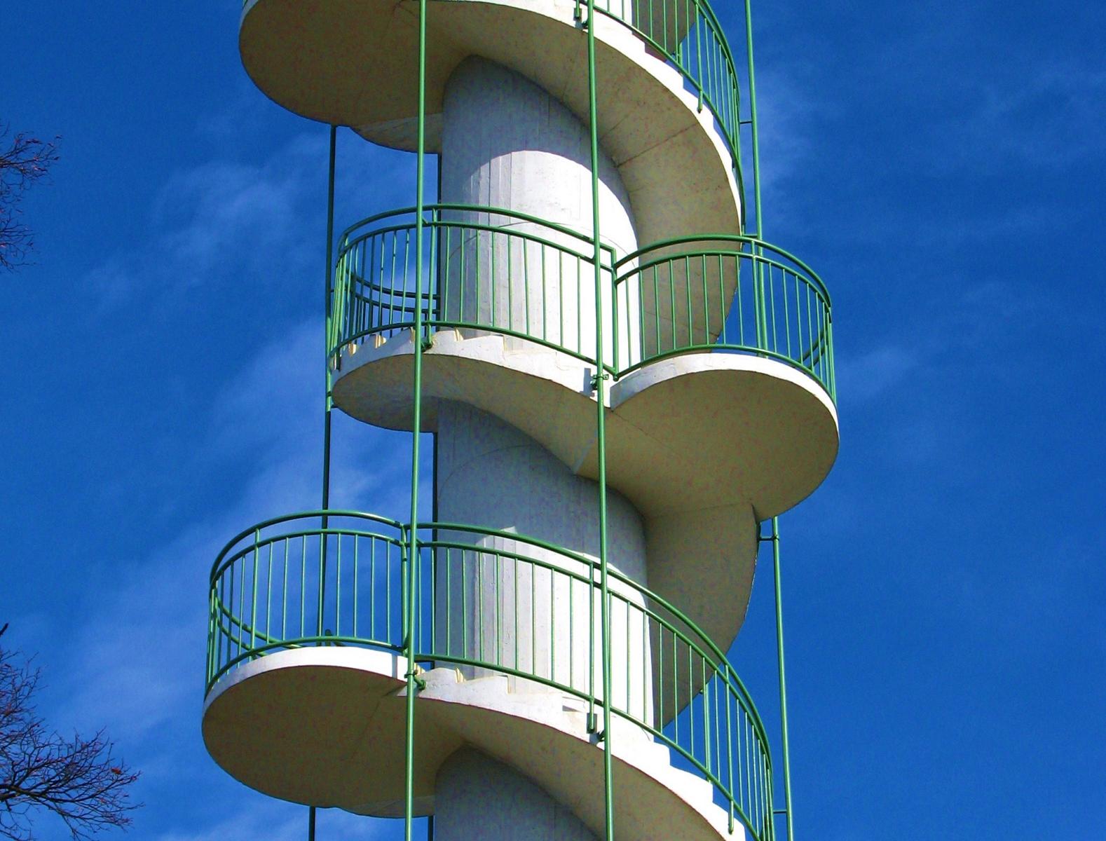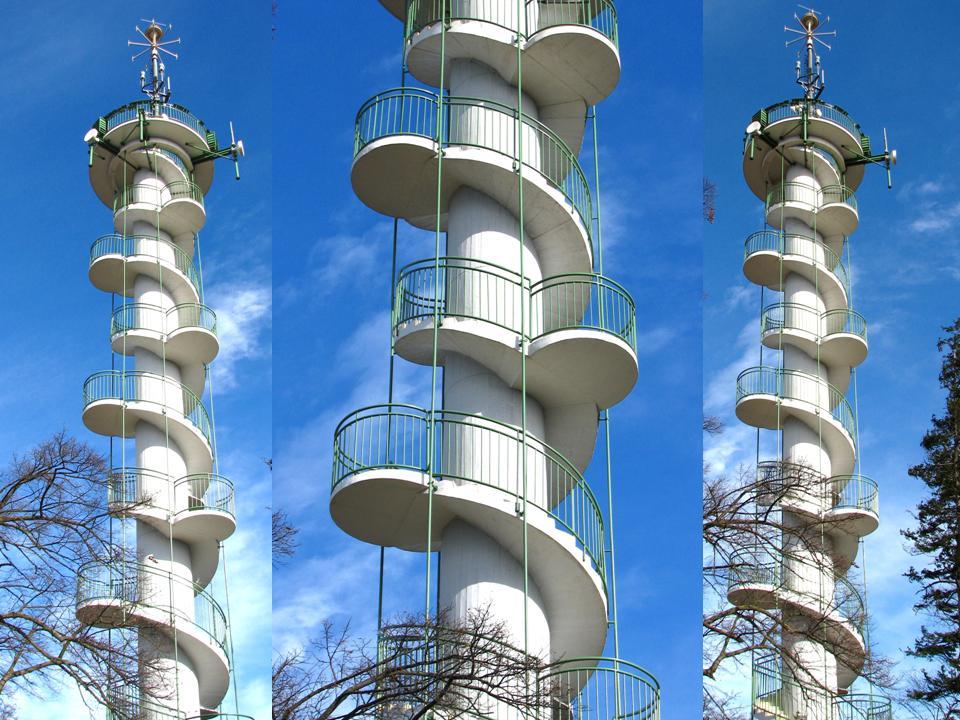 Aussichtswarten sind Bauwerke an ganz besonderen Landschaftspunkten. Sie bieten nicht nur von ihren Plattformen den Blick nach unten und in die Ferne, diese Türme sind auch ein Blickfang für den Betrachter am Boden. Diese besondere Funktion führte oft dazu, dass man solche Bauwerke nicht nur als reine Zweckbauten verstand, sondern mit einer besonderen architektonischen Note versah. Bestes Beispiel dafür ist die Habsburgwarte am Hermannskogel (542 m). Jede Architekturepoche hat ihre eigene Formensprache. Das gilt auch für die 1950er und 1960er Jahre. Die Jubiläumswarte in Ottakring wurde 1956 eröffnet und ist bereits die dritte Aussichtswarte an diesem Standort. Ihren Namen leitet sie von der alten „Kaiser-Jubiläumswarte“ ab, die 1898 anlässlich des 50jährigen Regierungsjubiläums von Kaiser Franz Josef I. (1830-1916) hier eröffnet wurde. Sie reiht sich damit in eine ganze Reihe von Aussichtswarten im Osten Österreichs ein, die diesen Namen tragen. Die 32,5 m hohe Warte wurde von Architekt Karl Högler (*1912) des Wiener Stadtbauamtes geplant. Sie besteht im Wesentlichen aus einem runden Stahlbetonschaft mit außenliegender, rechts gewendelter Treppe, zwölf halbkreisförmigen Zwischenpodesten und einer kreisrunden Aussichtsplattform in einer beachtlichen Höhe von 31,2 m. Diese außergewöhnliche Turmhöhe ist Garant dafür, dass der obenstehende Betrachter über den Buchenhochwald hinwegblicken kann, was bei vielen anderen Aussichtswarten leider nicht immer der Fall ist. Diesen Aussichtswartentypus, mit mittigem Stahlbetonrohr und außen liegender Wendeltreppe, findet man auch bei der bereits erwähnten und 1967 eröffneten Leopold-Figl-Warte am Tulbinger Kogel (494 m). Eine sehr ähnliche Konstruktion gab es auch bei der 1962 eröffneten und 1995 wieder abgetragenen Troppbergwarte, die durch eine Sendemastkonstruktion ersetzt wurde. Letzten Endes folgt auch der größte Aussichtsturm Österreichs, der Donauturm, diesem Konstruktionsschema, allerdings mit dem Unterschied, dass die Treppe (Lift) im Inneren des runden Stahlbetonrohres liegt.
