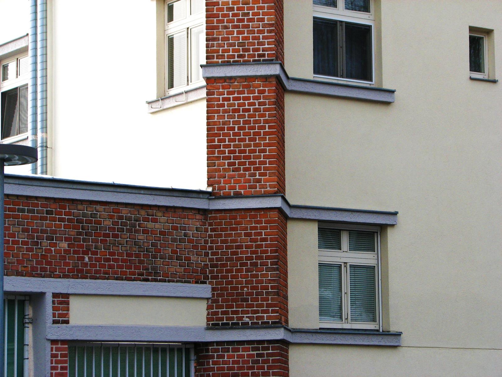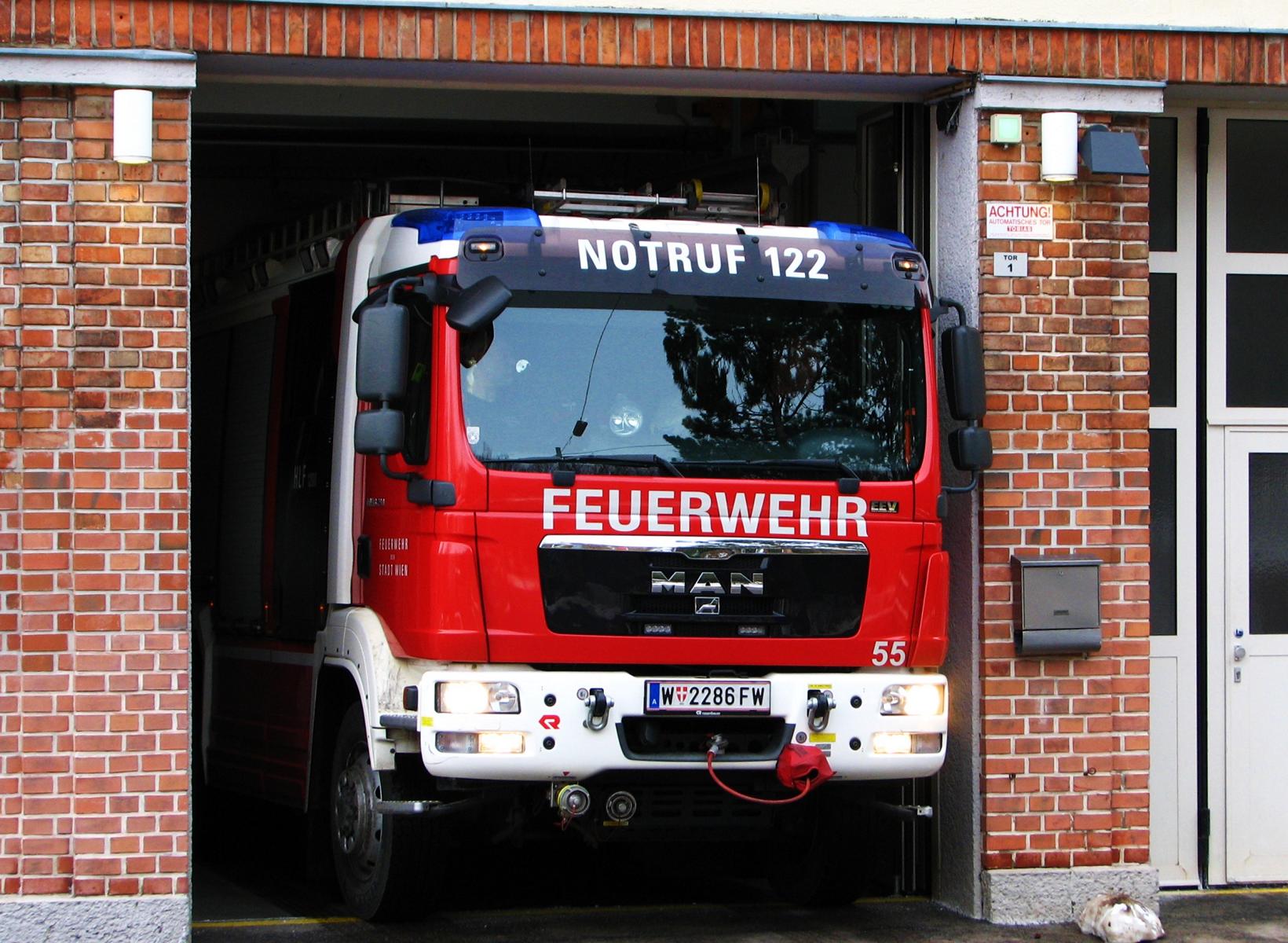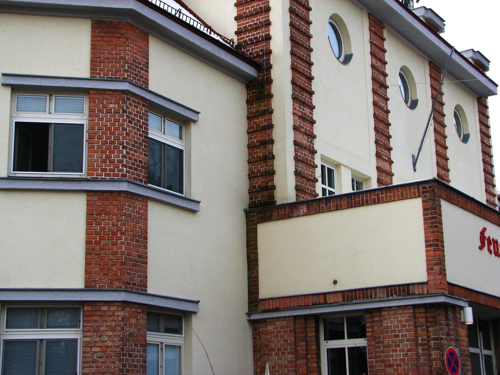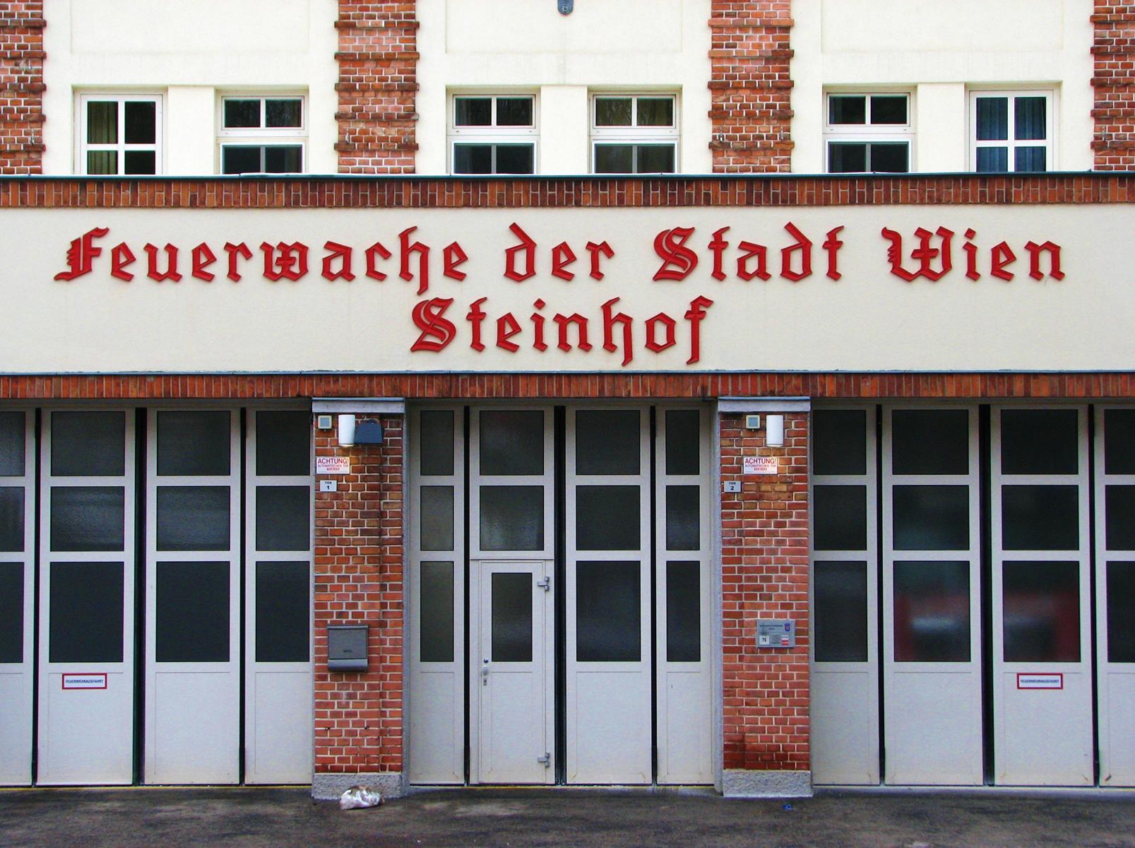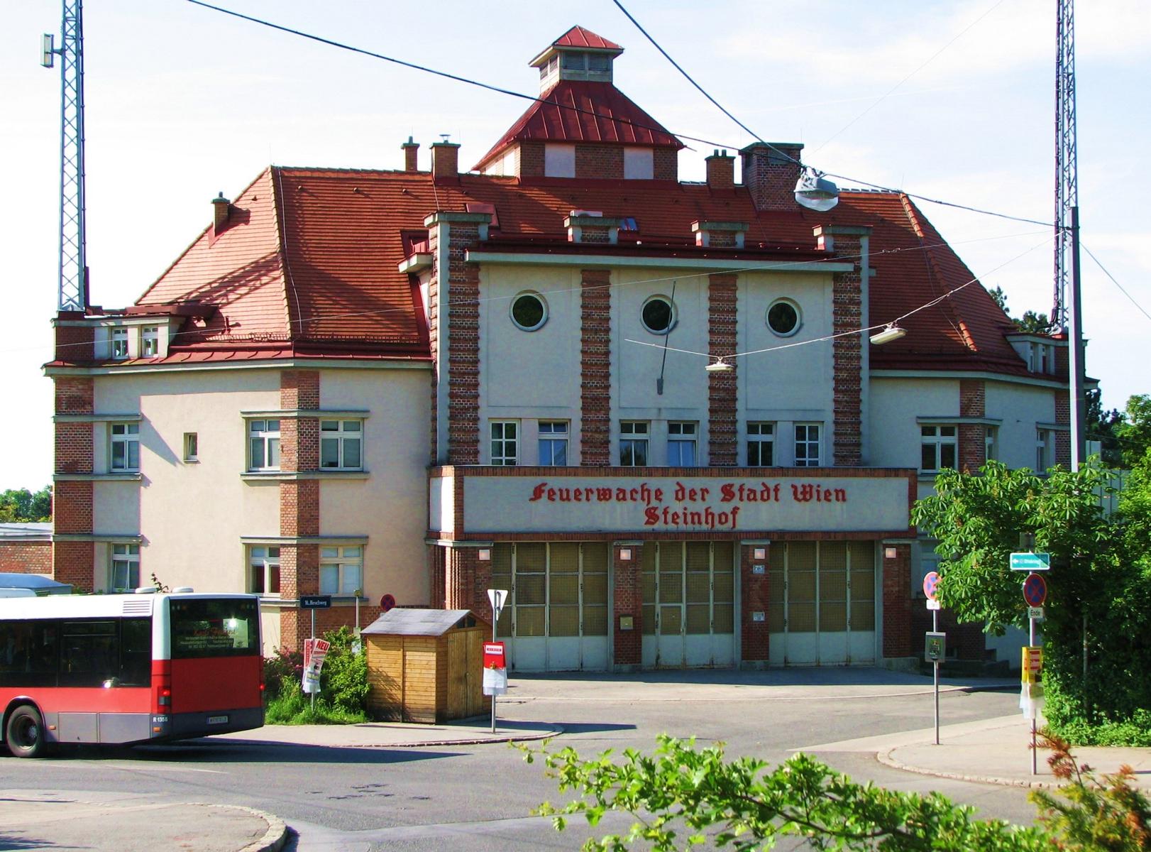 Das Gebäude in der Johann-Staud-Straße 75 ist ein echter Blickfang. Der große Dachkörper und die beidseits hochgezogenen Sendemasten verleihen dem Gebäude eine kulissenartige Erscheinung. Es weist alle Attribute einer Prospektarchitektur auf, wobei die Funktionen des Gebäudes stilistisch sehr betont werden. Besonders hervorstechend ist der risalitartige Vorbau mit den drei großen Garagentoren und den darüber liegenden Okulifenstern. Diese kreisrunde Fensterform und die sehr wirkungsvoll eingesetzte rote Klinkerverkleidung sind architektonische Stilmittel, die für die 1920er und 1930er Jahre typisch sind. Man findet diese Formensprache auch sehr häufig bei den Gemeindebauten der Zwischenkriegszeit. Gebaut wurde die Feuerwache in der Ära des Roten Wien, in den Jahren 1929/30. Architekt war der Vorstand der Architekturabteilung des Wiener Stadtbauamtes, Josef Bittner (1879-1945). Er war in dieser Funktion für die kommunale Bautätigkeit der 1920er Jahre in Wien künstlerisch richtungsweisend. Von ihm stammen auch die Feuerwachen in Speising, Grinzing, Neustift am Walde, Kahlenbergerdorf und Floridsdorf/Am Spitz, die alle durch eine charakteristische Architektur bestechen. Keine dieser Wachen verfügt jedoch über einen derart pompösen Baukörper, wie die Feuerwache am Steinhof. Vielleicht kokettierte Josef Bittner bei der Baukörper- und Fassadengliederung ein wenig mit der in unmittelbarer Nachbarschaft thronenden Kirche Am Steinhof? Dem Zeitgeist des Roten Wien würde es entsprechen.