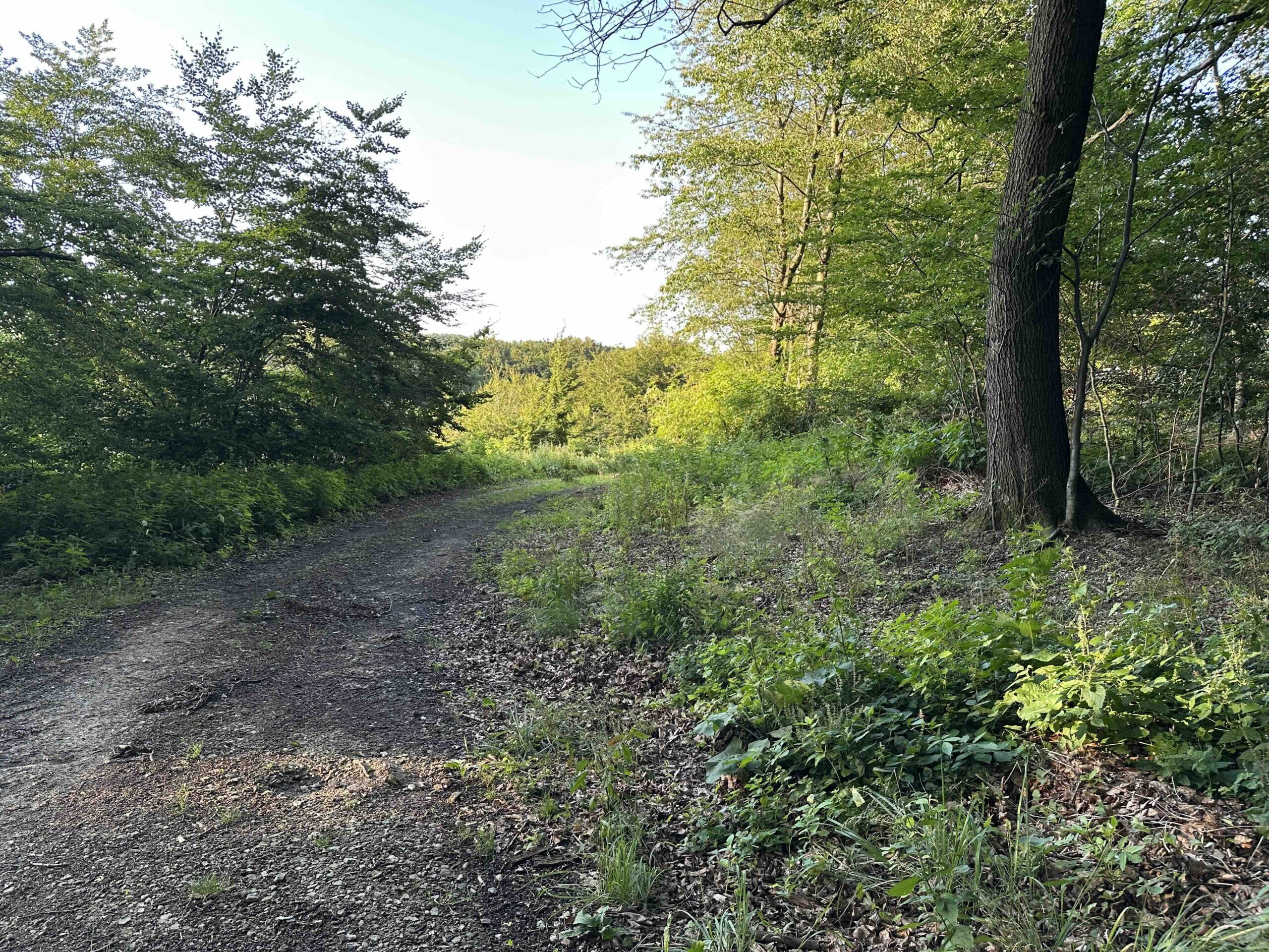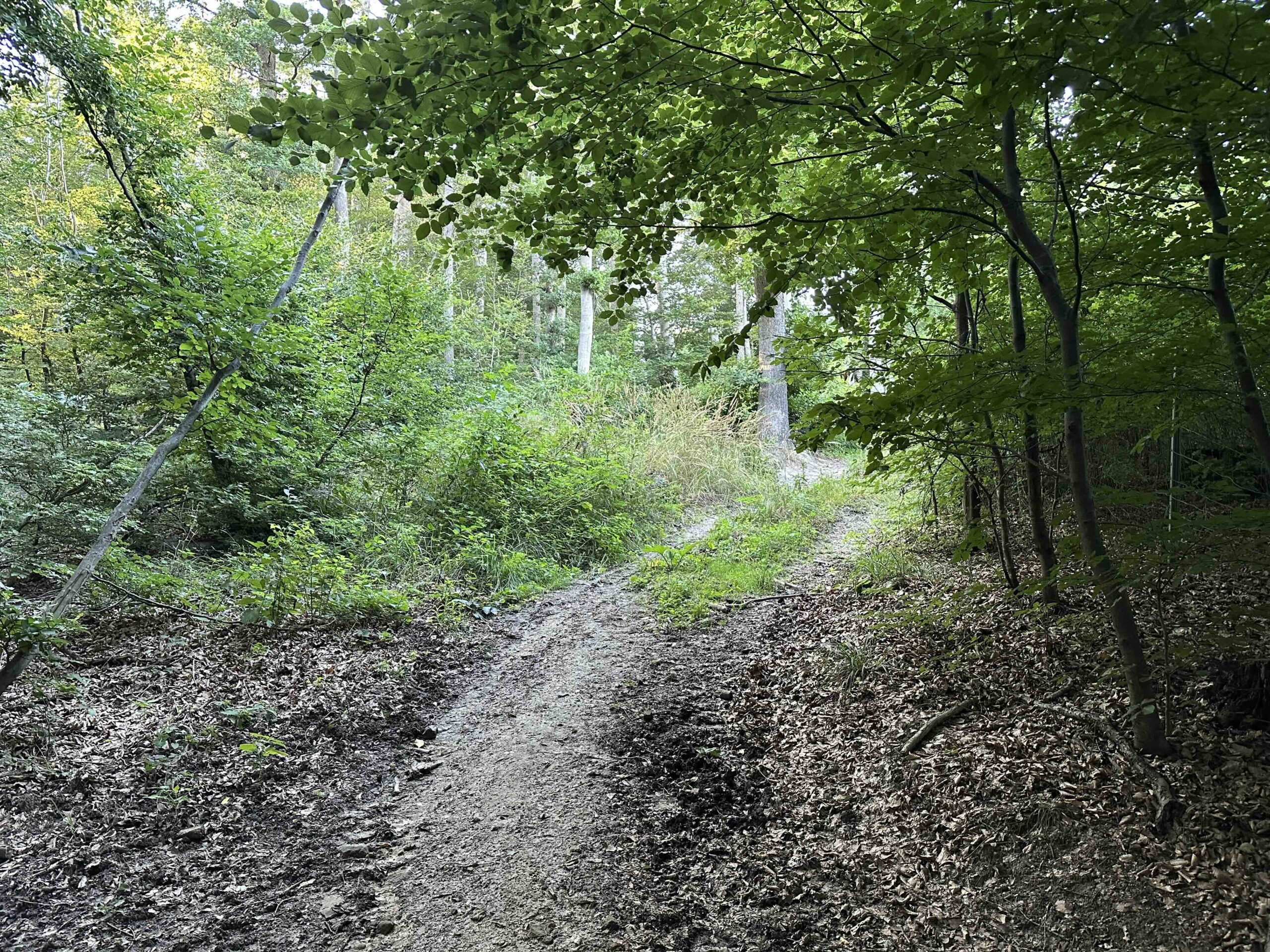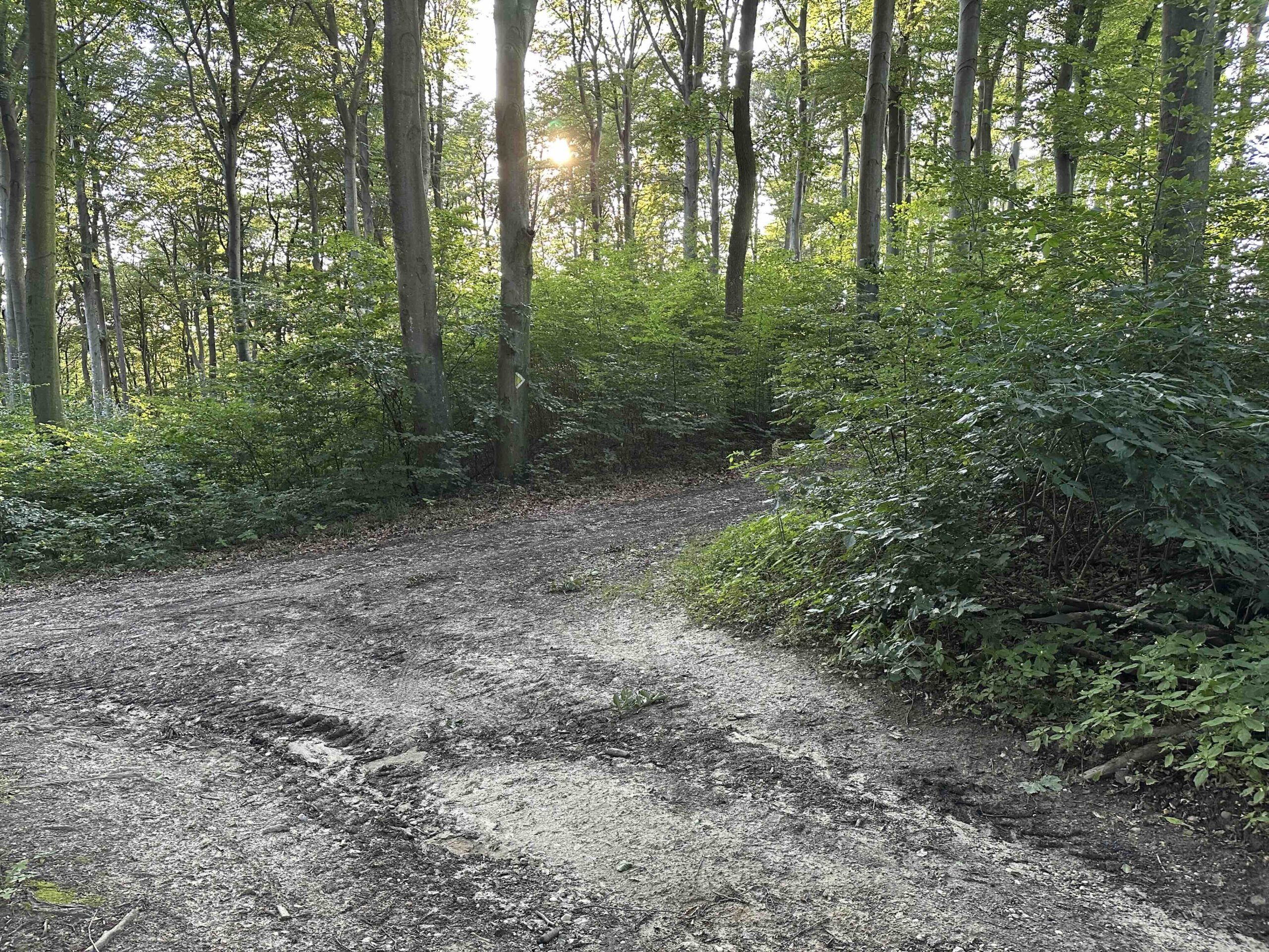 In der Kurve nach der Abzweigung zum Hängenden Stein, dem Wegknoten Hängender Stein, führt links eine Forststraße in den Wald. Dort geht nach wenigen Metern rechts und dann gleich links ein schmaler Pfad den Berg hinauf. Diesem folgt man bis er wieder auf die Forststraße trifft. Nun geht man weiter ein Stück auf der Forststraße bis in der ersten Linkskurve auf der rechten Seite, etwas versteckt, ein schmaler Pfad abzweigt.