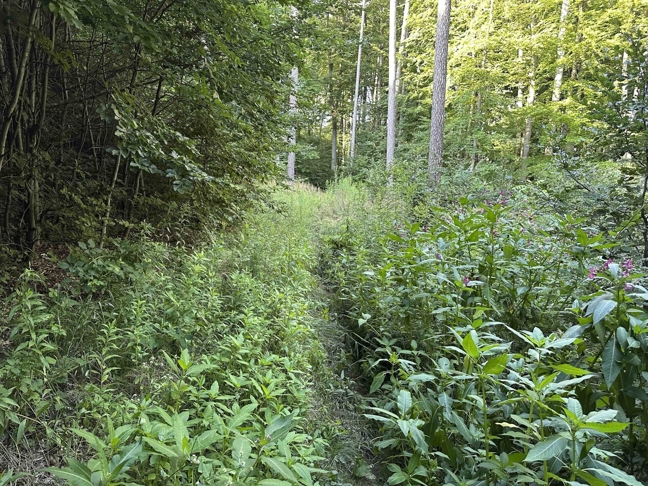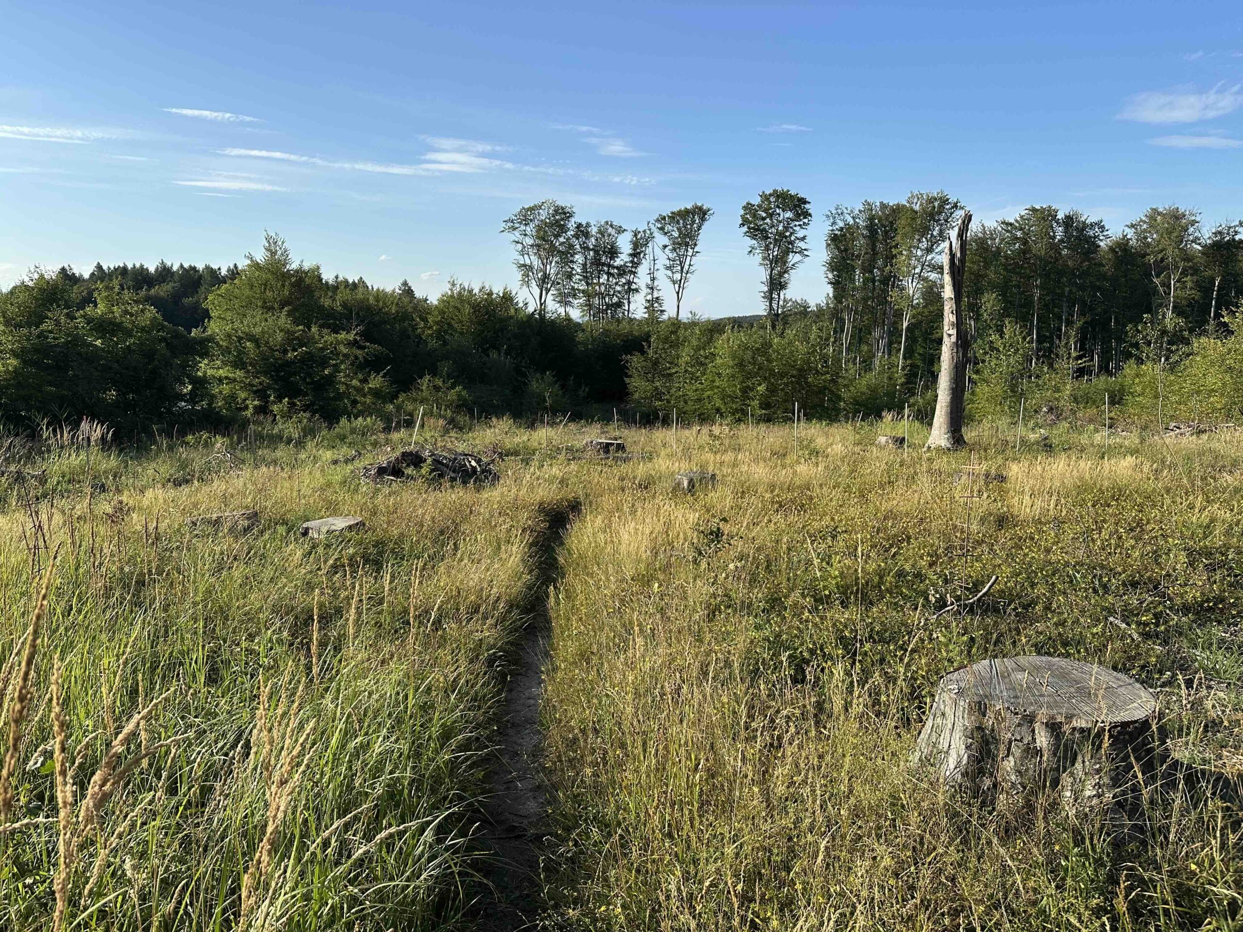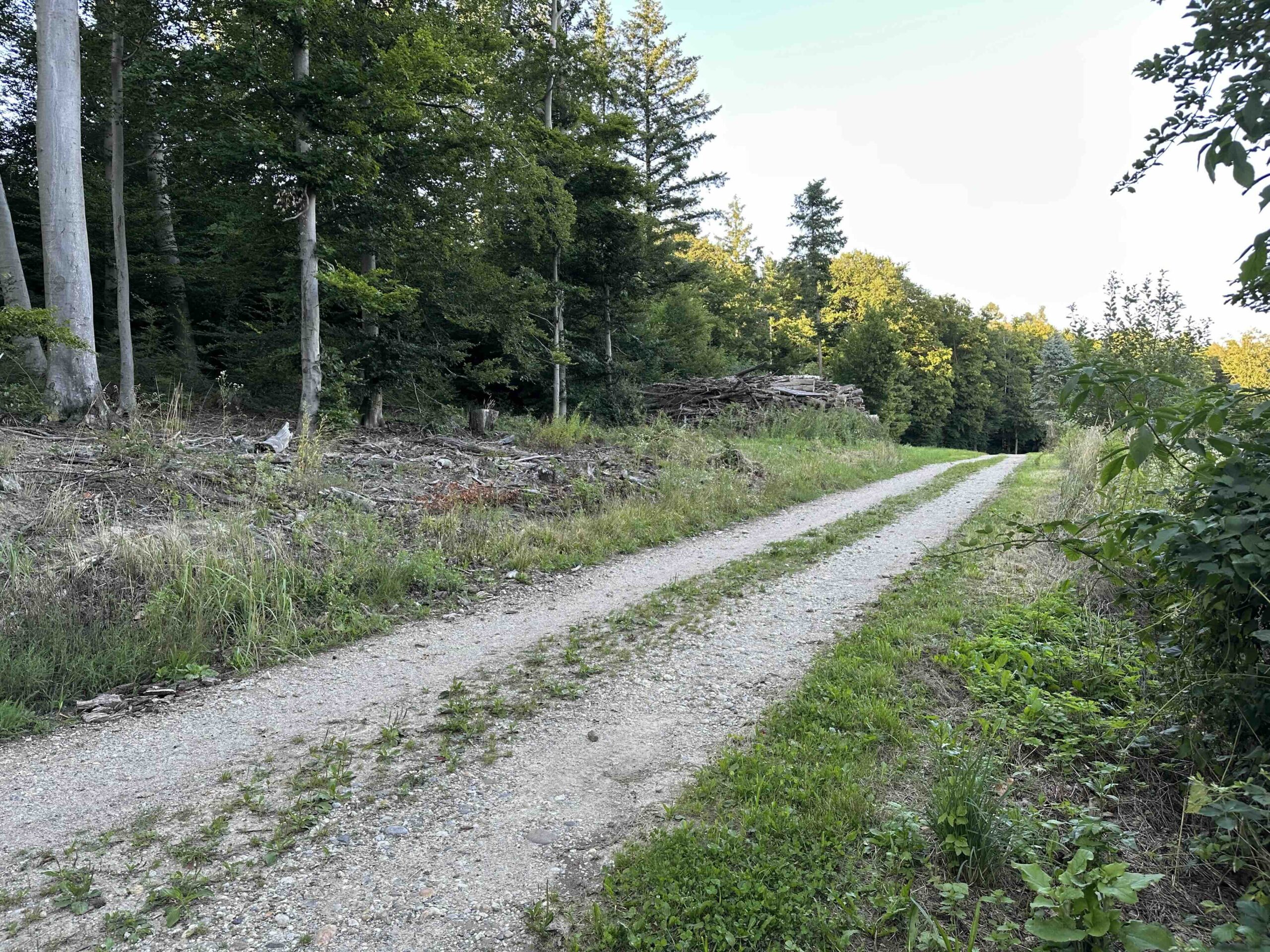 Der Pfad führt zu einem Schranken hinter dem ein Forstweg weiterführt. Am Ende des Wegs ist auf der rechten Seite ein Zaun und am Ende gibt es einen kleinen Abzweiger rechts hinauf zu einer breiten Forststraße. Dort hält man sich nochmals rechts und nach wenigen Metern ist man am Ziel, dem Wegknoten Karlholz.