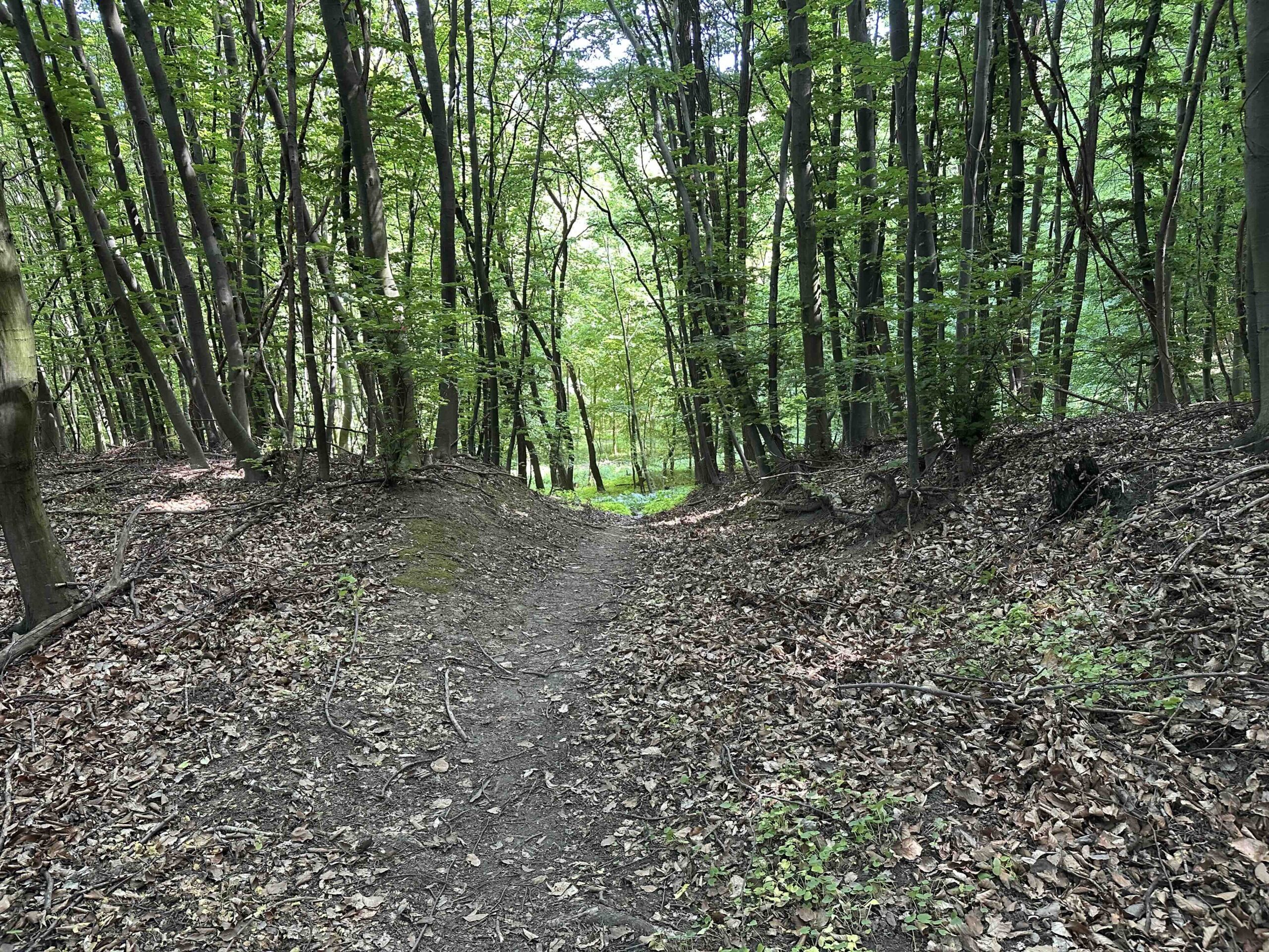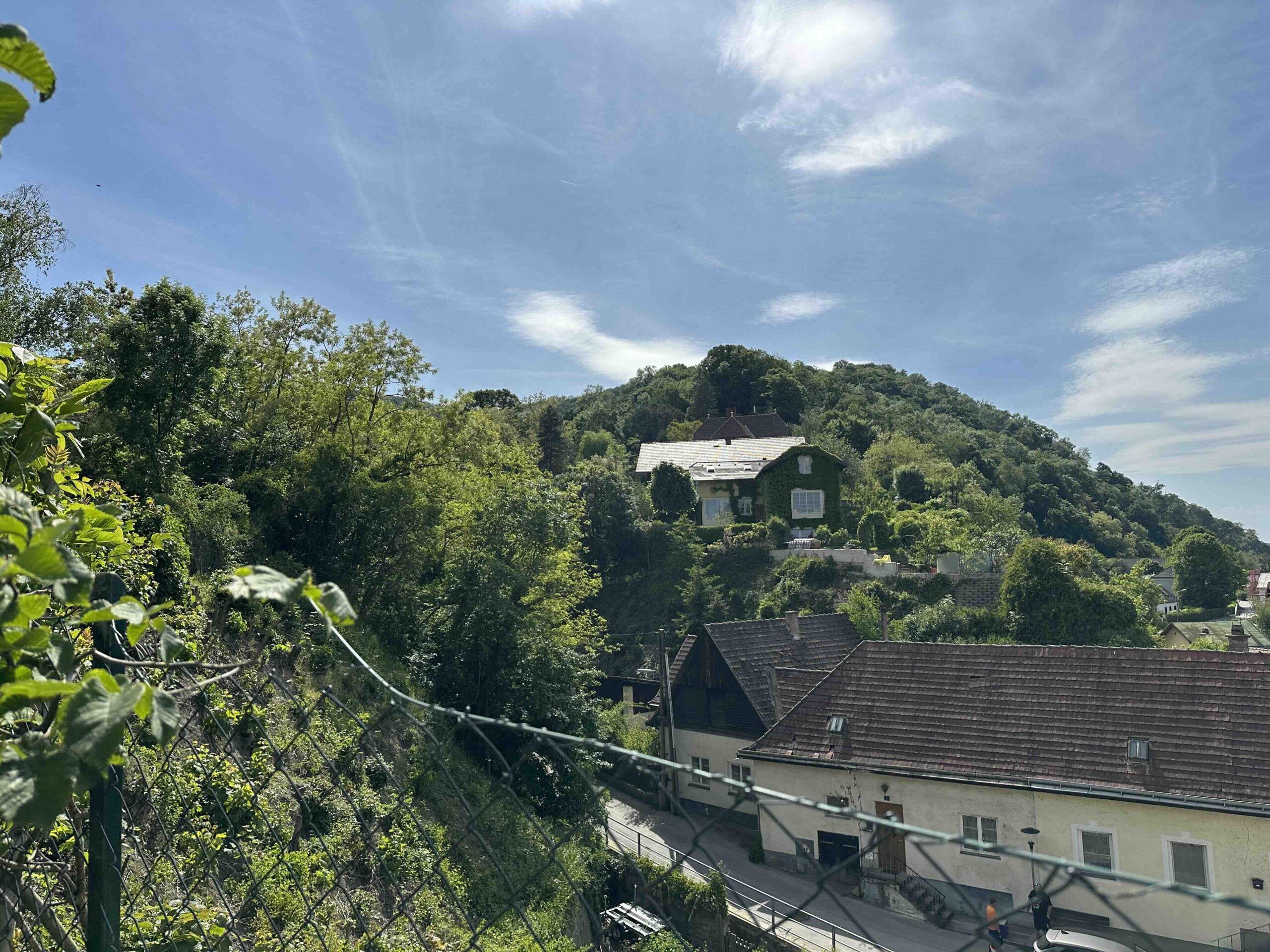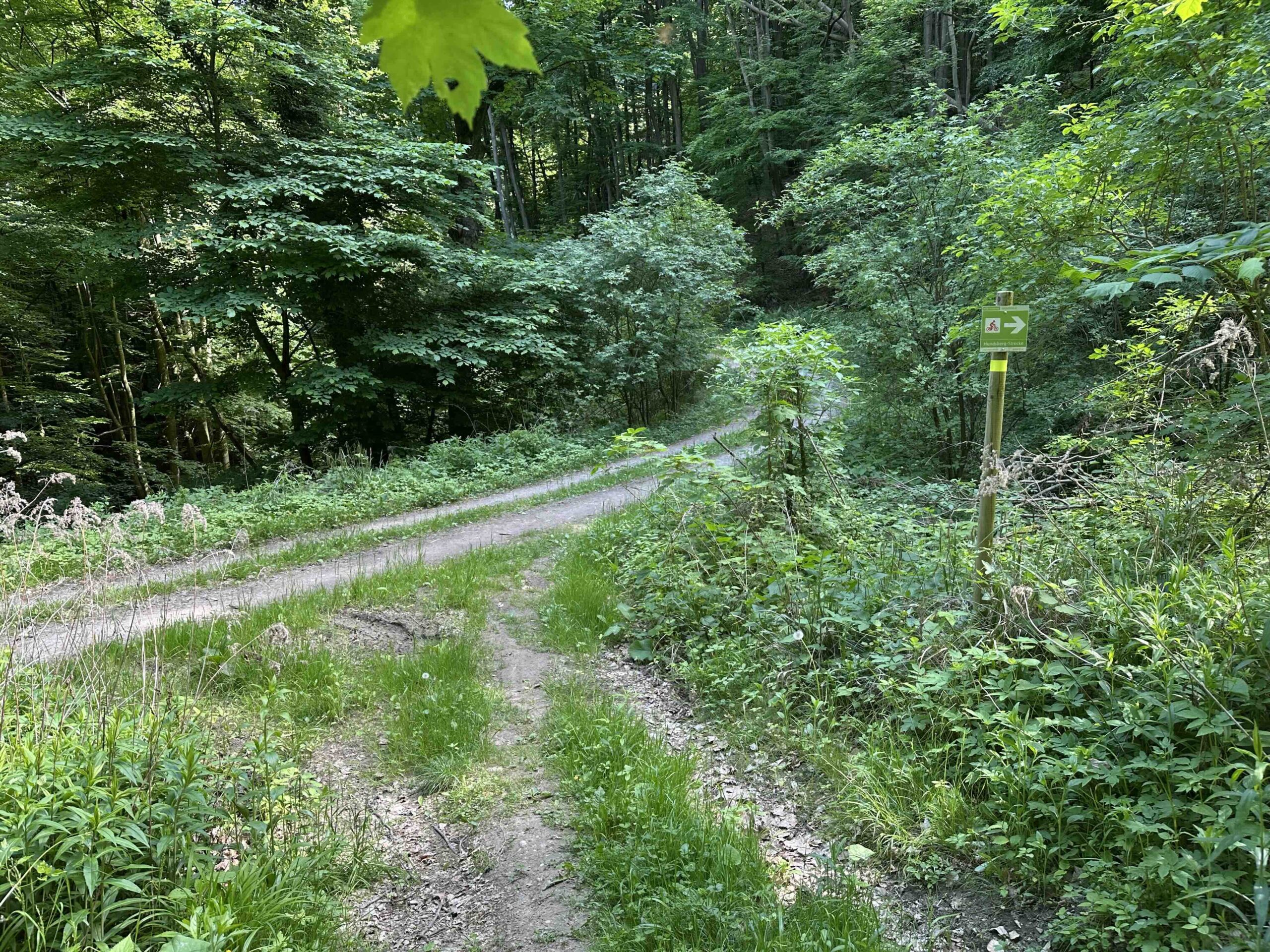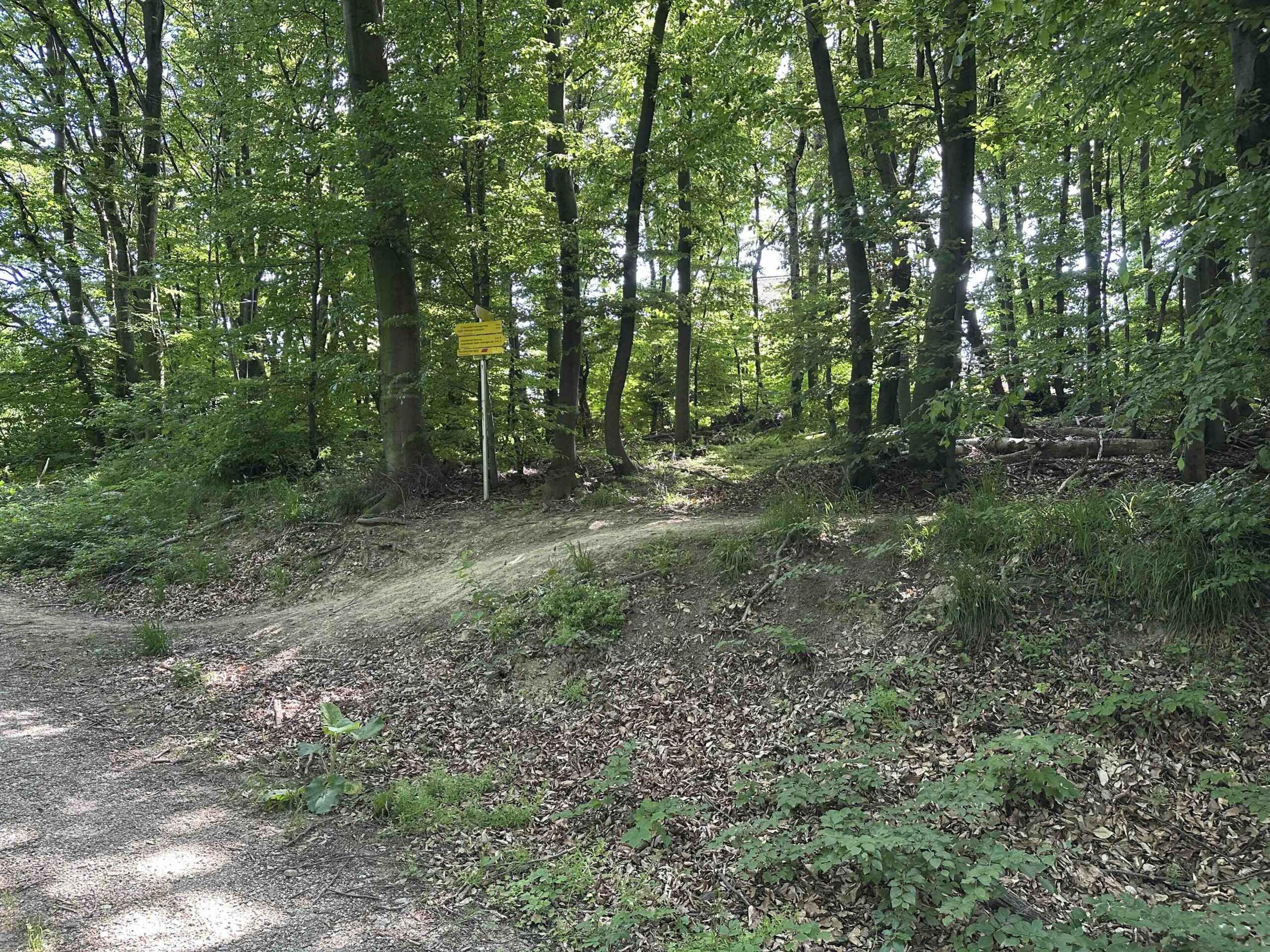 Man wendet sich rechts und folgt der Forststraße bis es bald darauf wieder steil links hinauf einen schmalen Pfad durch den Wald geht. Am Ende des Weges trifft man wieder auf die Forststraße von der man vorher abgezweigt ist und gleich danach befindet sich der Wegknoten Am Höfleiner Weg. Hier führt ein schmaler Weg zum grün markierten Burgweg nach Greifenstein.