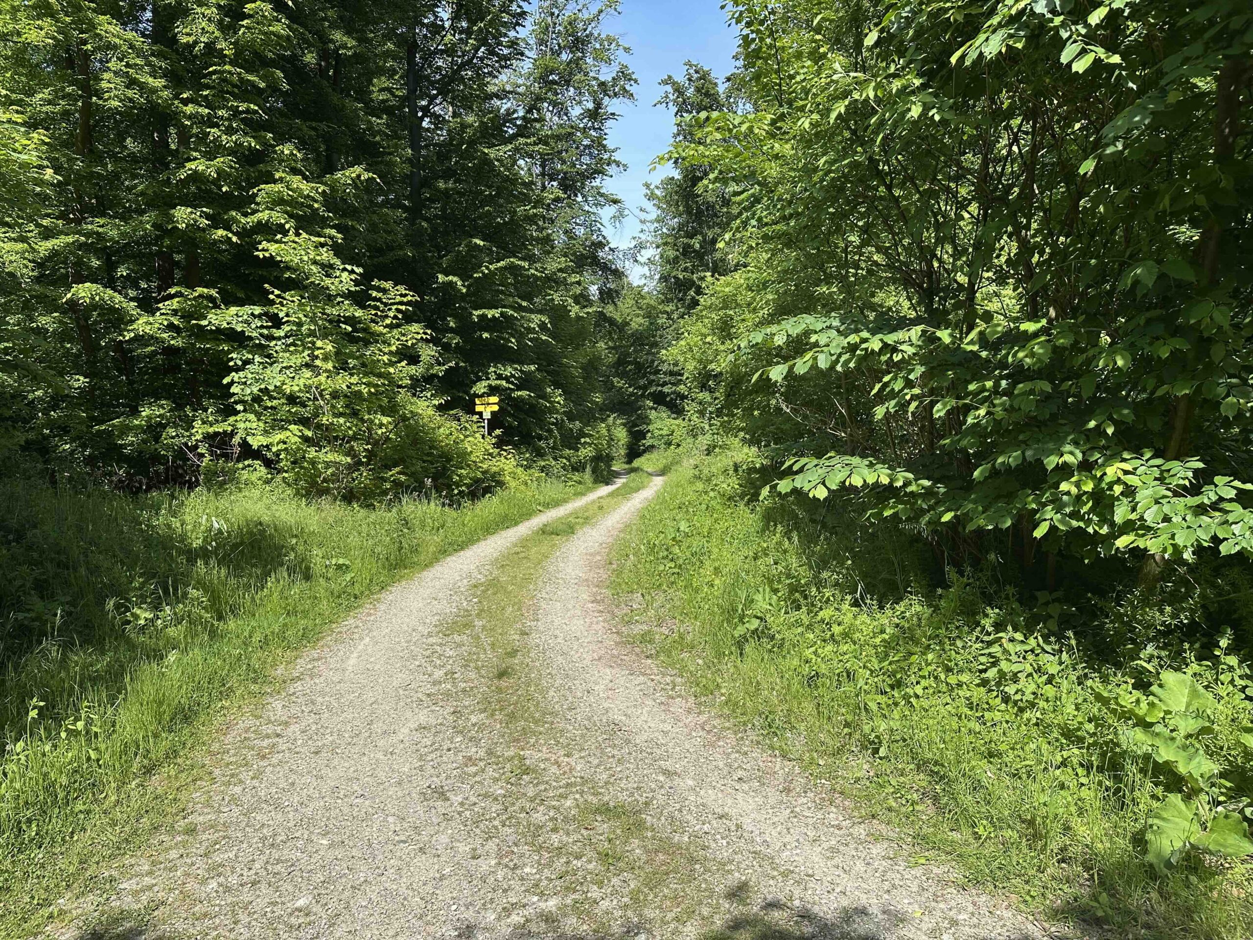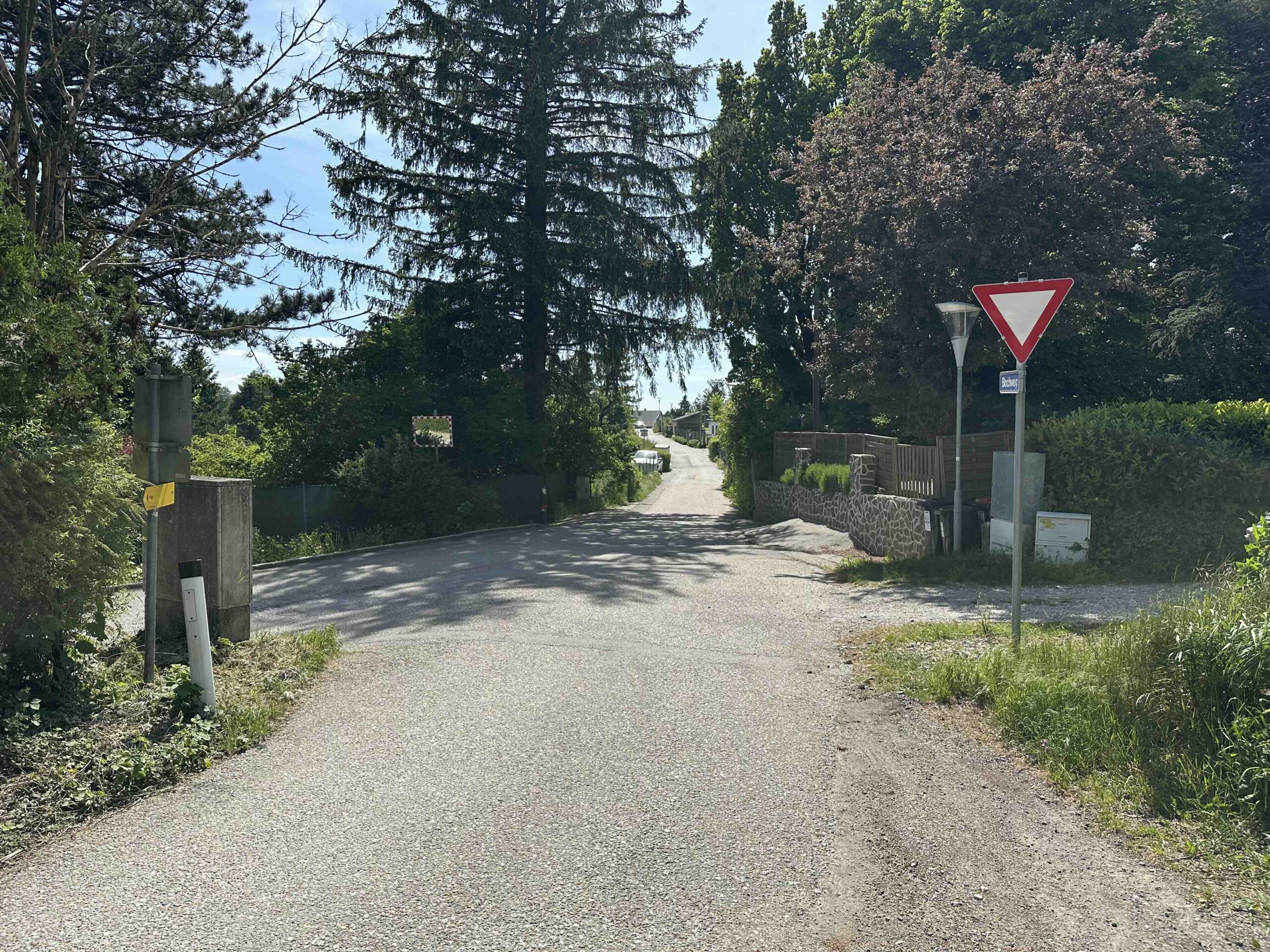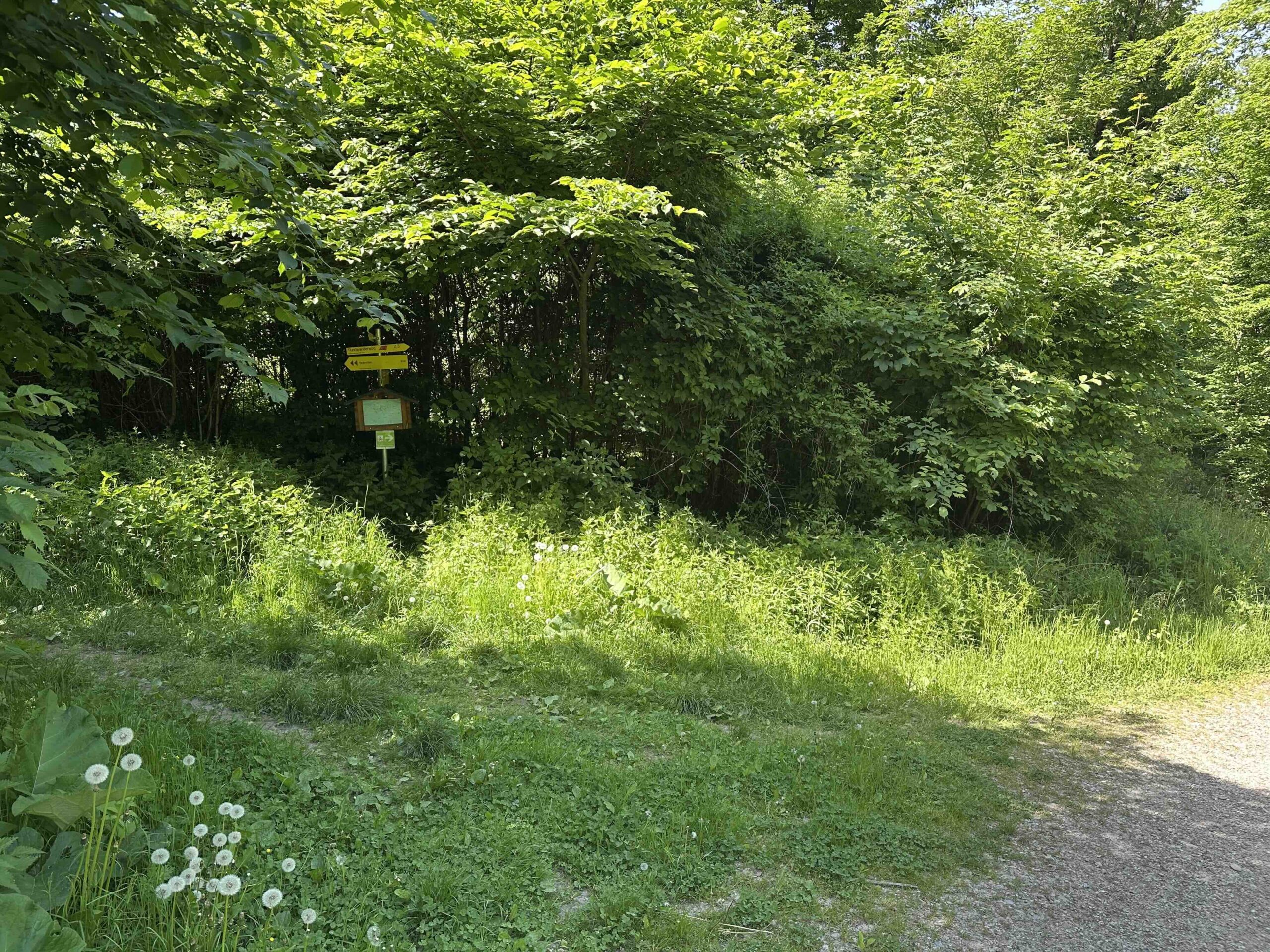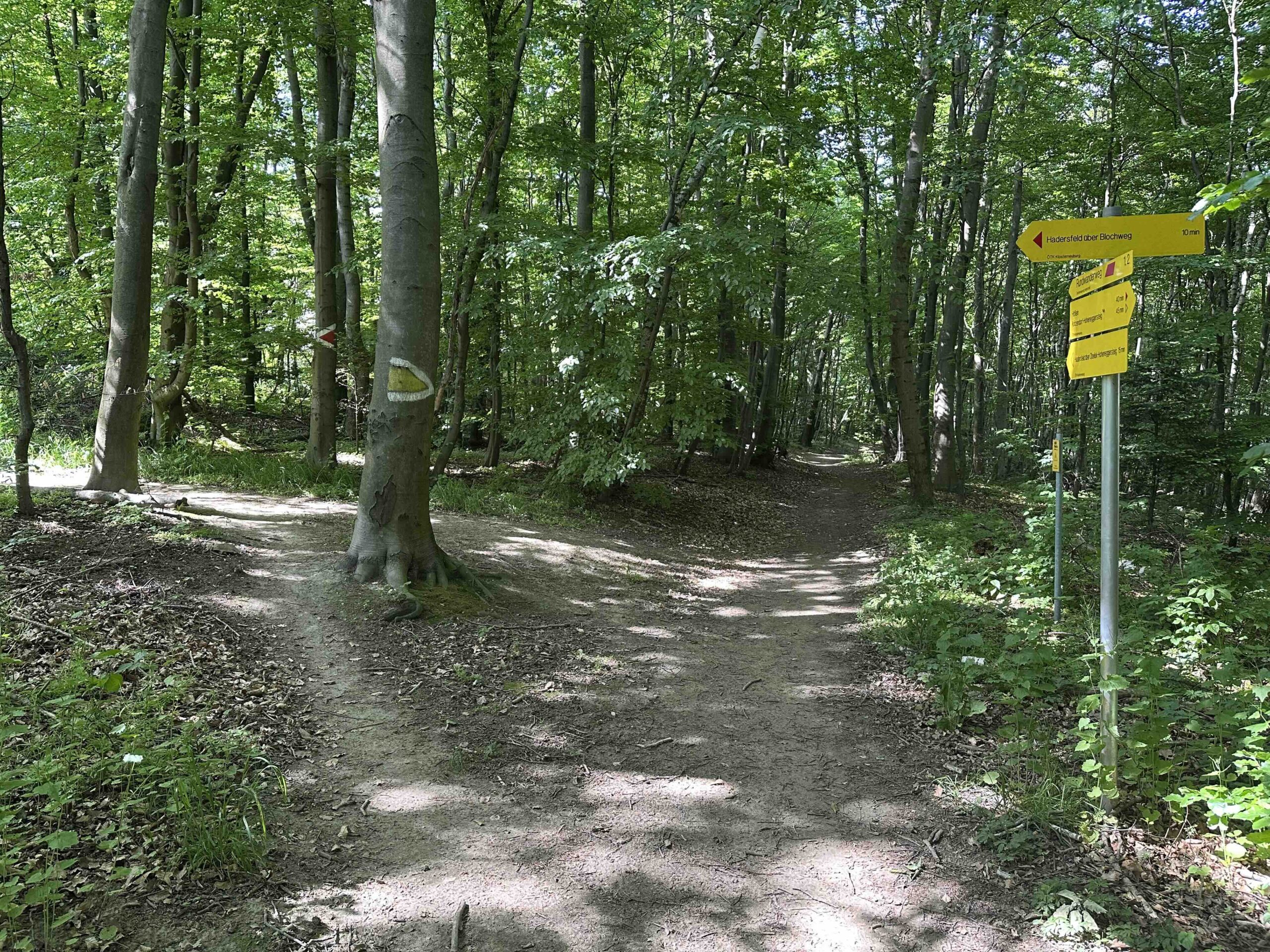 Man folgt hier weiter der breiten Forststraße bis zum Wegnkoten Am Anger. Hier geht es rechts einen kleinen Weg hinauf, der vorbei am Wegknoten Blochweg ans Ende des Blochwegs in Hadersfeld führt. Nun noch den Blochweg und weiter die Feldgasse (Wegknoten Hadersfeld/Feldgasse/Blochweg) bargab, bis zum Hadersfelder Glockenturm, dem Ziel dieses Weges.