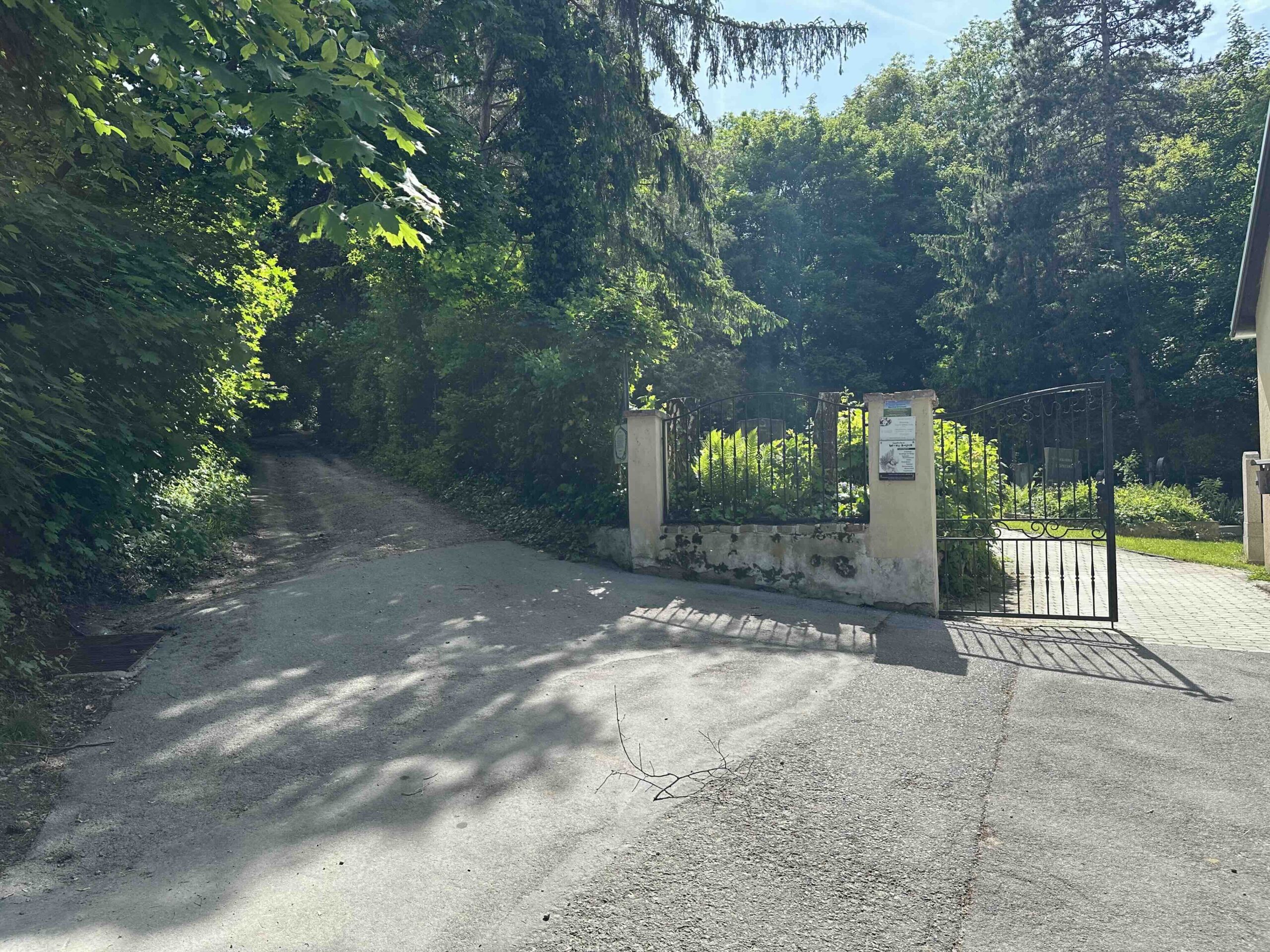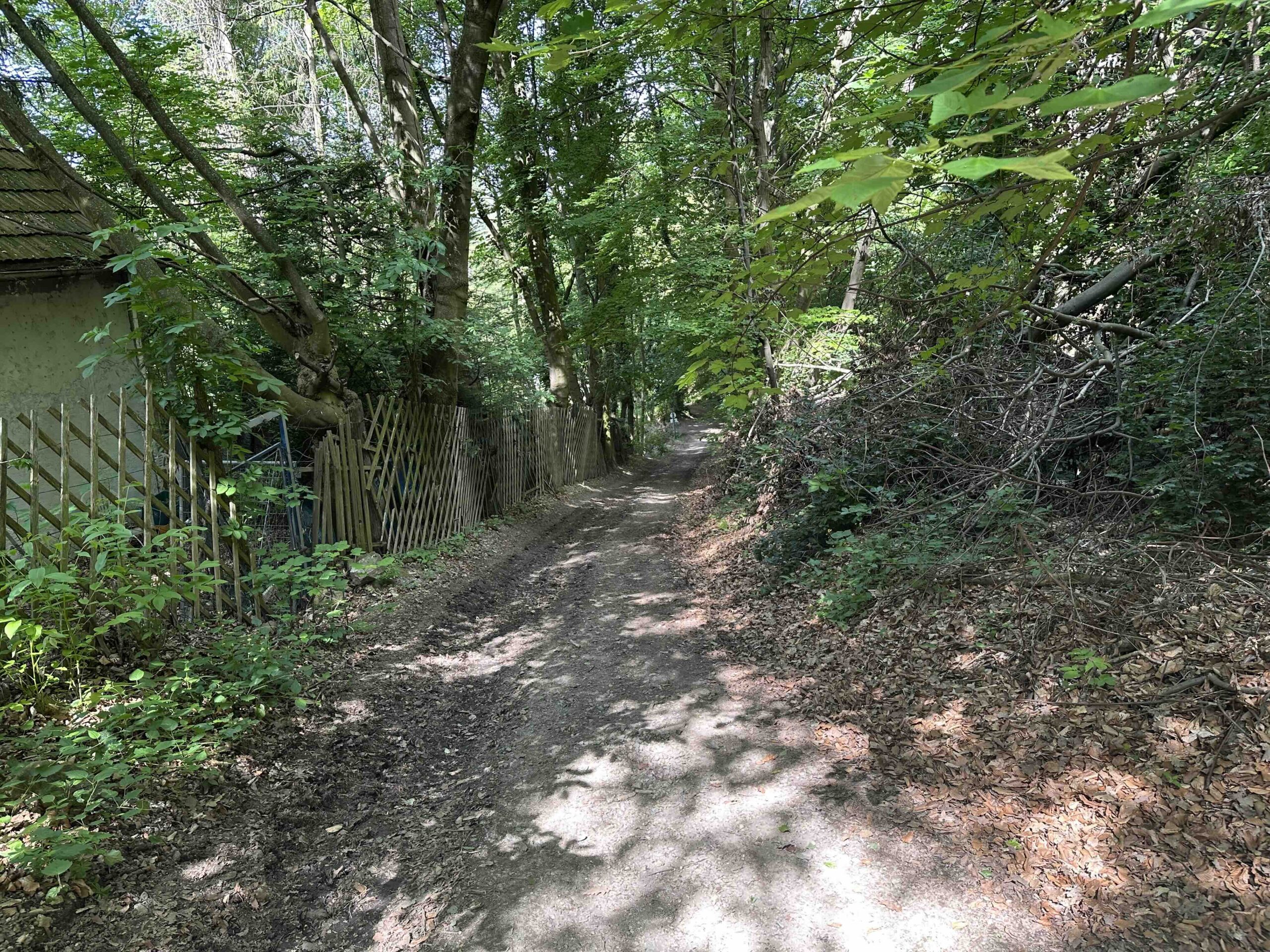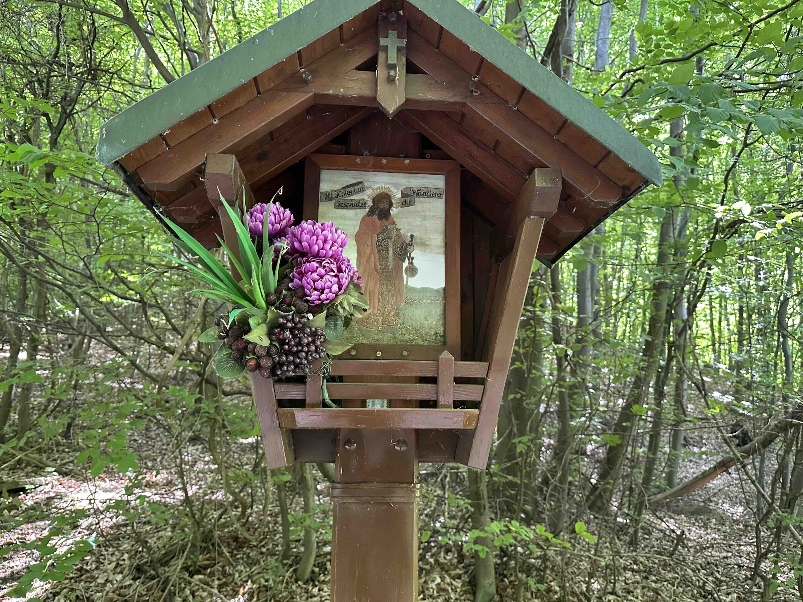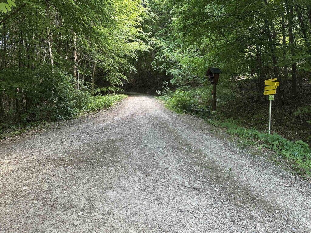 Weiter geht es die Schulgasse steil bergauf zum Friedhof. Hier endet die asphaltierte Gasse und es geht weiter einen steilen Hohlweg neben dem Friedhof hinauf. Nach dem Friedhof wird der Weg breiter und führt durch den Wald bis zum Wegknoten Heiliger Koloman mit einer breiten Forststraße. Hier mündet die grüne Markierung vom Weißen Kreuz ein.