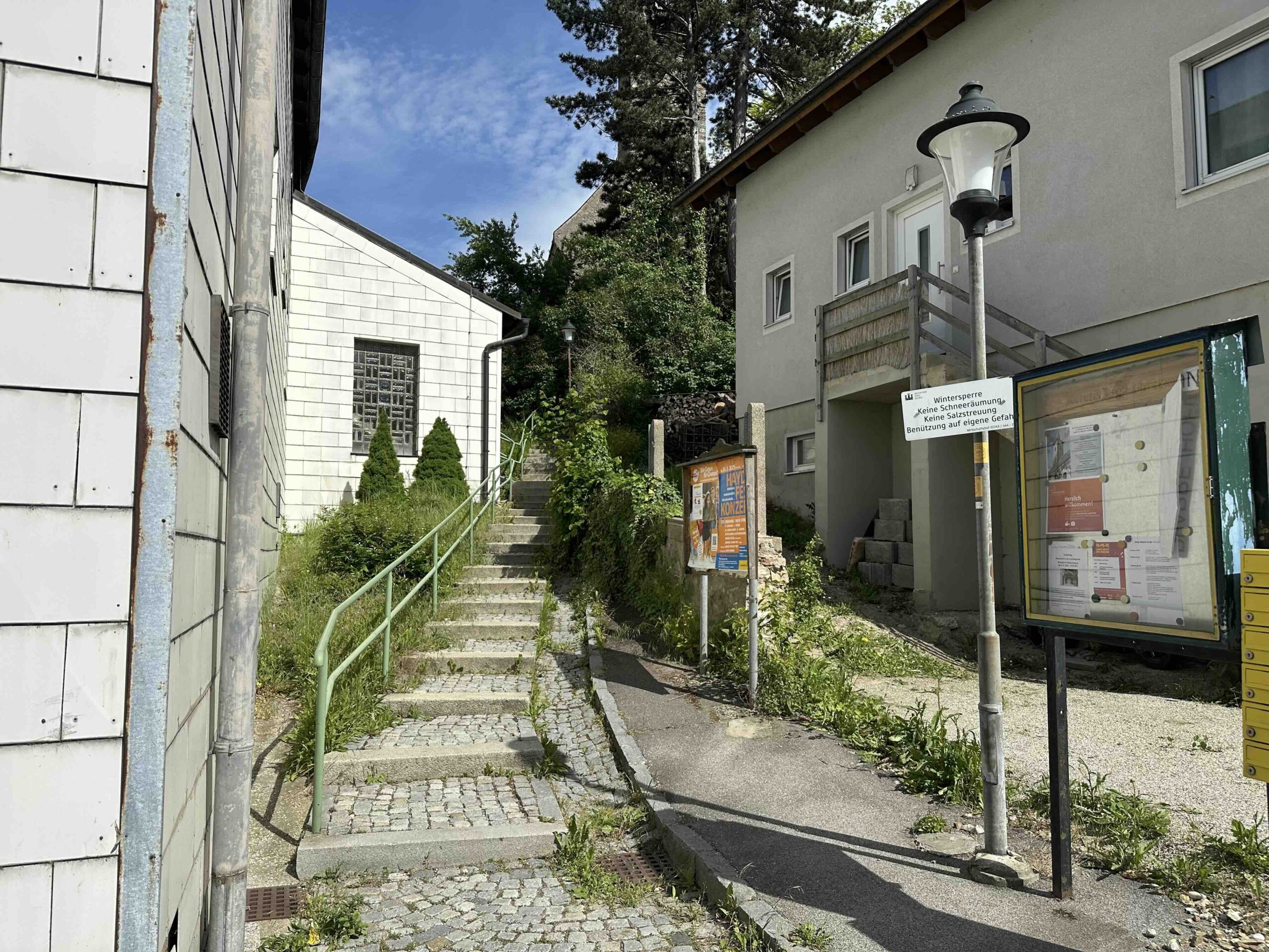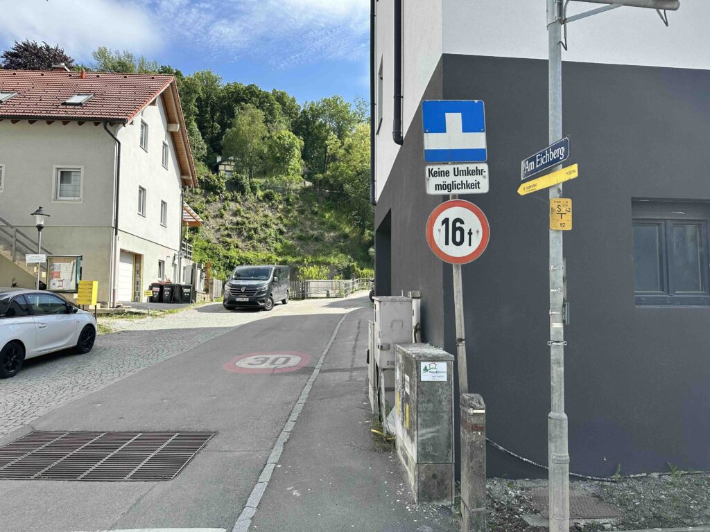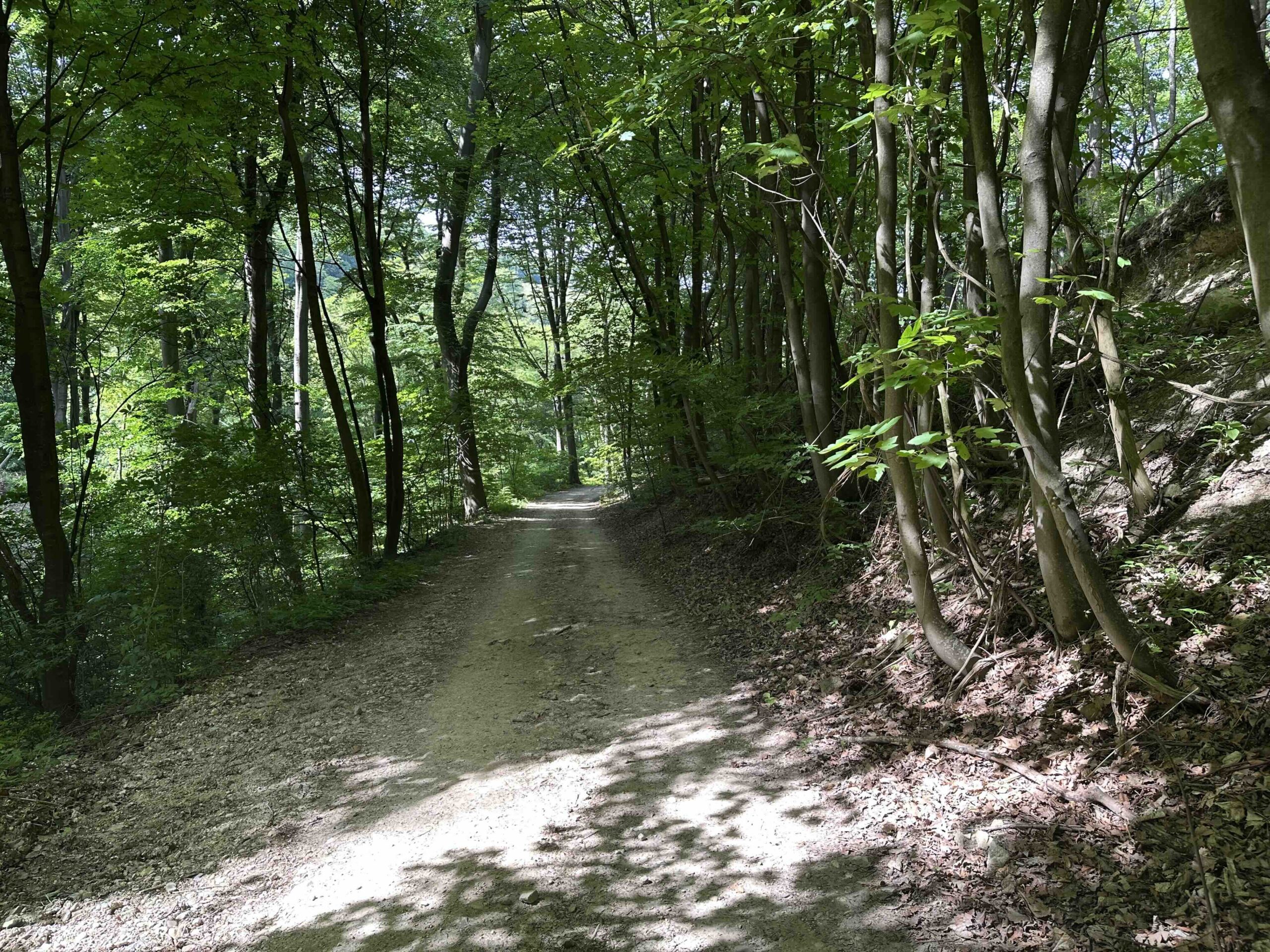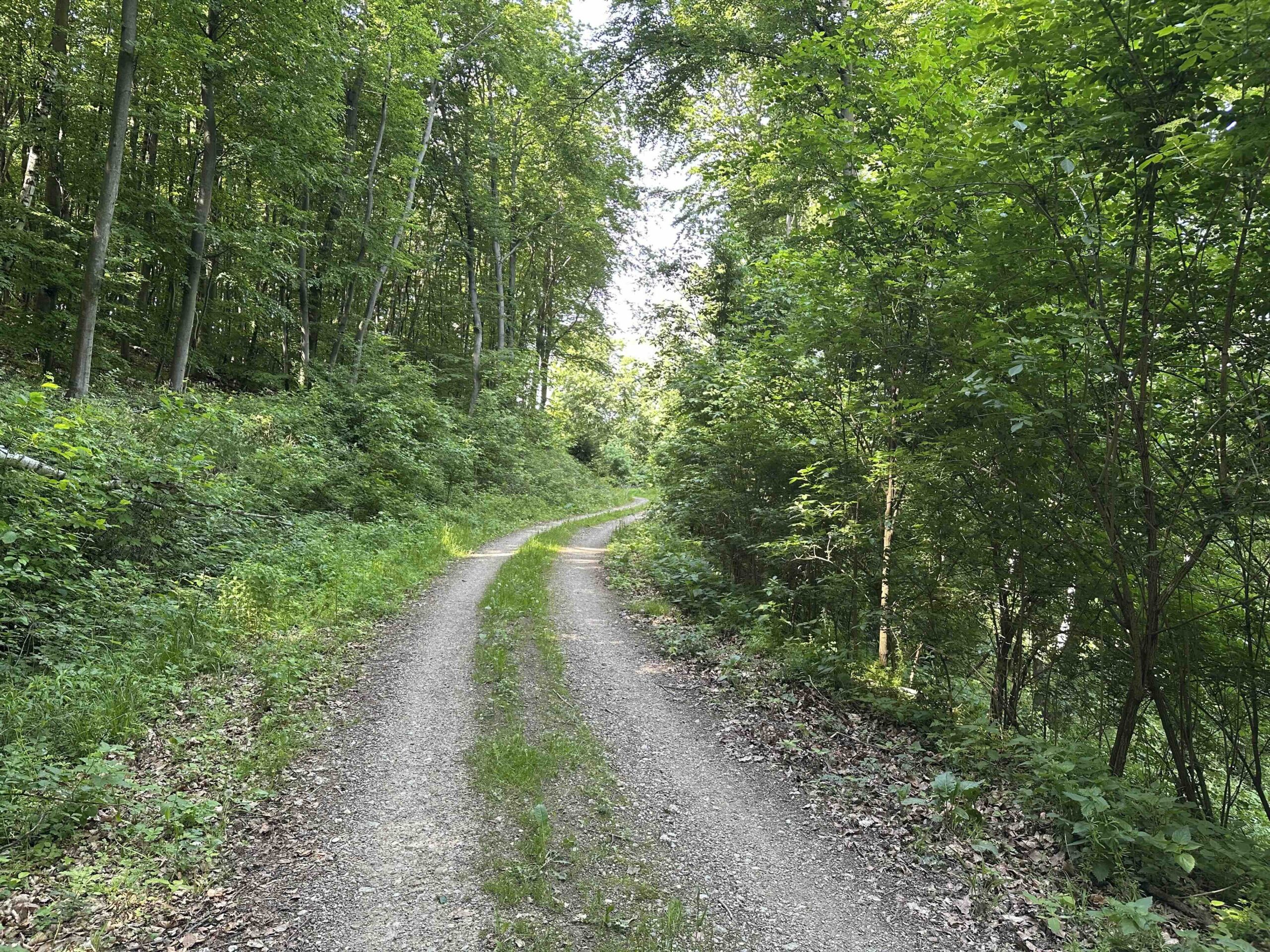 Weiter geht es die Schulgasse steil bergauf zum Friedhof. Hier endet die asphaltierte Gasse und es geht weiter einen steilen Hohlweg neben dem Friedhof hinauf. Nach dem Friedhof wird der Weg breiter und führt durch den Wald bis zum Wegknoten Heiliger Koloman mit einer breiten Forststraße. Hier mündet die grüne Markierung vom Weißen Kreuz ein.