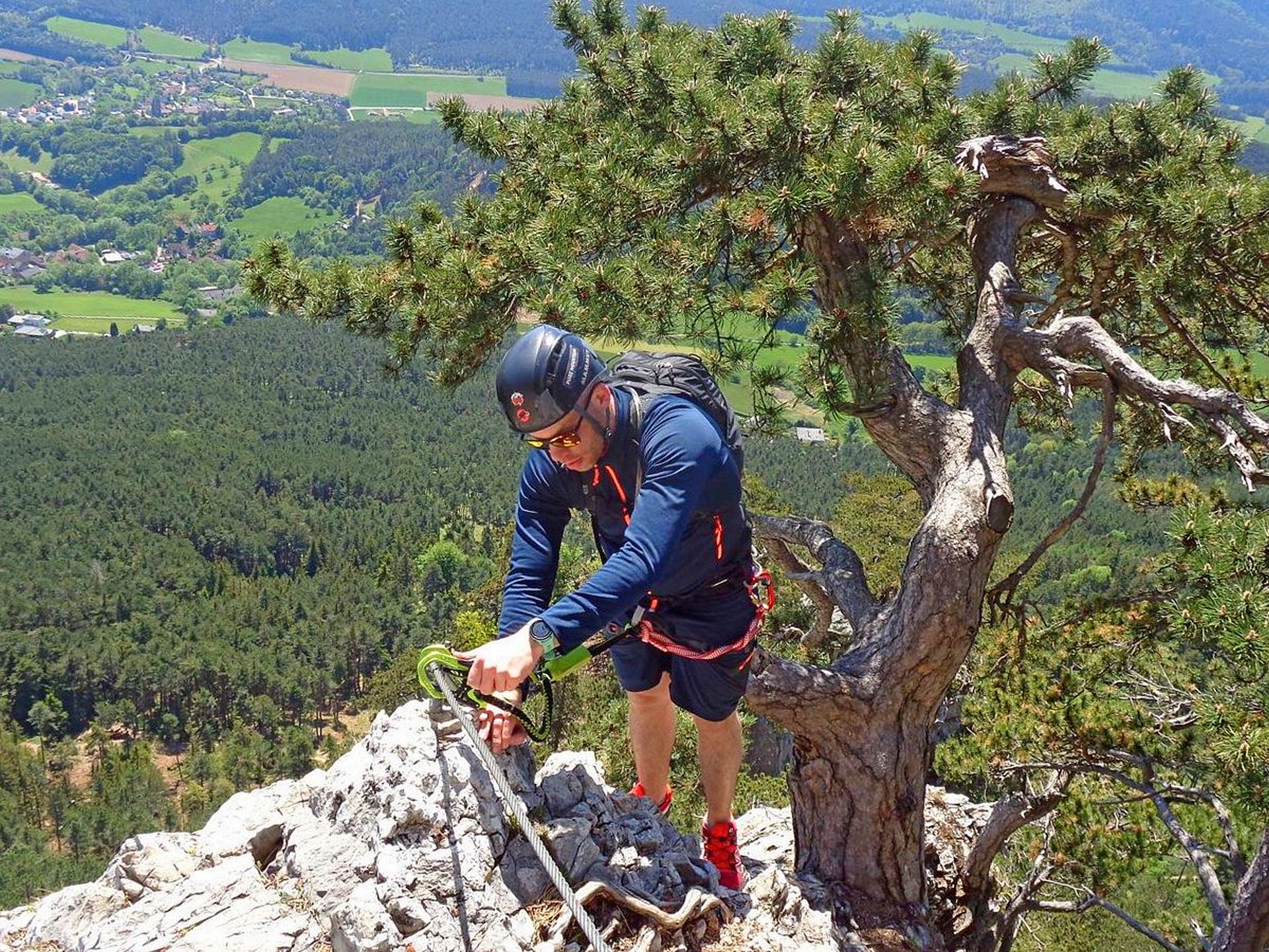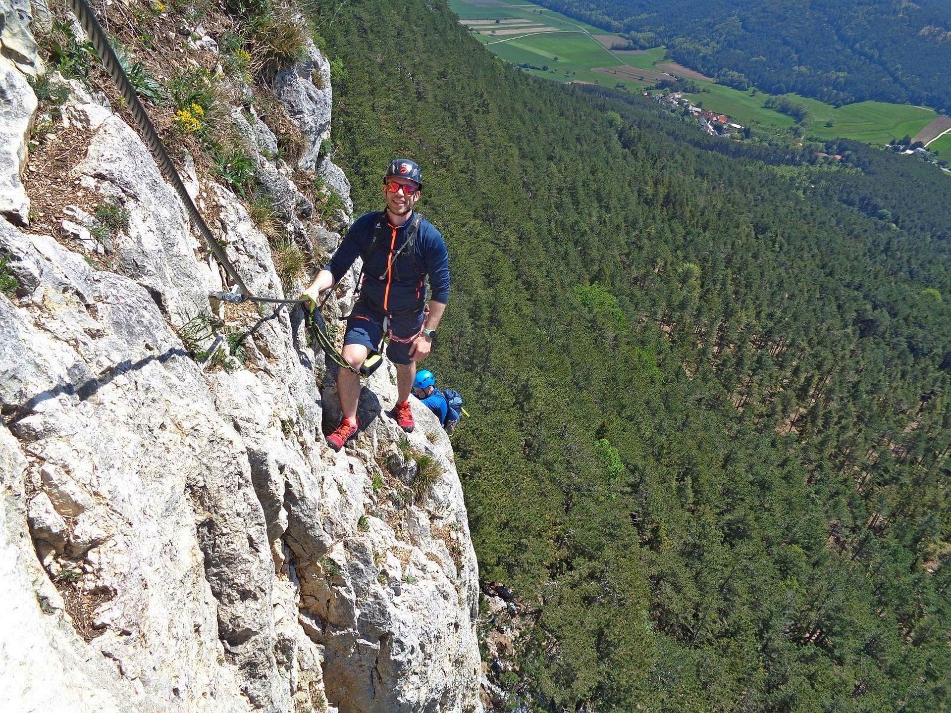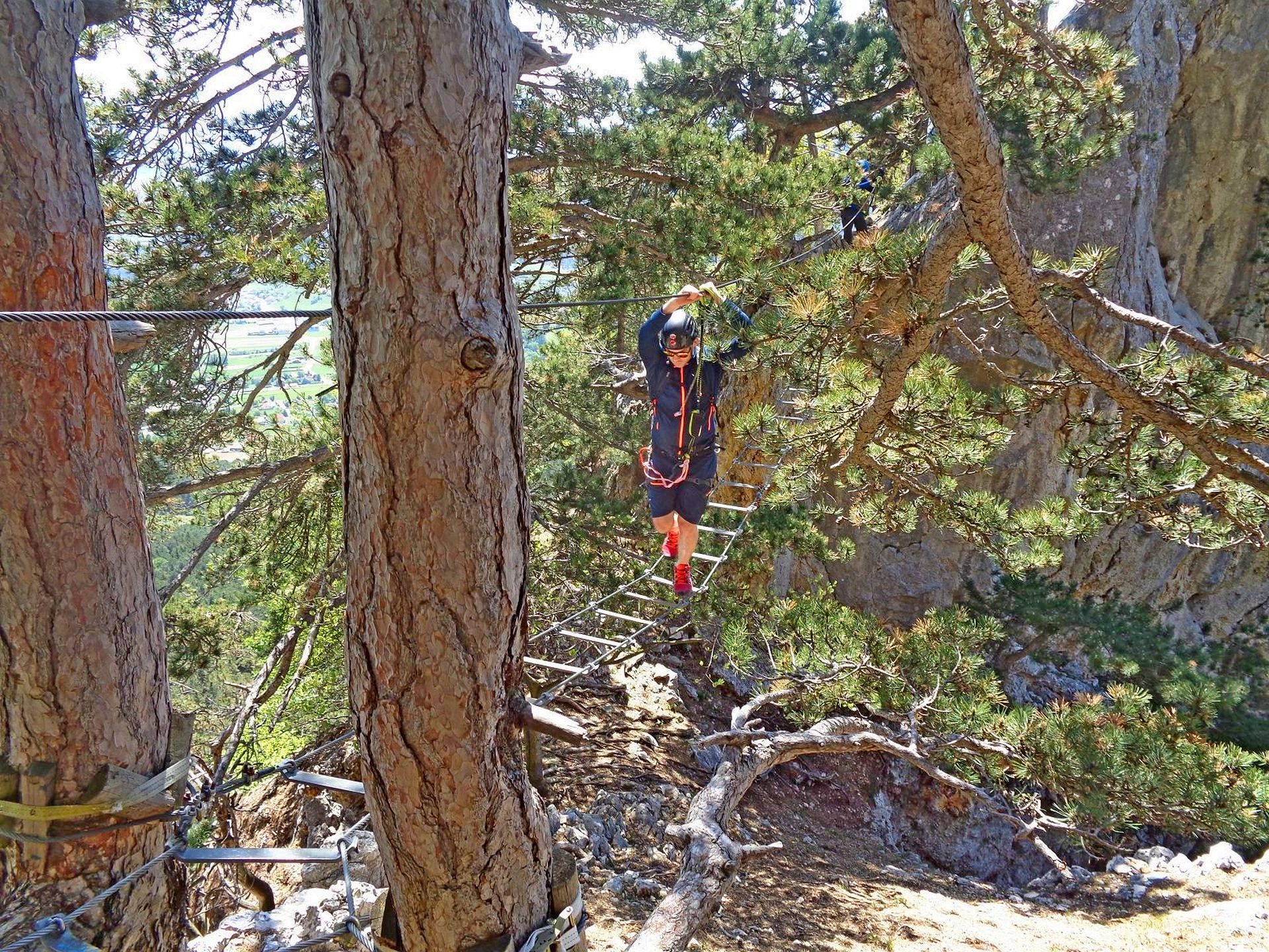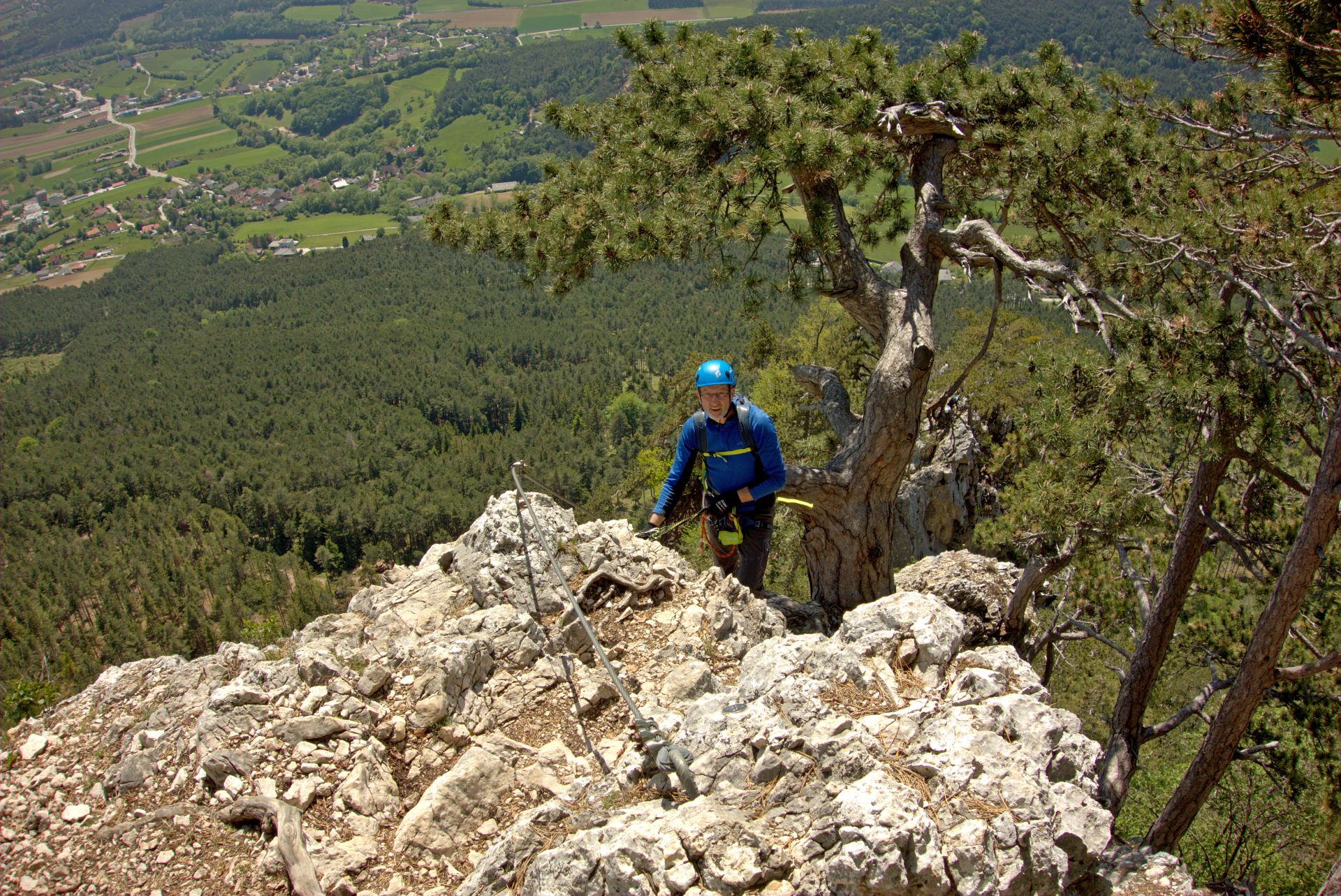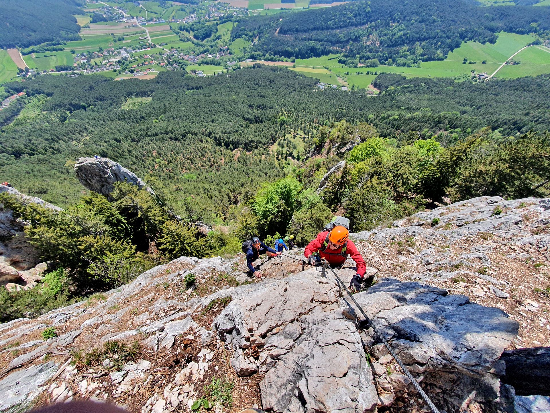 Mit der Bahn gelangten wir gemütlich nach Grünbach um von hier weg in ziemlich genau einer Stunde zum Einstieg dieses C/D Klettersteigs aufzusteigen. Ungewöhnlich für einen Samstagvormittag im Mai waren wir dann beinahe alleine am Steig unterwegs, was uns ein genussvolles, zügiges Durchsteigen erlaubte 🙂