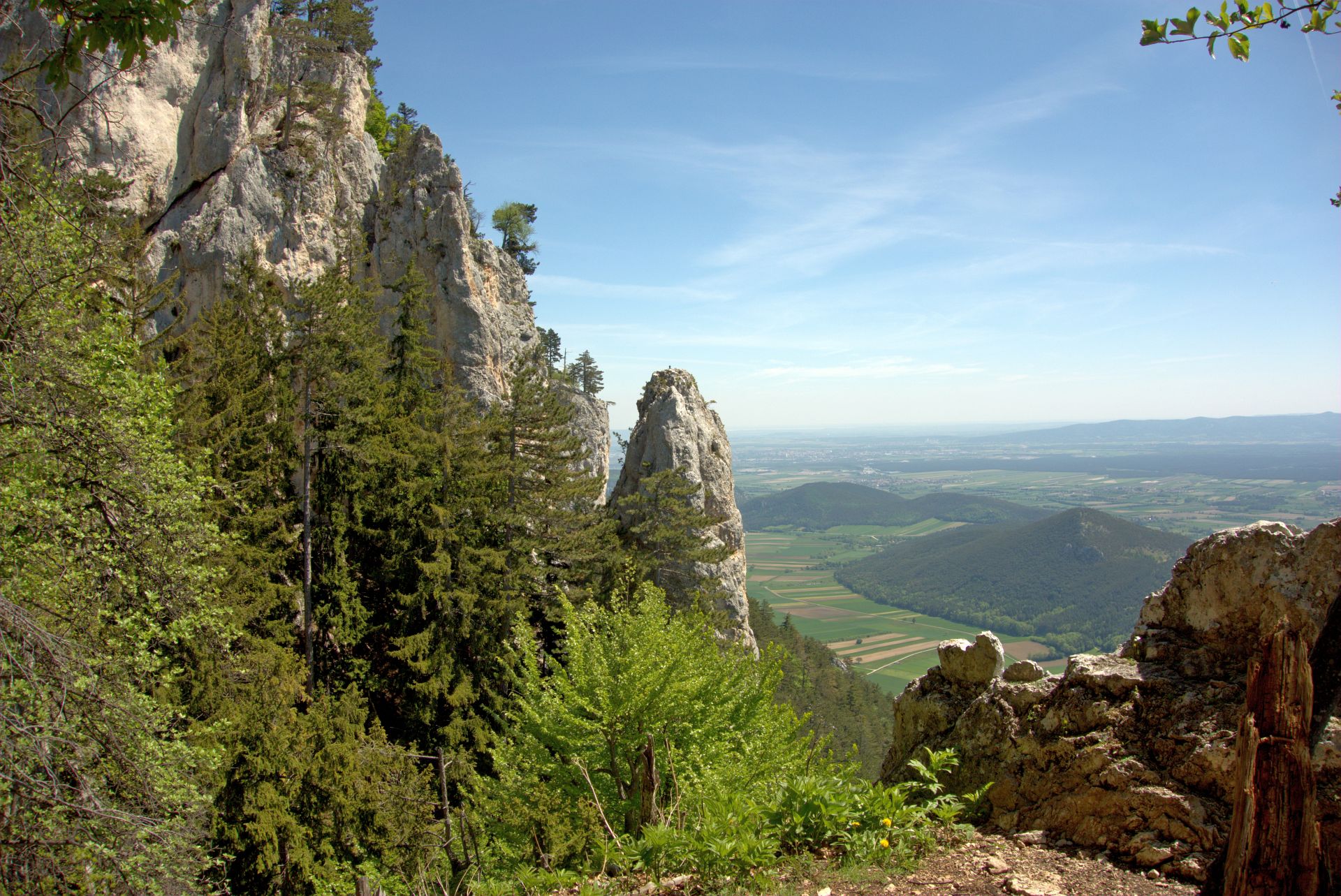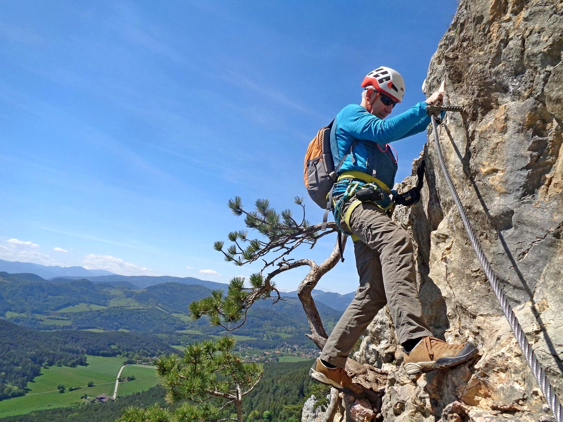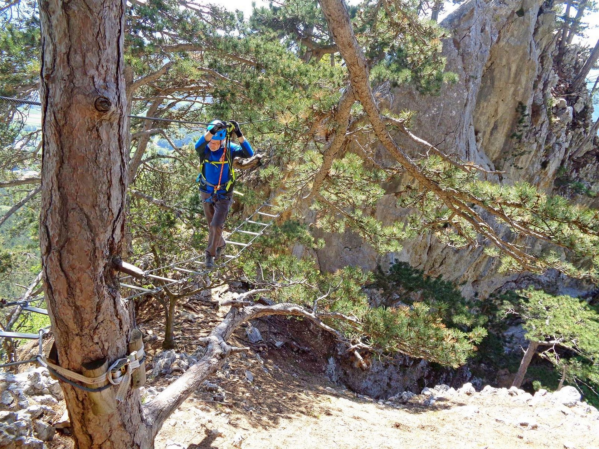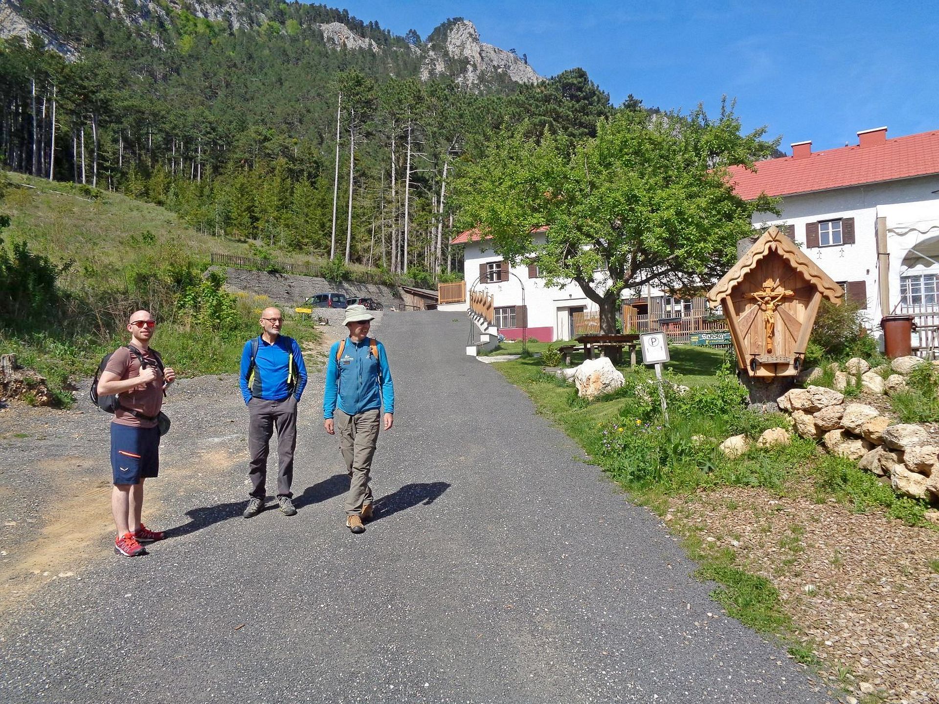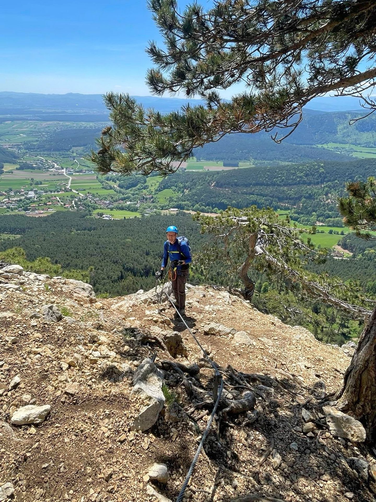Mit der Bahn gelangten wir gemütlich nach Grünbach um von hier weg in ziemlich genau einer Stunde zum Einstieg dieses C/D Klettersteigs aufzusteigen. Ungewöhnlich für einen Samstagvormittag im Mai waren wir dann beinahe alleine am Steig unterwegs, was uns ein genussvolles, zügiges Durchsteigen erlaubte 🙂