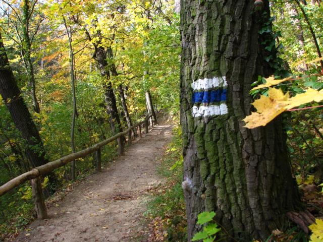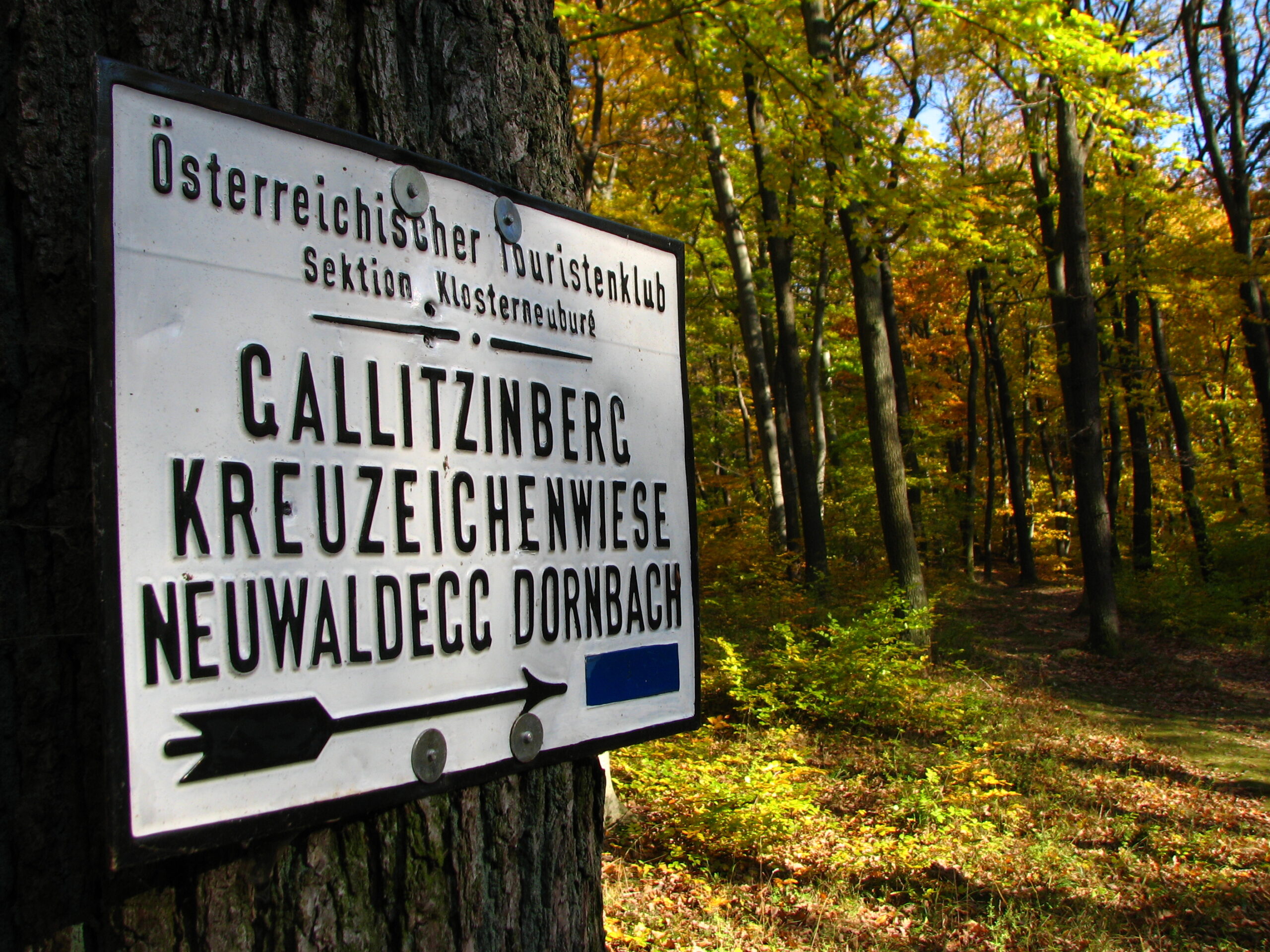 Die blaue Markierung führt über die Straßenbrücke und steigt dann durch den lichten Eichenwald bis zum Parkplatz am Gallitzinberg an. Der Gallitzinberg – oder auch Wilhelminenberg genannt – ist der Hausberg von Ottakring. Er ist ein „Vorgipfel“ jenes namenlosen Berges, auf dem die Jubiläumswarte (449 m) steht. Den Parkplatz querend und dann entlang des eingezäunten Grundstückes des Forschungsinstitutes für Wildtierkunde und Ökologie führt der Weg am unscheinbaren Gipfel des Gallitzinberges vorbei, steigt nochmals kräftig an und erreicht schließlich die Kreuzeichenwiese. Die Kreuzeichenwiese ist eine beliebtes Naherholungsgebiet im Einzugsbereich der Stadt und ein zentraler Wegknotenpunkt.