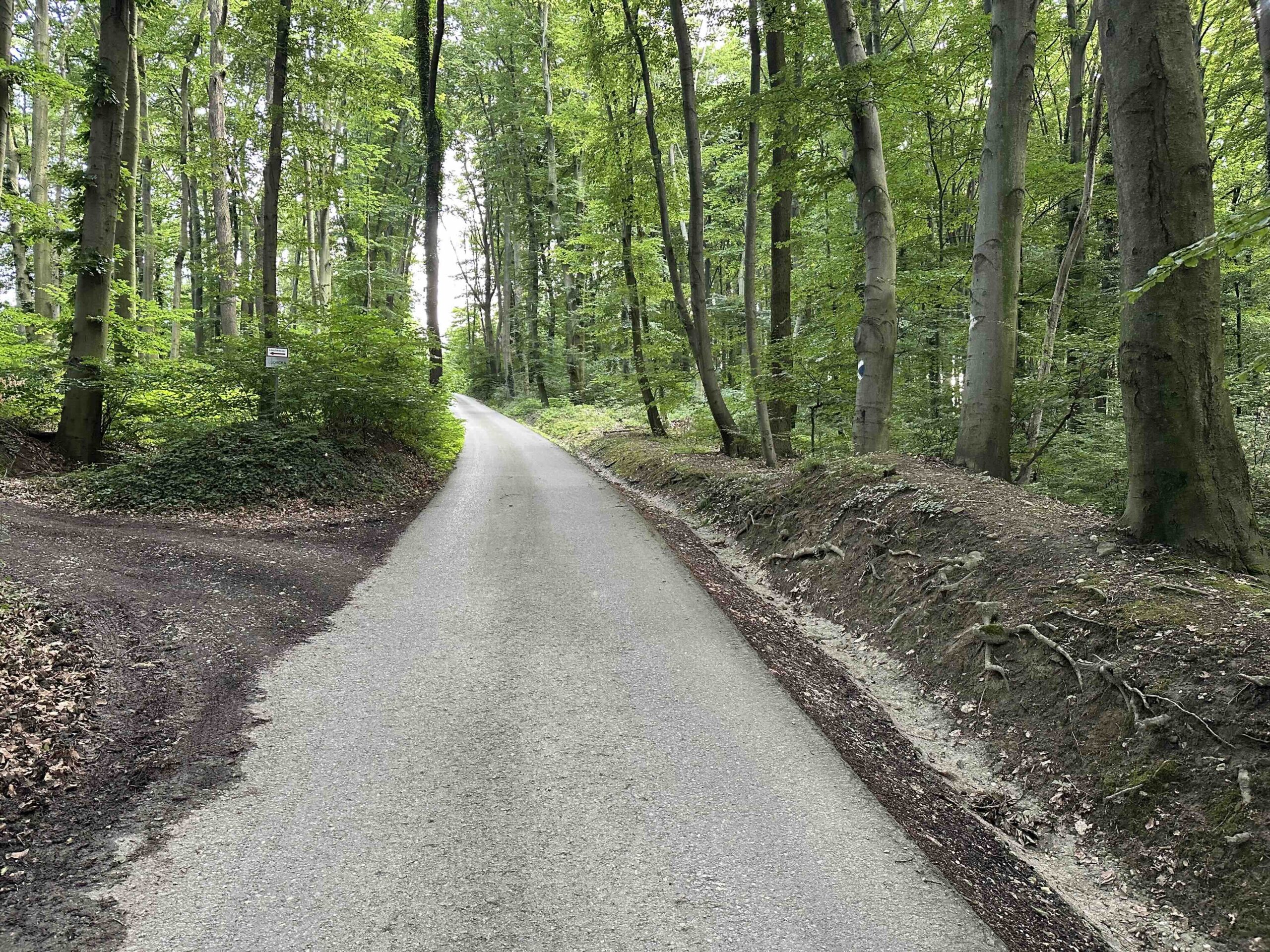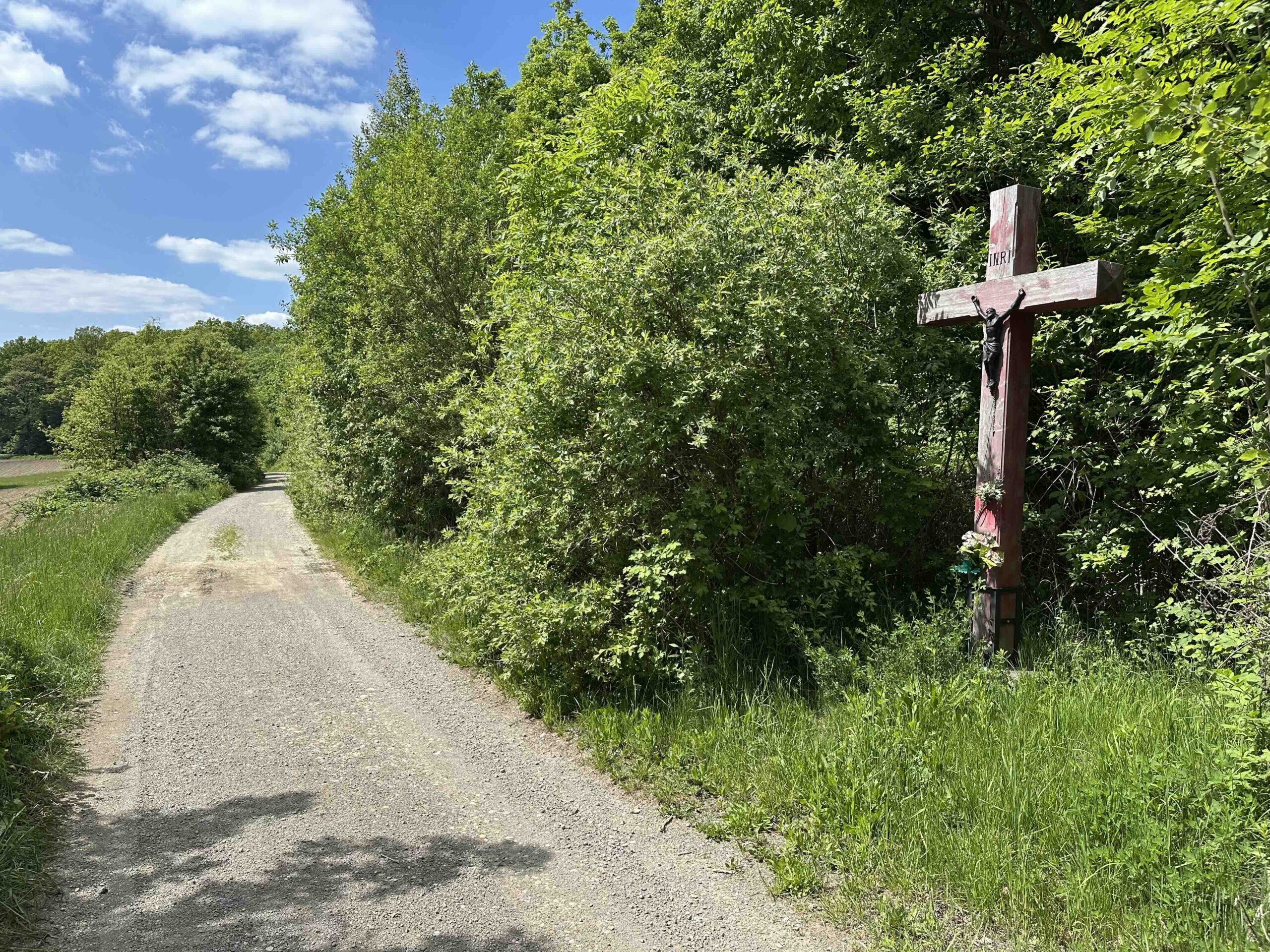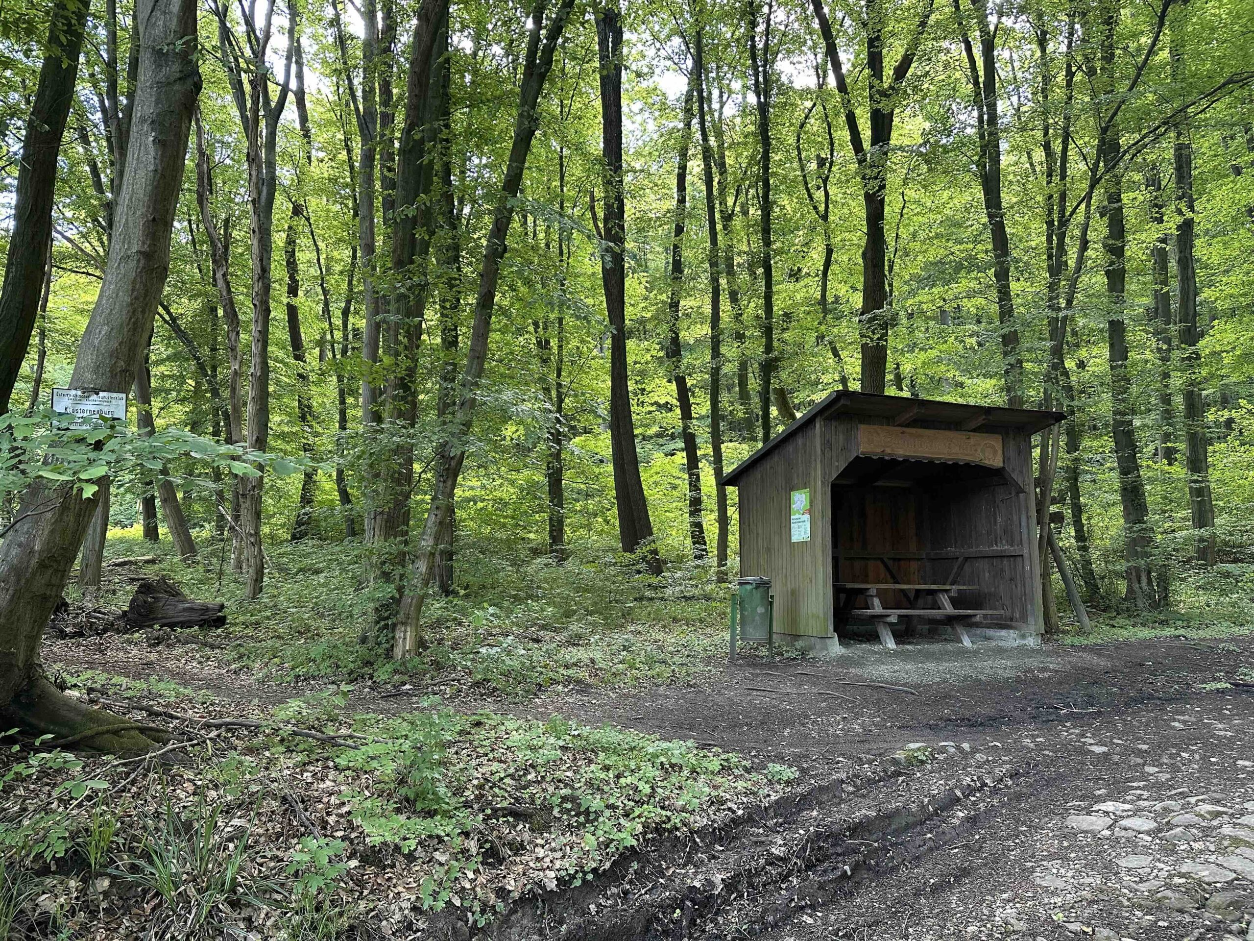 Hier trifft man auf den grün markierten Weg aus Klosterneuburg und biegt rechts ab, an der Steinböck Hütte vorbei, und kommt gleich danach auf eine Kreuung mit einer breiten Forststraße, der man geradeaus, leicht bergan, durch den Wald folgt. Zuerst gilt es einen kleinen Anstieg zu bewältigen, bevor man beim Roten Kreuz auf den Eichenhain trifft. Von nun wandert man entlang dem Waldrand mit Blick über Felder und Wiesen in Richtung Exelberg. In der Mitte befindet sich ein kleiner Bauernhof und davor eine über 300 jährige Stieleiche, die Mutter des Wienerwalds.