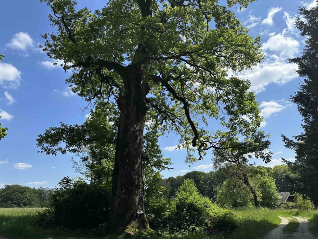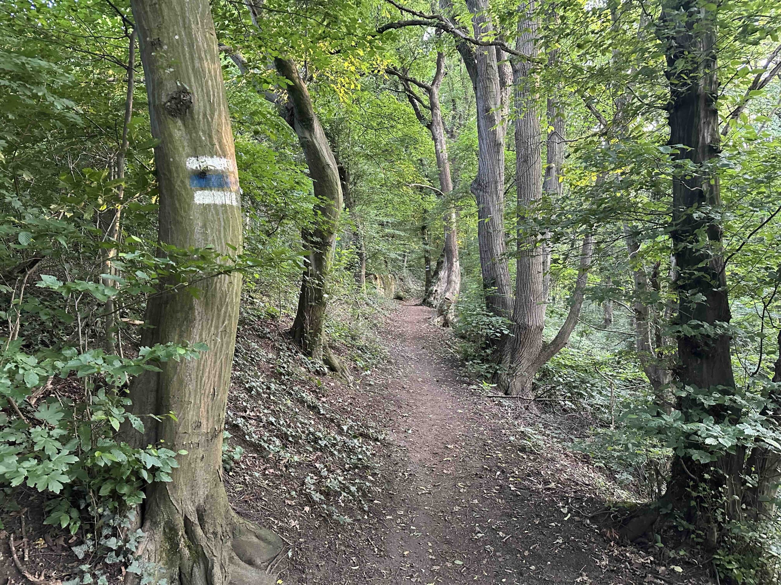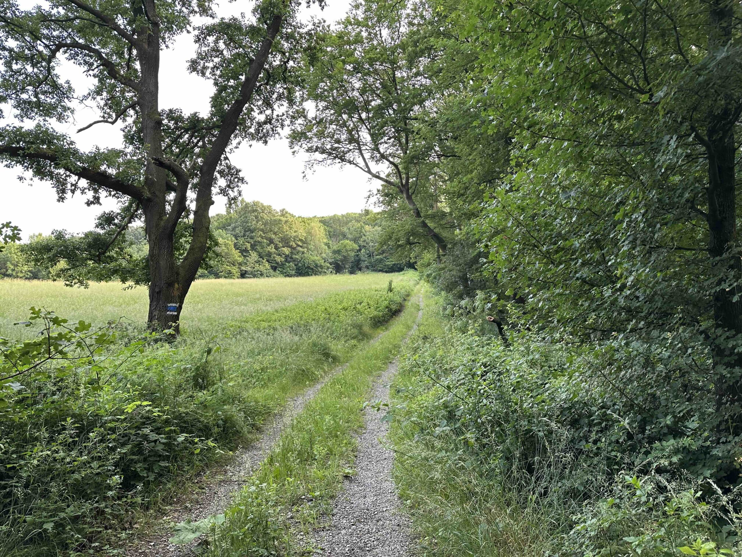 Hier trifft man auf den grün markierten Weg aus Klosterneuburg und biegt rechts ab, an der Steinböck Hütte vorbei, und kommt gleich danach auf eine Kreuung mit einer breiten Forststraße, der man geradeaus, leicht bergan, durch den Wald folgt. Zuerst gilt es einen kleinen Anstieg zu bewältigen, bevor man beim Roten Kreuz auf den Eichenhain trifft. Von nun wandert man entlang dem Waldrand mit Blick über Felder und Wiesen in Richtung Exelberg. In der Mitte befindet sich ein kleiner Bauernhof und davor eine über 300 jährige Stieleiche, die Mutter des Wienerwalds.