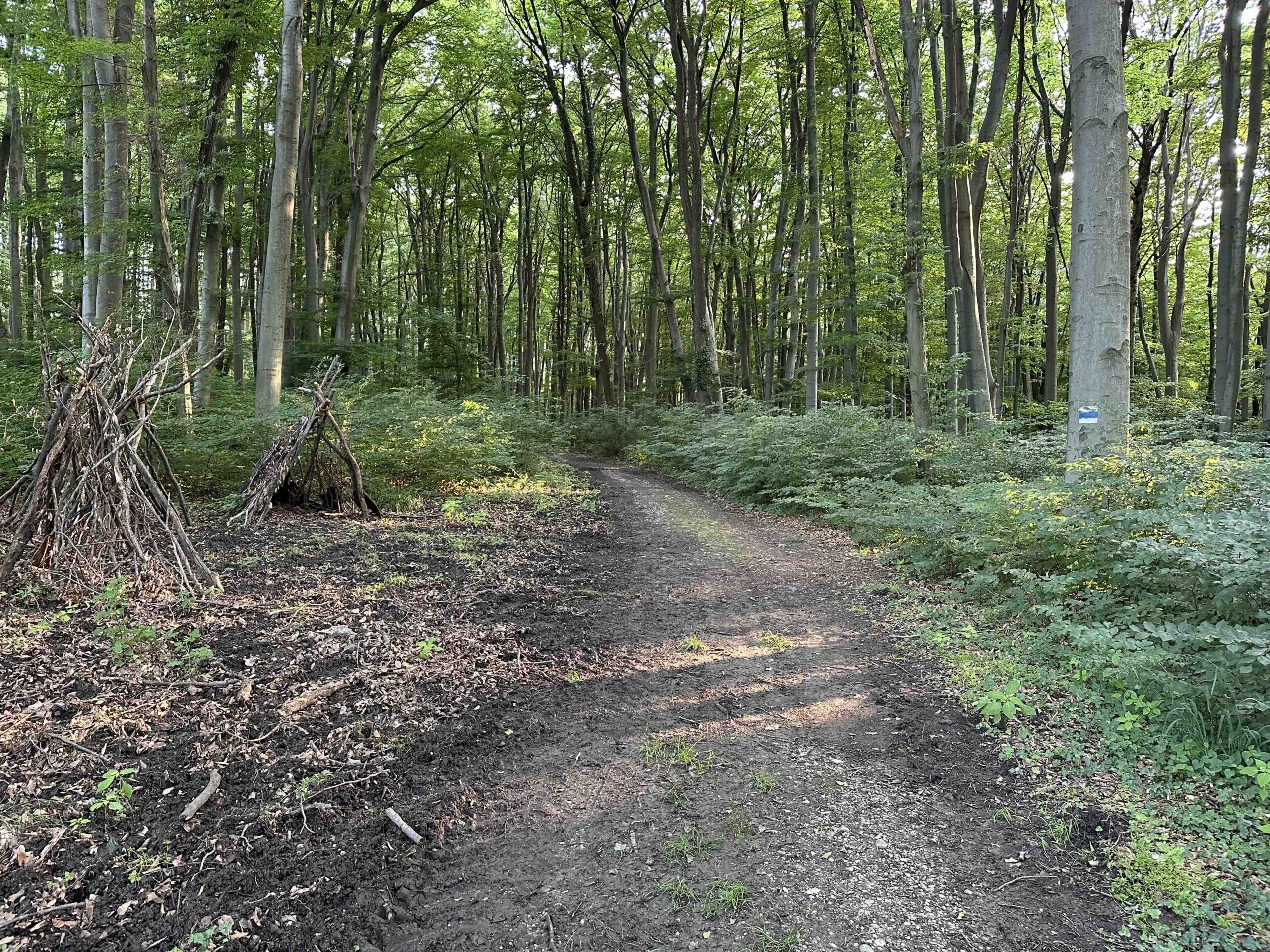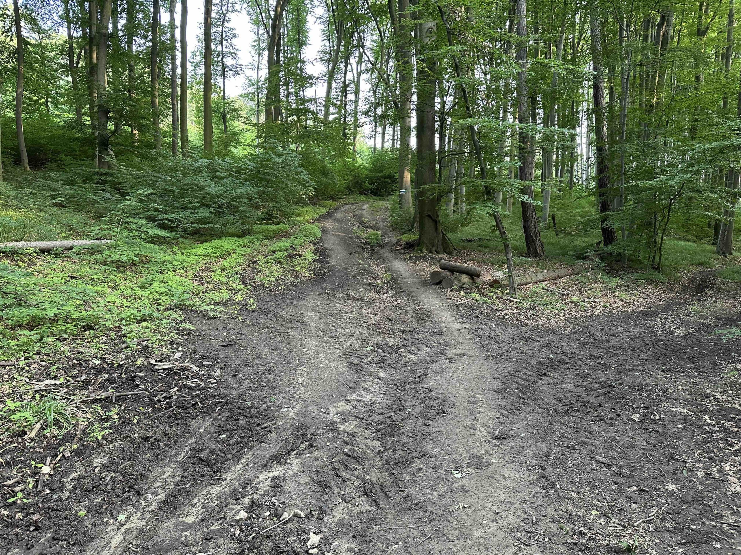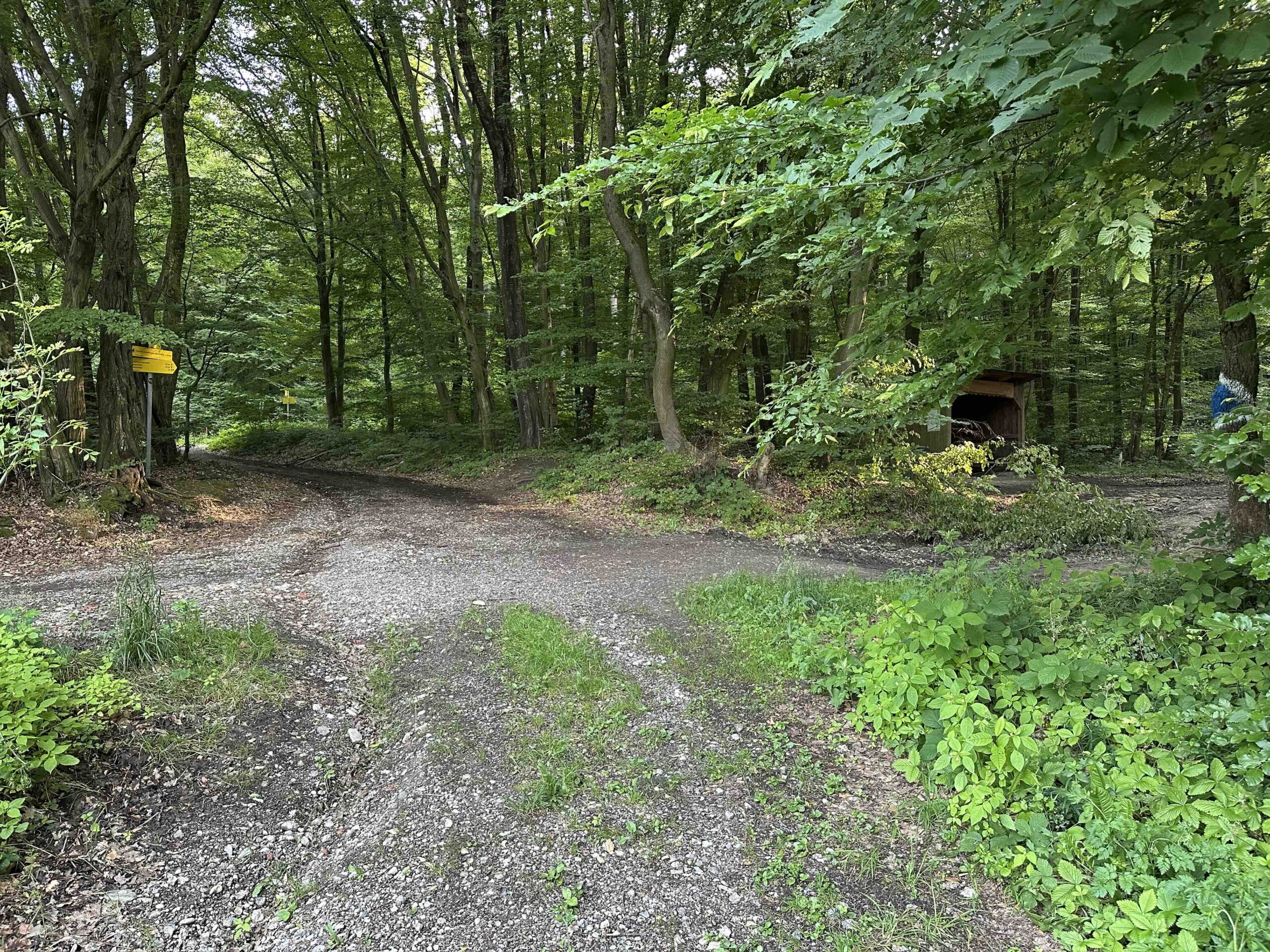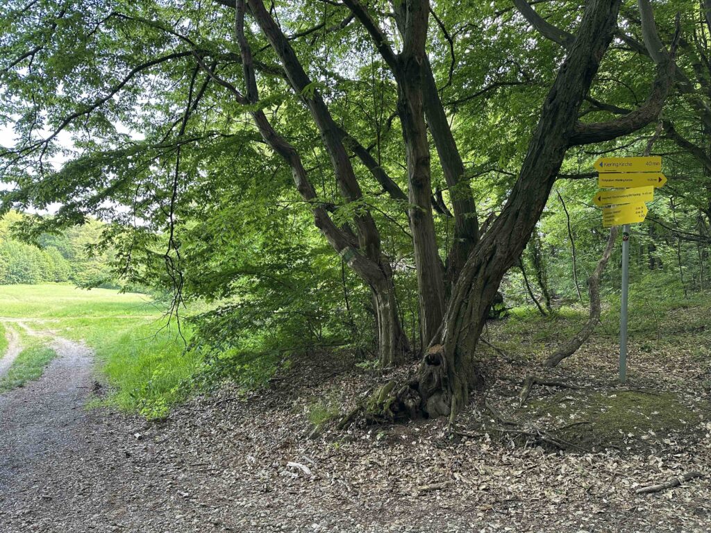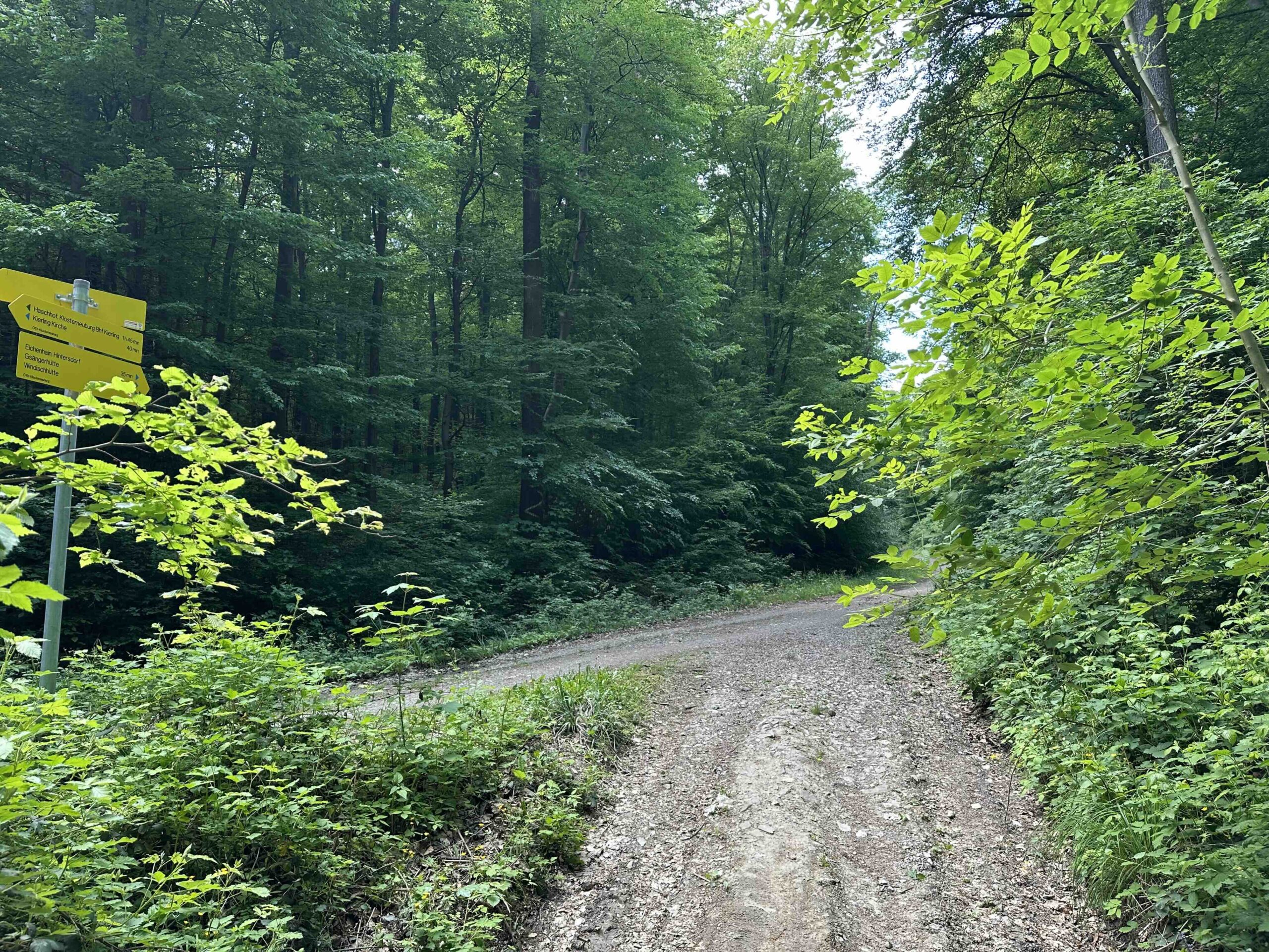 Gleich danach erreicht man den Wegknoten Eichenhain, das Ende des Weges. Von Hier geht es weiter, der Forststraße folgend, den gelb markierten Weg Richtung Windischhütte oder den blau markierten Weg Richtung Schloss Hintersdorf.