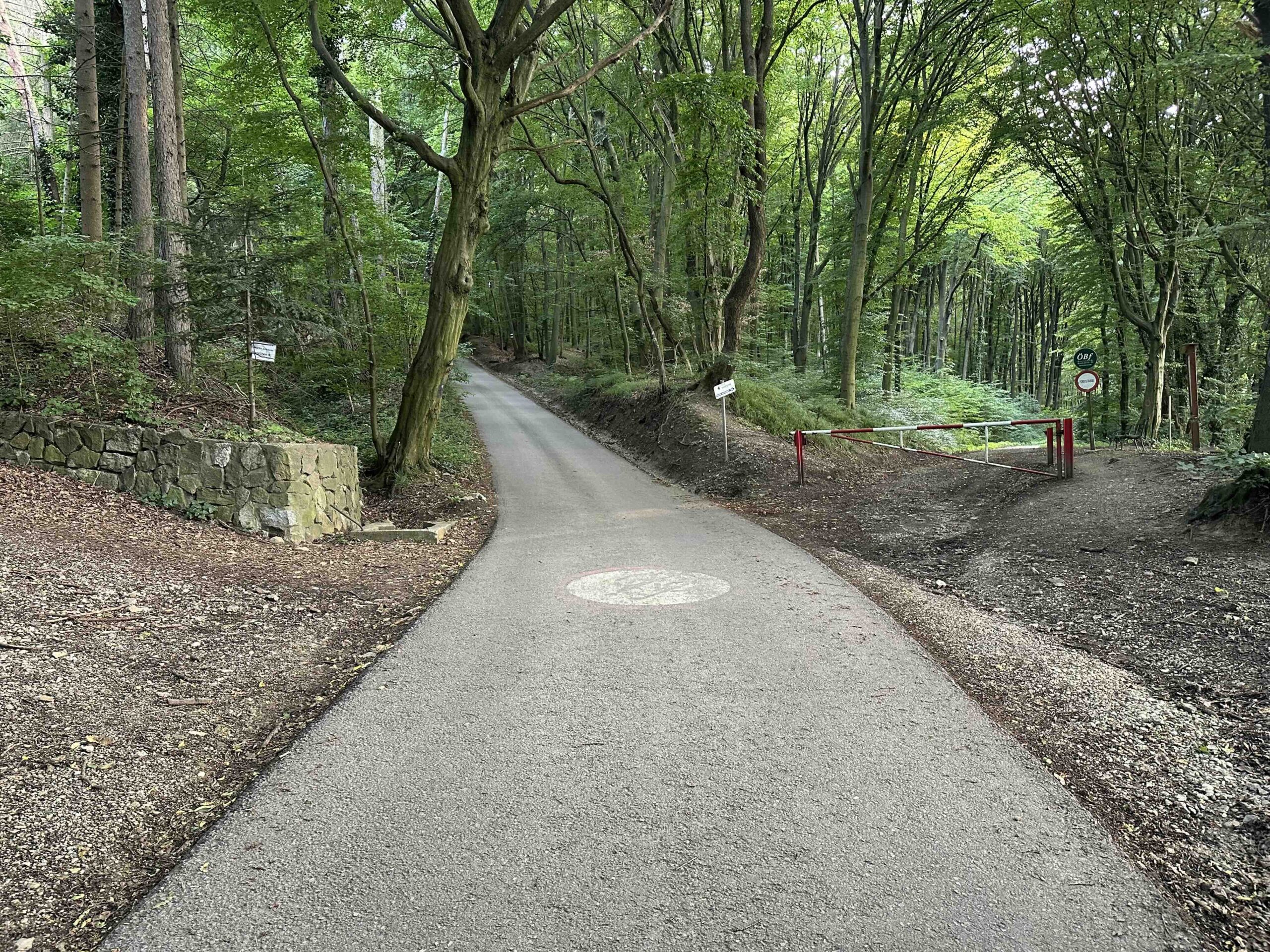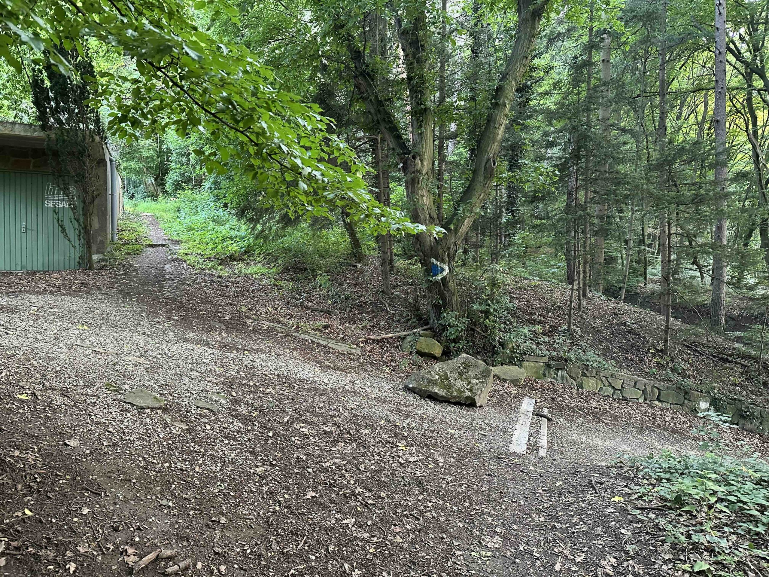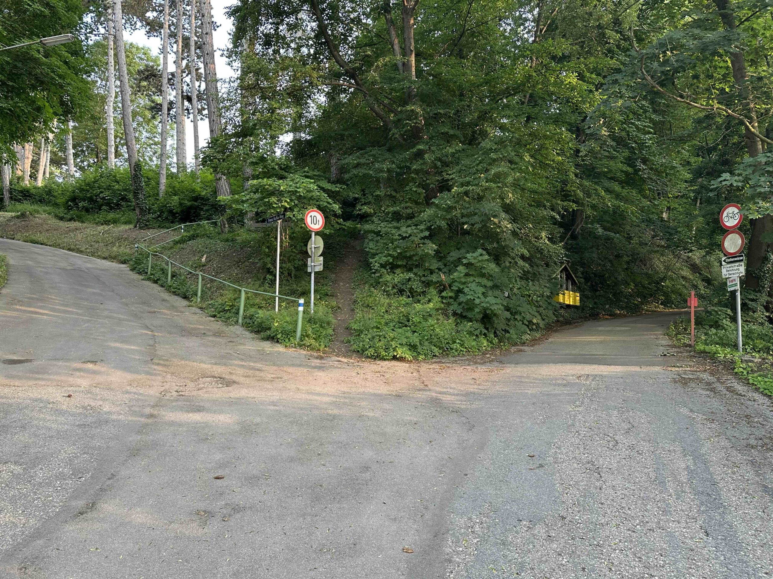Der Weg beginnt hinter der Kirche am Anfang der Otto-Kochwasser-Gasse in Kierling und geht zunächst besagte Gasse zur Kirche hinauf. Am Kirchenplatz links hinauf, wo man vor einem kleinen Park rechts hinauf in die Privatstraße Stellenwiese geht. Gleich am Anfang, bei der Kreuzung mit dem Franz-Kafka-Weg, führt ein kleiner Pfad ein Stück oberhalb der Stellenwiese entlang. Nach ca. 200 Meter wechselt man wieder auf die asphaltierte Straße, der man bis zu Ende folgt. Kurz nach dem Ende des Asphalts führt geradeaus eine Forststraße hinein in einen dichten Mischwald. Dieser folgt man bis man nach einiger Zeit am Ende die Hohenauer Wiese erreicht. A Ende der Wiese befindet sich der Wegknoten Hohenauer Wiese mit der Steinböck Hütte (einer kleinen Unterstandshütte).