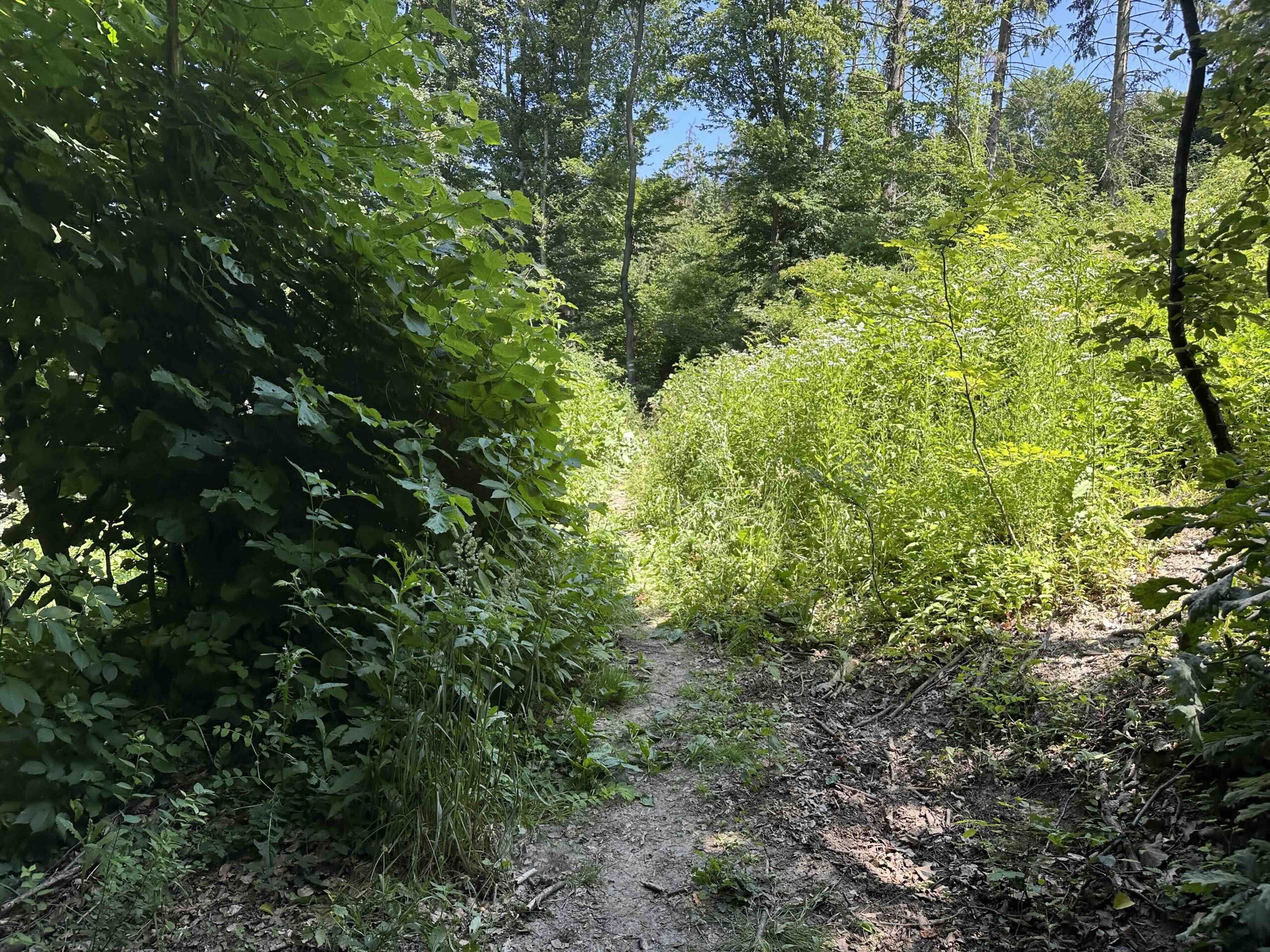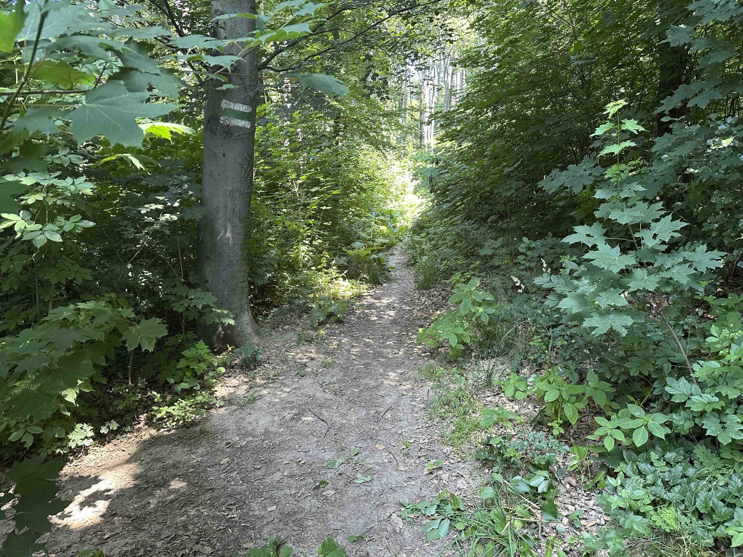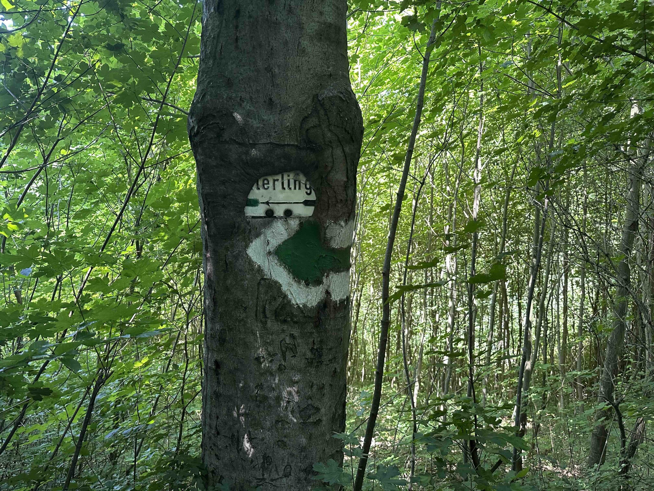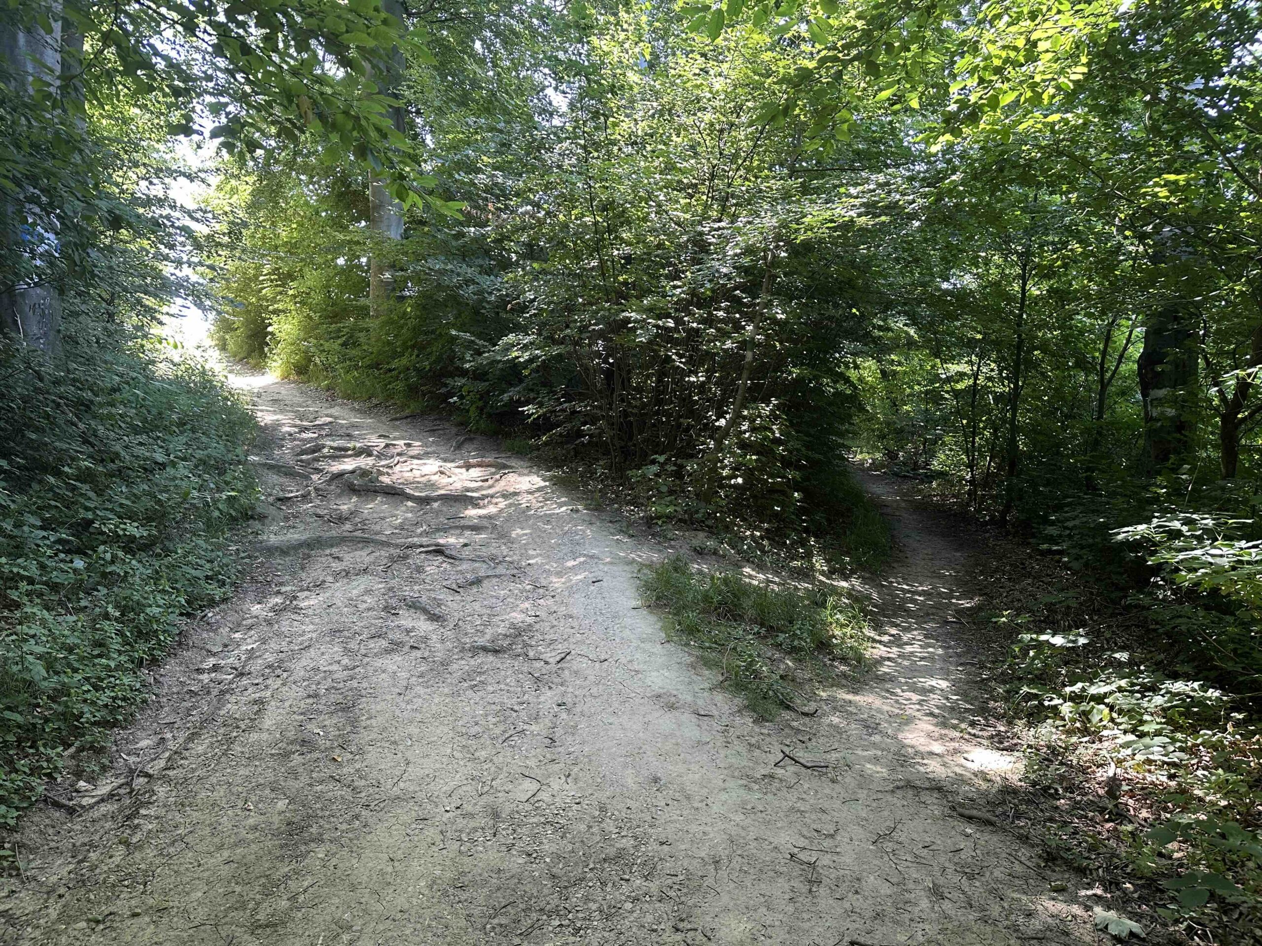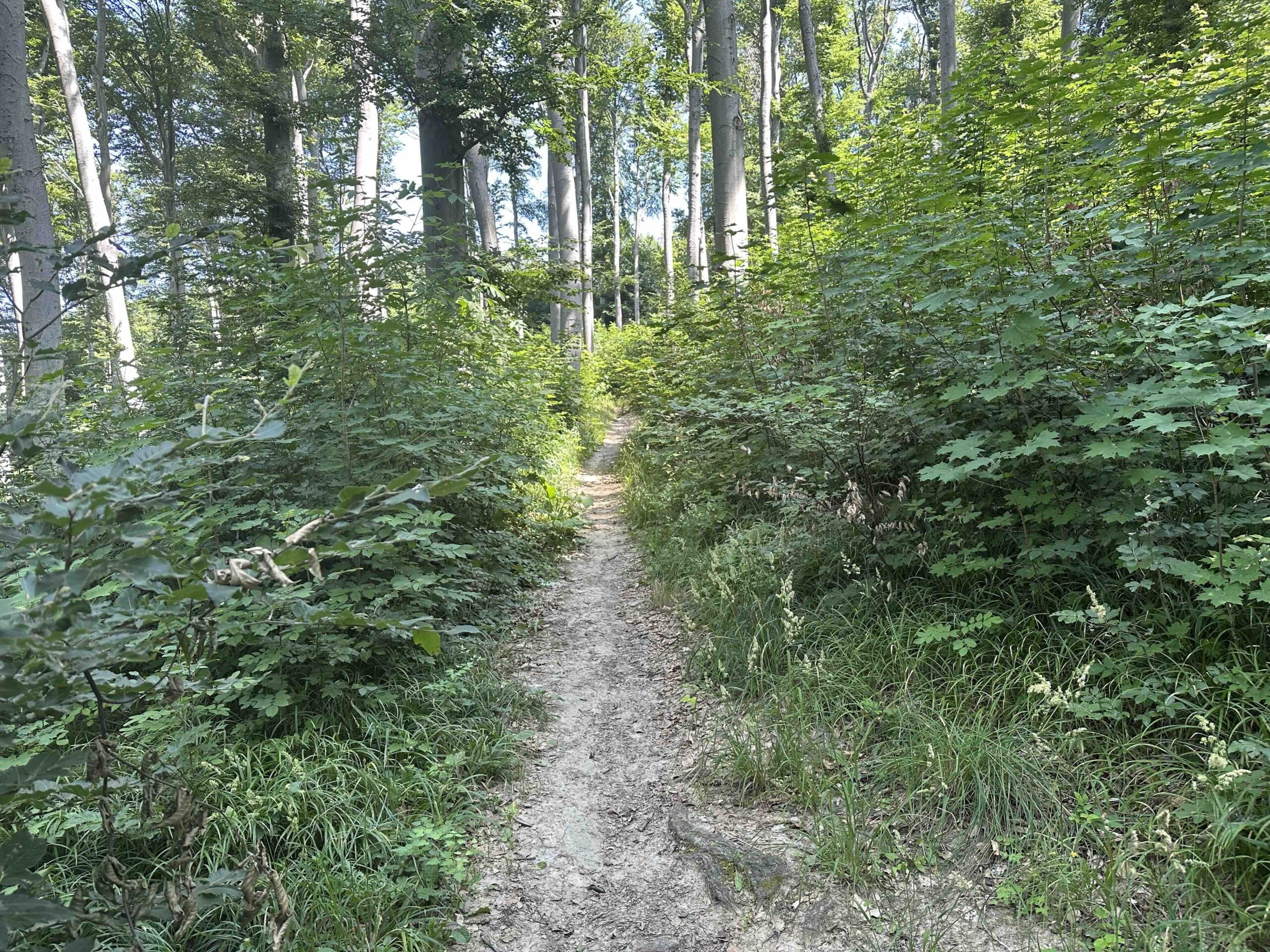 Von hier kann man den Weg entlang der roten Markierung Richtung Hadersfeld fortsetzten.