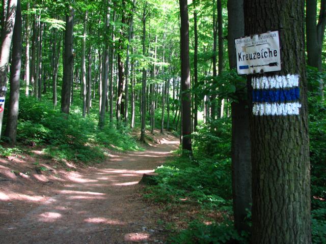 gasse, ca. 50 m oberhalb des Krapfenwaldlbades, dort wo der gelb markierte Wanderweg über einige Stufen von der Wagenwiese heraufkommt. Die blaue Markierung folgt zuerst der Krapfenwaldgasse und überquert an deren Ende die Wiener Höhenstraße. Der Weg wendet sich bei der Haltestelle der Autobuslinie 38A nach links Richtung Cobenzl. Nach einer kurzen Steigung erreicht man einen breiten Forstweg, auf dem man völlig eben bis zum Wegkotenpunkt Kreuzeiche gelangt. Die alte Eiche gibt es nicht mehr, es wurden aber am Rande dieser Wegkreuzung zwei neue Eichen neben einem Wegkreuz gepflanzt. Die unübersehbare Wegkreuzung wird gerade übersetzt. Am Südhang des Vogelsangberges (516 m) entlang gehend, erreicht man nach gut 1 km die Jägerwiese.