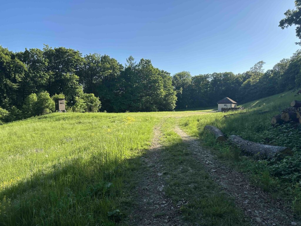 Der Weg folgt weiter geradeaus dem Hoheneggersteig bis man den Ortsrand von Hadersfeld erreicht. Gleich nach der ersten Forststraße die links ins verbaute Gebiet führt, zweigt beim Wegknoten Am Anger links ein kleiner Weg ab, der kurz darauf am Wegknoten Blochweg