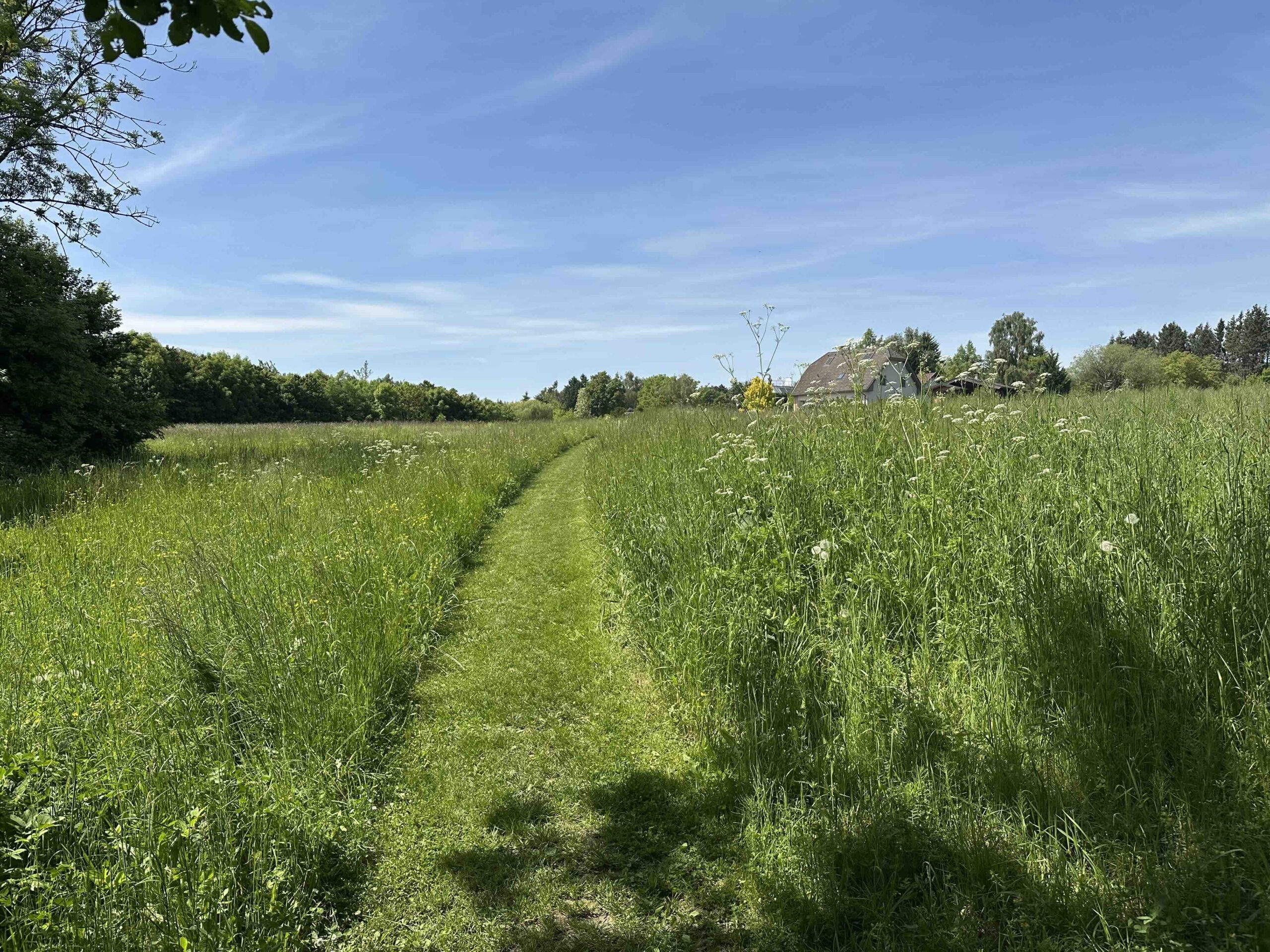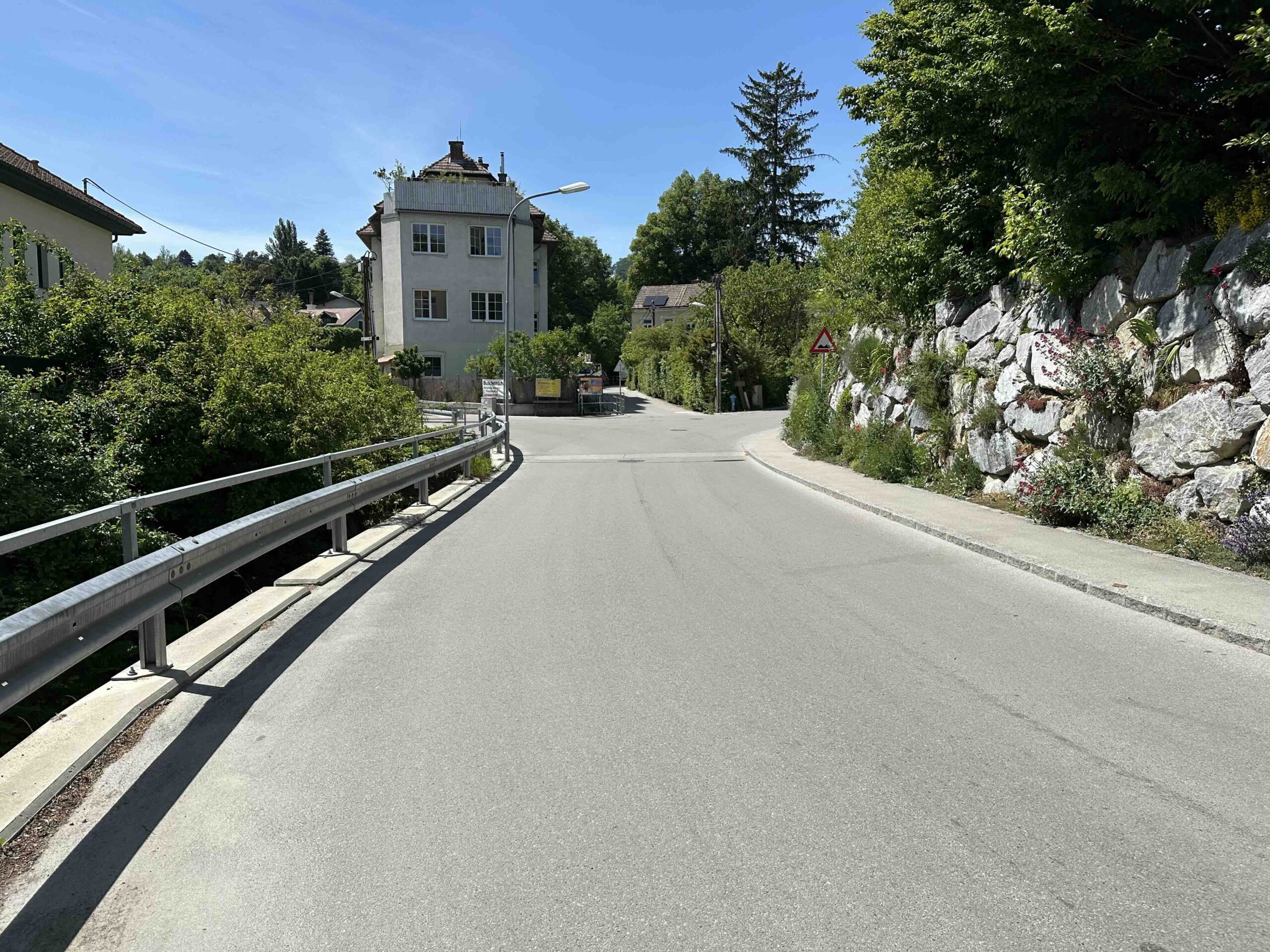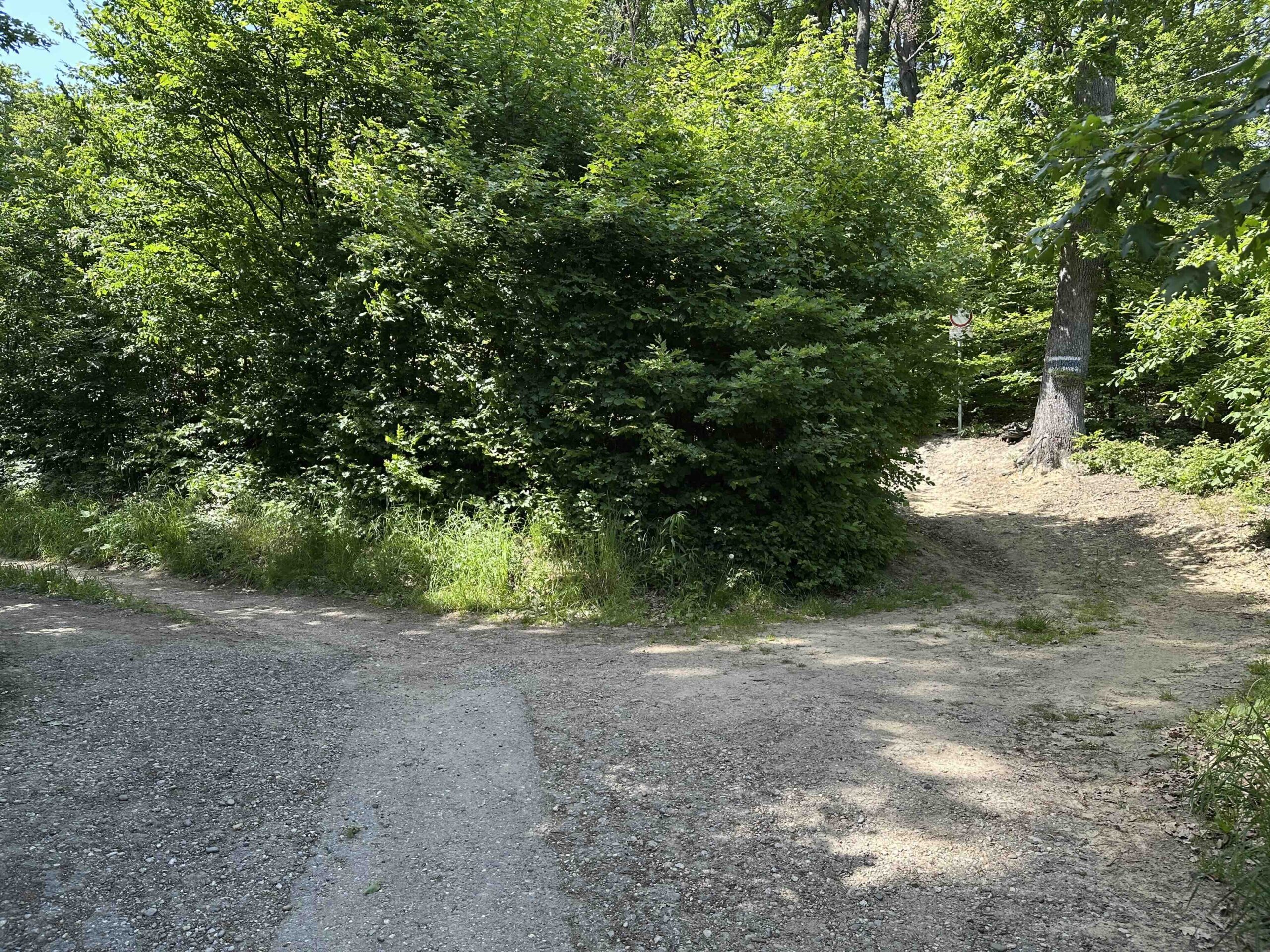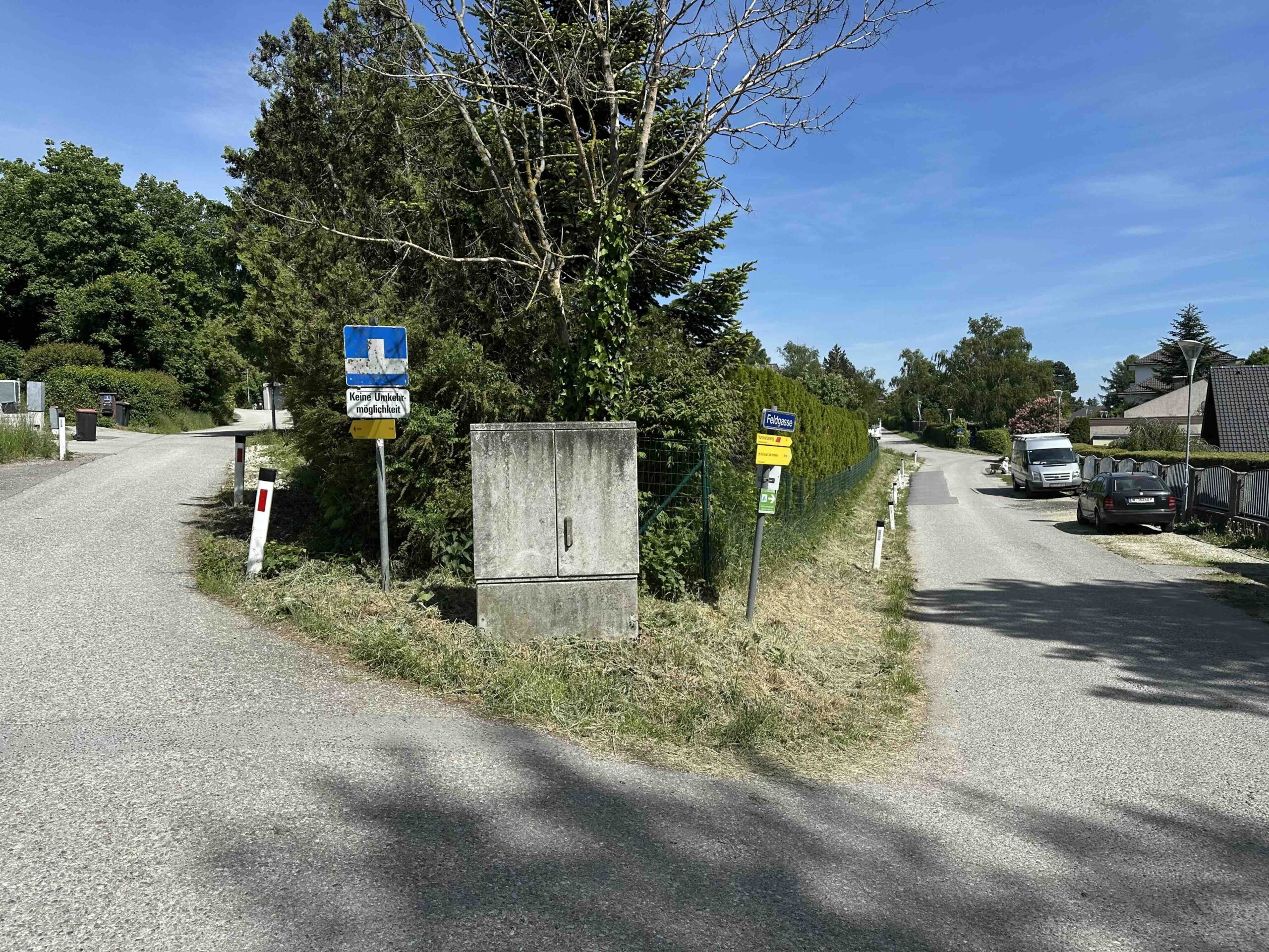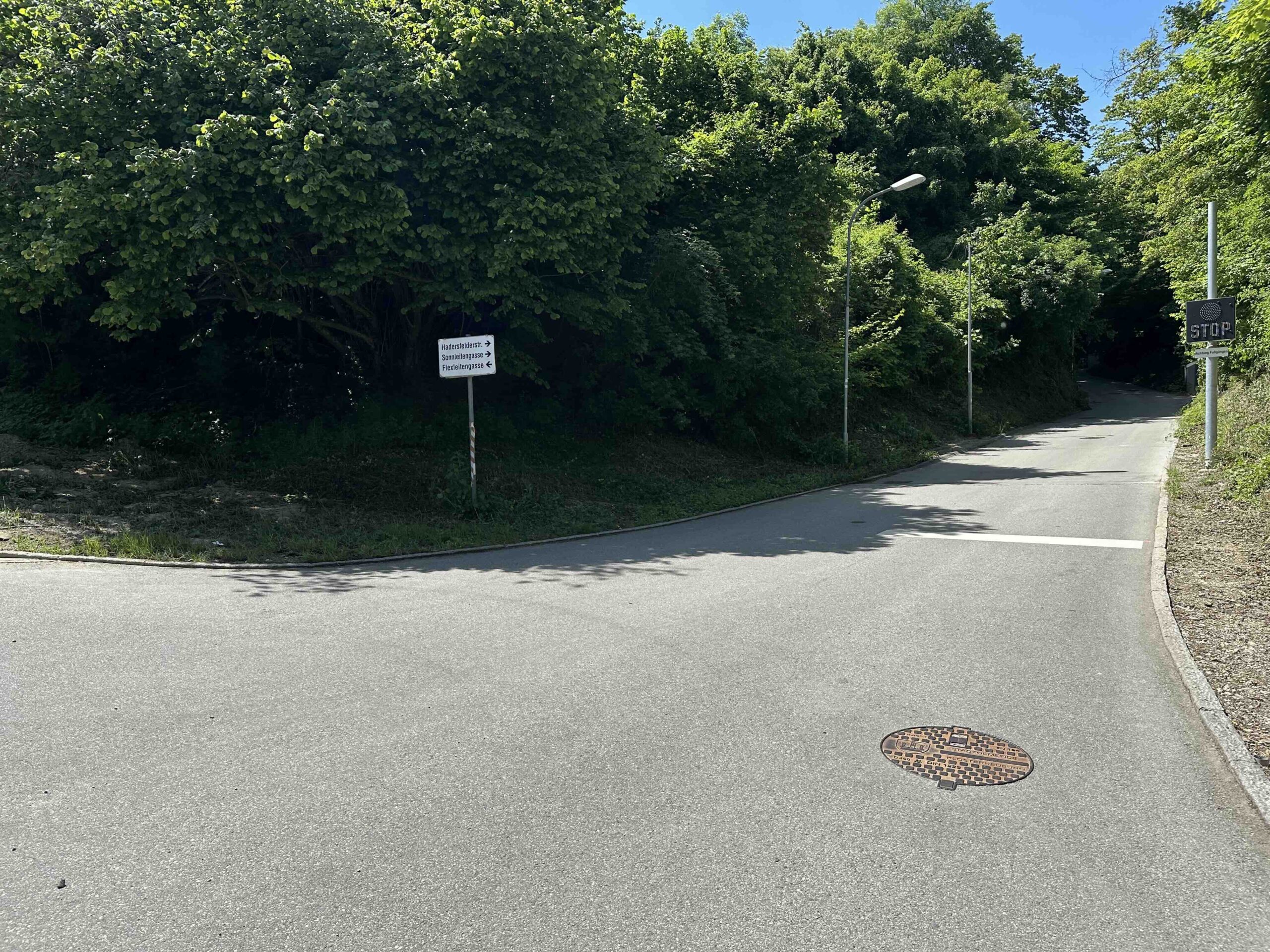 Hier quert die grüne Markierung vom Weißen Kreuz über die Dreifaltigkeit zum Heiligen Koloman. Man überquert die Forststraße und tauch auf der anderen Seite gleich wieder in den Wald ein, der nach einem kurzen Stück auf einer Wiese am Ortsrand von Hadersfeld endet. Nach dem überwueren der Wiese gelangt man auf die Feldstraße und zum Wegknotenpunkt Hadersfeld/Feldstraße. Der Feldstraße folgt man bis zum Ende, Wegknoten Hadersfeld/Feldstraße/Blochweg, dort links hinunter bis zum Glockenturm, dem Ziel dieses Weges.
