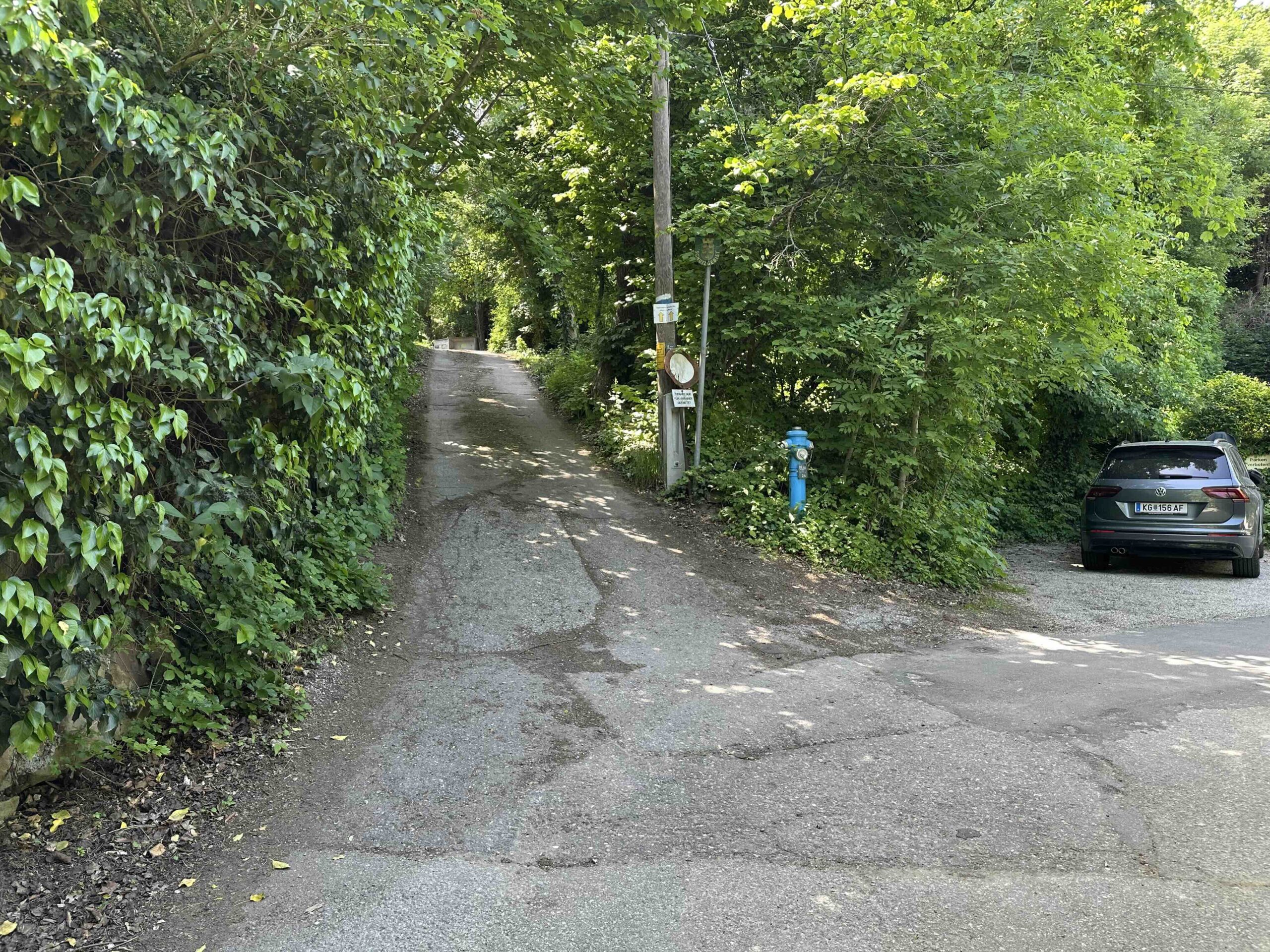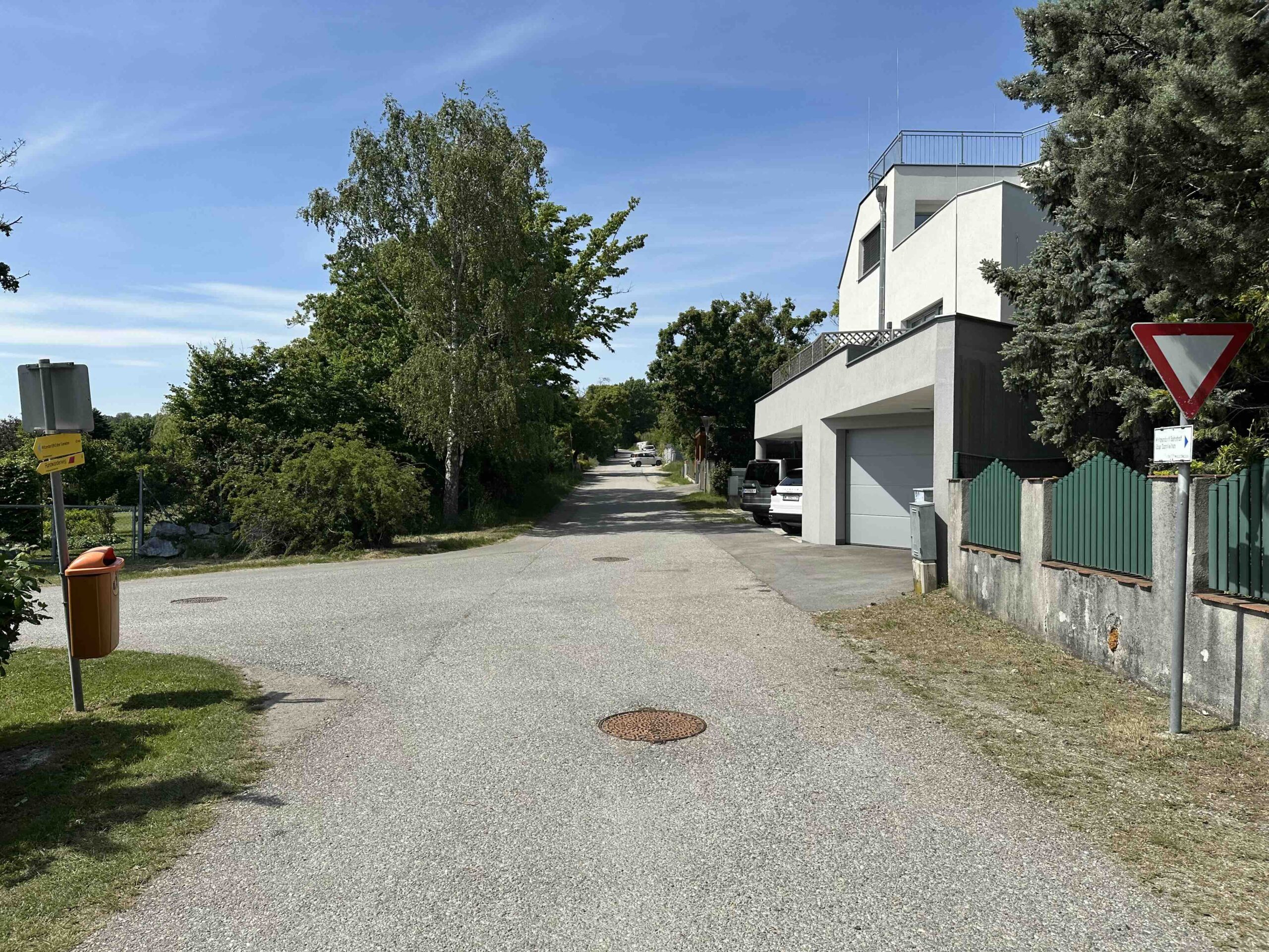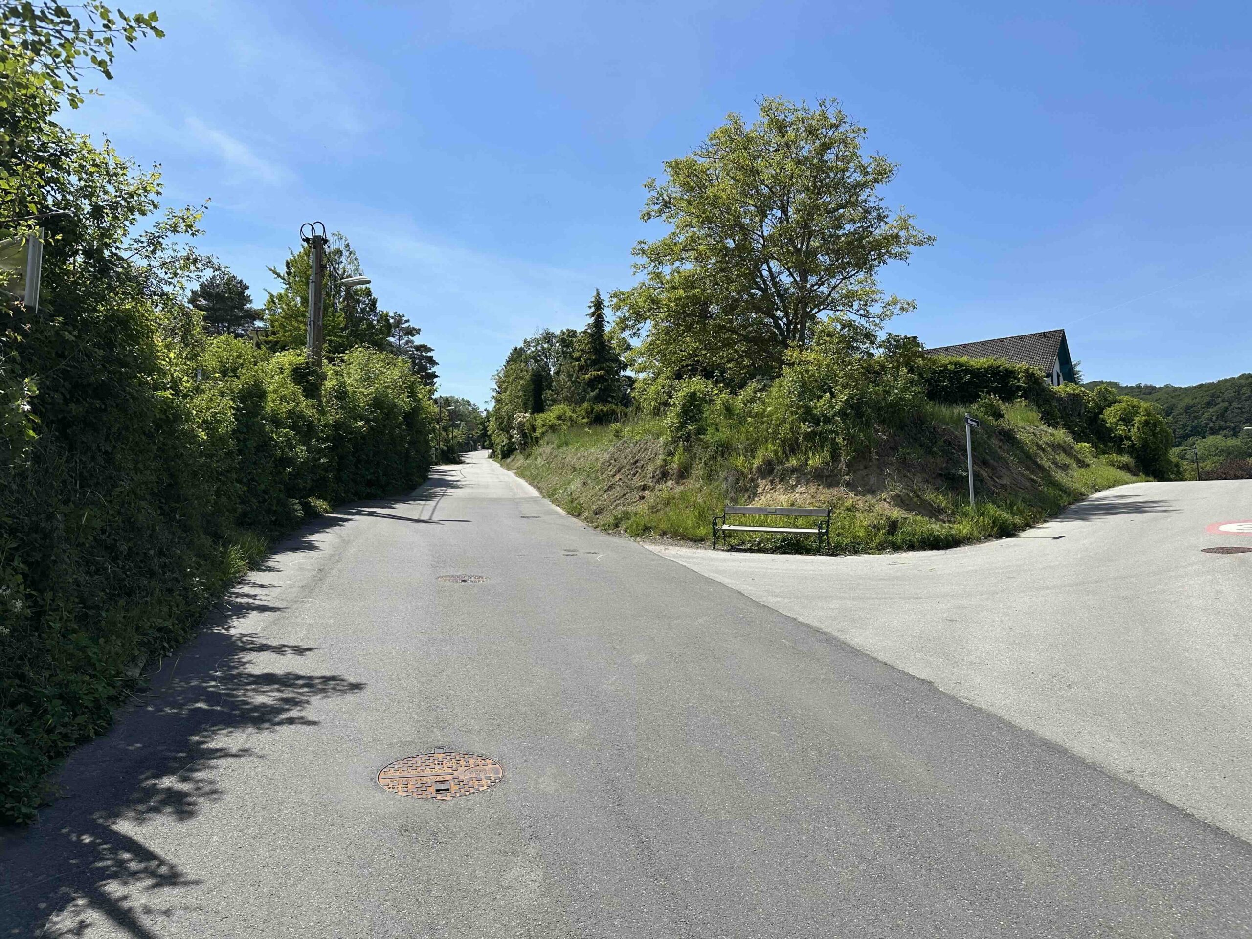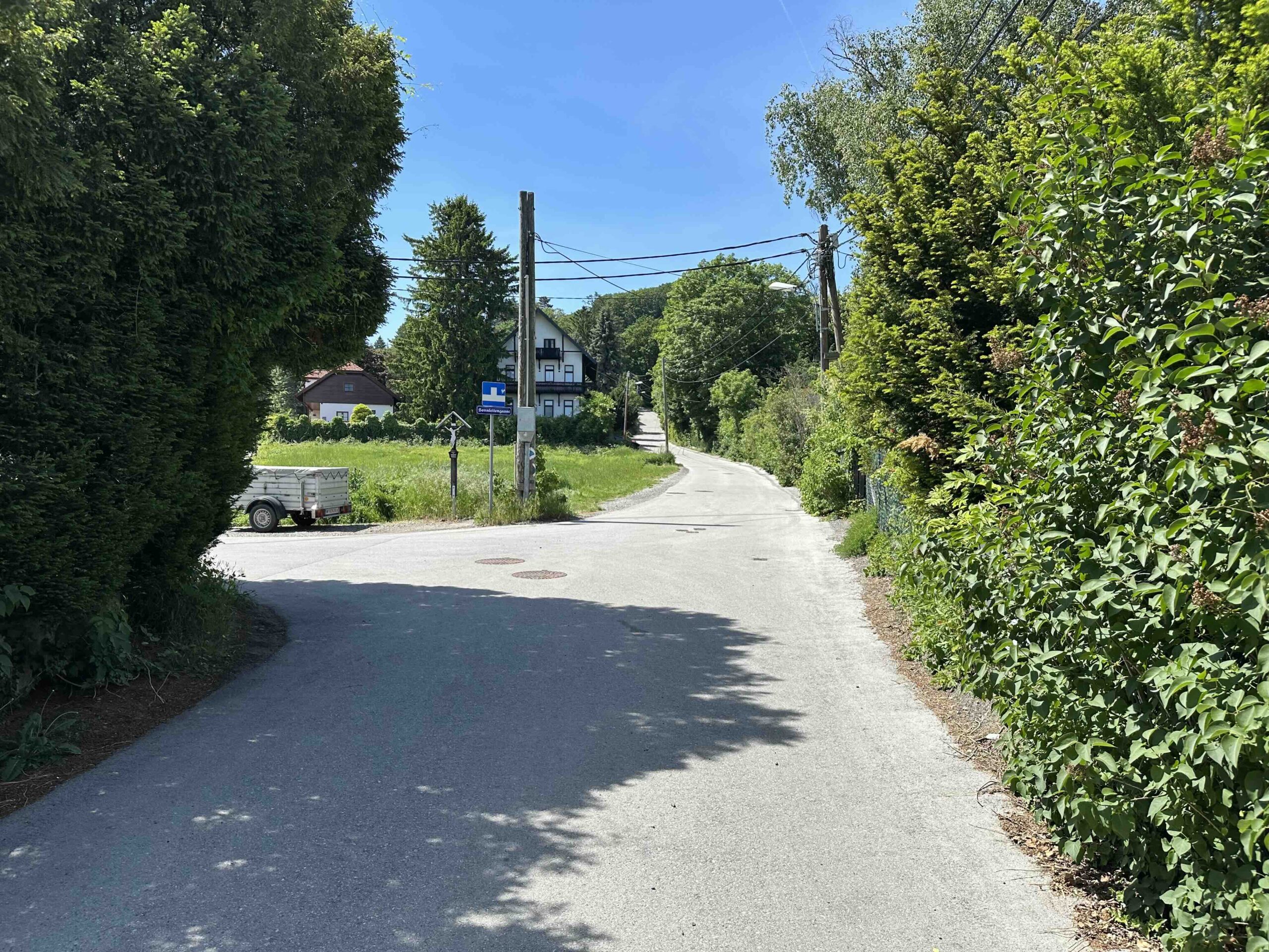 Bei der Kreuzung mit der Sonnleitengasse (beim Blazetichkreuz) kann man kurz den Blick über die Wiese in den Flexleitengraben geniessen, bevor es weiter steil hinauf geht wo man dann bei der ersten Rechtskurve der Privatstraße, vorbei an einer alten Villa, bis zum Ende folgt. Hier folgt man rechts dem Forstweg um kurz danach links auf einen kleinen Waldweg zu wechseln. Dieser führt zunächst zwischen alten hohen Bäumen, wechselt dann aber in deinen dichten verwachsenen Weg durch einen Jungwald, bis man beim Wegknoten Am Sonnleitenweg wieder auf eine breite Forststraße trifft.