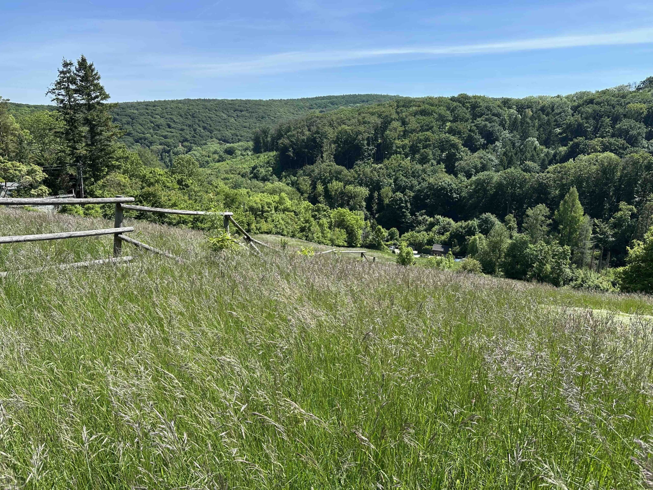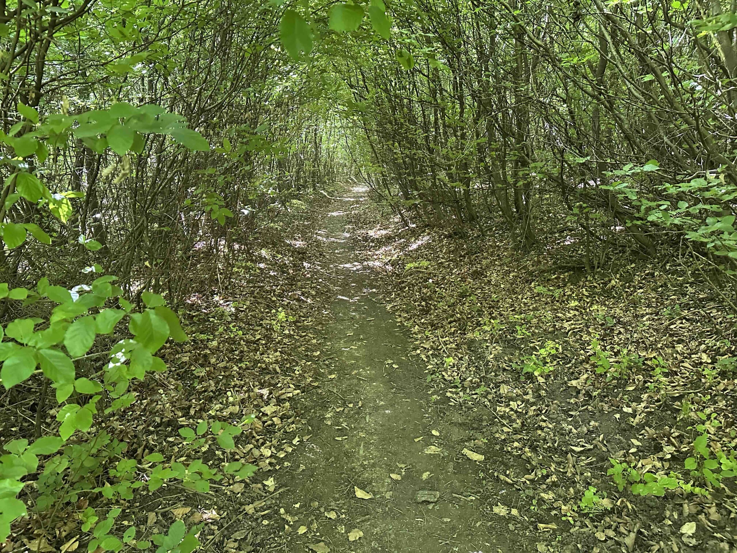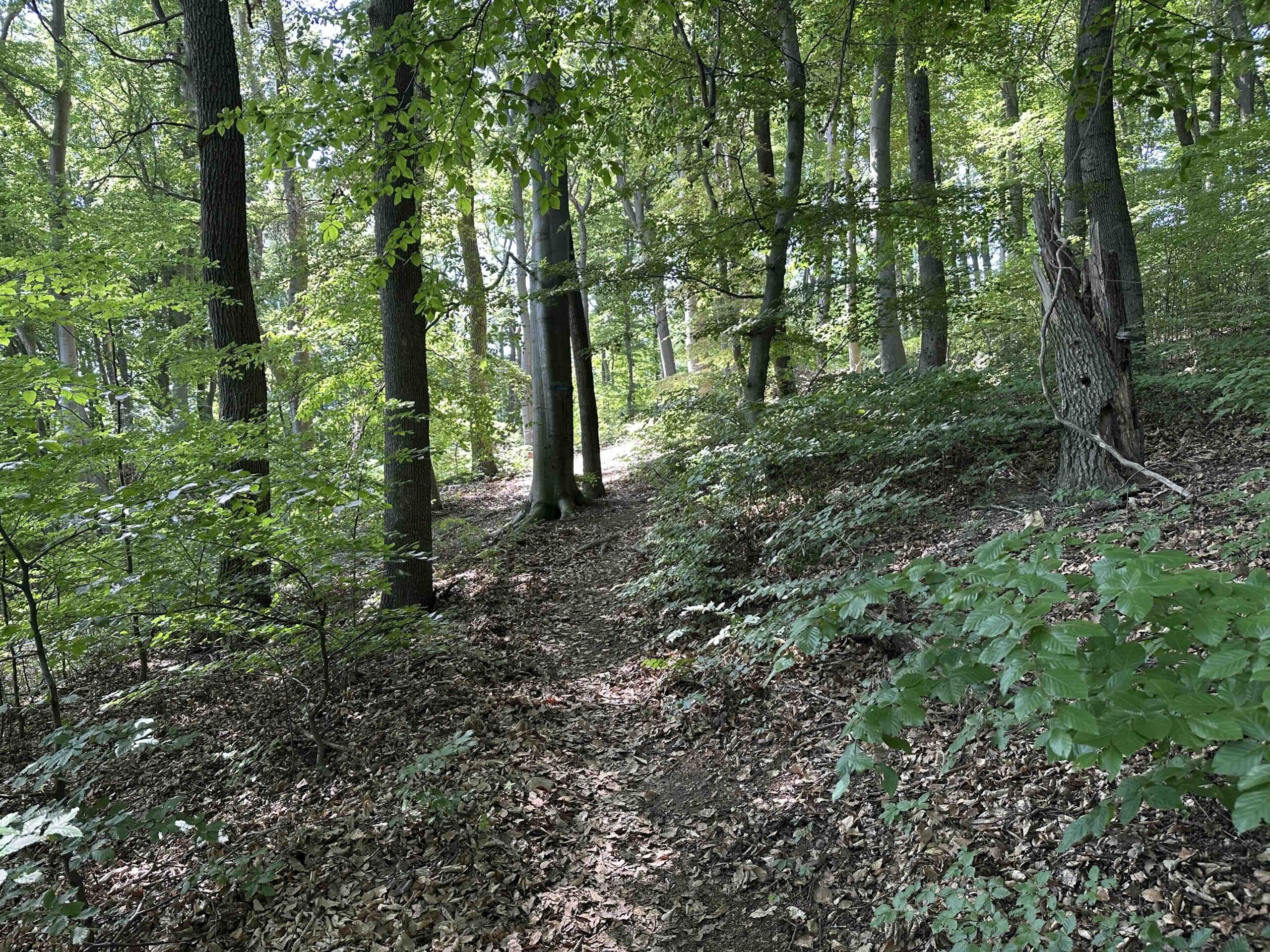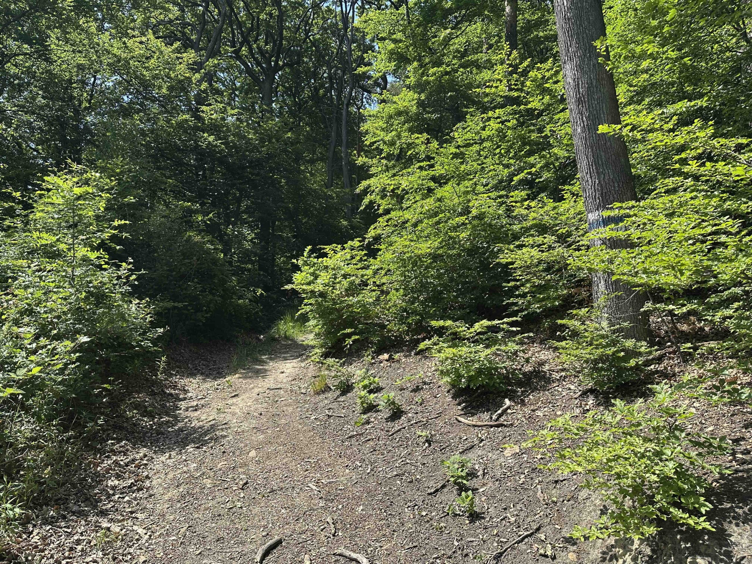 Bei der Kreuzung mit der Sonnleitengasse (beim Blazetichkreuz) kann man kurz den Blick über die Wiese in den Flexleitengraben geniessen, bevor es weiter steil hinauf geht wo man dann bei der ersten Rechtskurve der Privatstraße, vorbei an einer alten Villa, bis zum Ende folgt. Hier folgt man rechts dem Forstweg um kurz danach links auf einen kleinen Waldweg zu wechseln. Dieser führt zunächst zwischen alten hohen Bäumen, wechselt dann aber in deinen dichten verwachsenen Weg durch einen Jungwald, bis man beim Wegknoten Am Sonnleitenweg wieder auf eine breite Forststraße trifft.