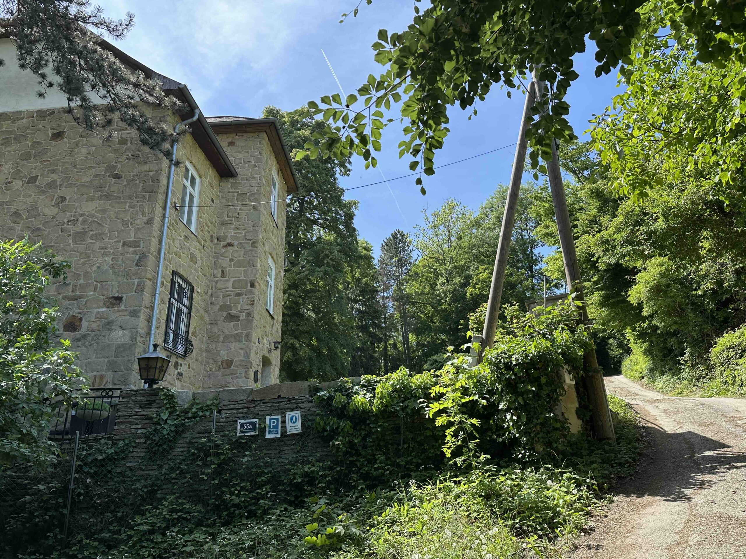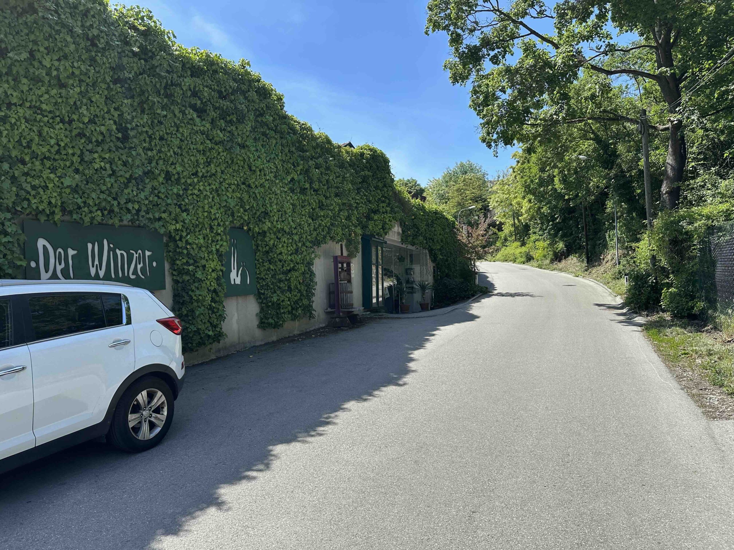 Nach dem Überqueren des Bahnhofsvorplatz erreicht man die Hauptstraße, wo sich die hier beginnenden Wege trennen. Hier hält man sich rechts und geht ein kurzes Stück der Hauptstraße entlang bis zur ersten Kreuzung mit der Badgasse und Neudauerstraße. Dort biegt man links in die Neudauerstraße und wandert den schmalen asphaltierten Gehweg den Kahlleitenbach entlang. Zwischendurch zweigt bei der Lauergasse der gelbe Weg über den Hoheneggersteig nach Hadersfeld ab. Am Ende bei der Kreuzung mit der Feldgasse spaltet sich der rote Weg über die Weißenhofer Straße Richtung Hadersfeld ab. Hier wendet man sich rechts in die Feldstraße dann gleich links in die Ziegelofengasse wo man rechts dem Wegweiser in die Hadersfelder Straße folgt, vorbei beim Weinshop „Der Winzer“ (dessen Logo vom Stift auf vielen Klosterneuburger Autos zu finden ist). Bei der nächsten Kreuzung mit der Flexleitengasse (an deren Anfang sich der urige Buschenschank Flexleitenhof befindet) weiter rechts steil hinauf, durch eine hohlwegartiges Stück, die Hadersfelder Straße. An der nächsten Kreuzung mit der Heugasse geradeaus weiter steil die Hadersfelder Straße. Nun werden die Häuser moderner und die Tujenhecken höher. Rasenmähroboter sorgen für den perfekten Schnitt, werden zum Glück aber von den Vögeln übertönt.