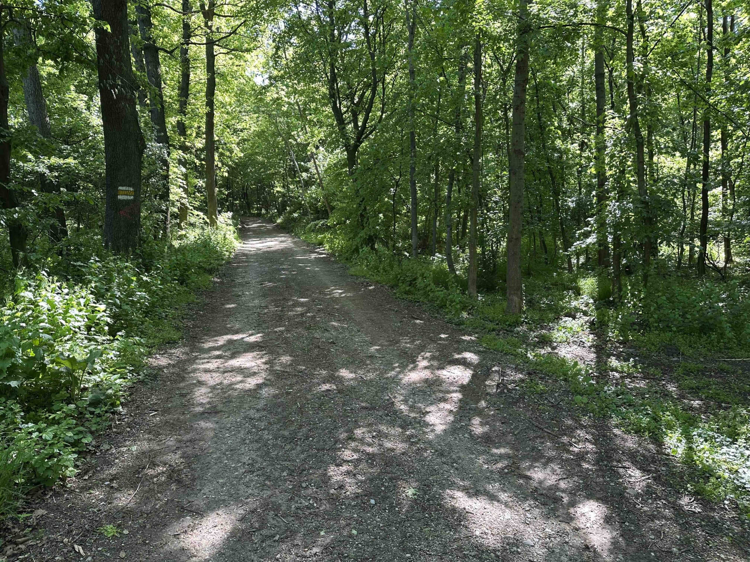 Der gelbe Weg folgt weiter der Forststraße, man kann hier aber auch dem blauen Weg durch den Wald folgen, der hier gemeinsam mit dem Naturerlebnisweg Kritzendorf verläuft und eine Reihe von Attraktionen bietet (am Ende kommt man bei der Waldandacht dem grünen Weg bergauf folgend wieder zum gelben Weg zurück). Folgt man dem gelben Weg, so geht es weiter durch den Wald und nach einem halben Kilometer erreicht man den Wegknoten Waldandacht bei Kritzendorf an dem von links der grüne Weg, der vom Bahnhof Unterkritzendorf kommt, einmündet. Der gelbe Weg führt hier an der Waldandacht vorbei und wer an dieser Station machen möchte, muss ein paar Schritte in Richtung des grünen Weges gehen.