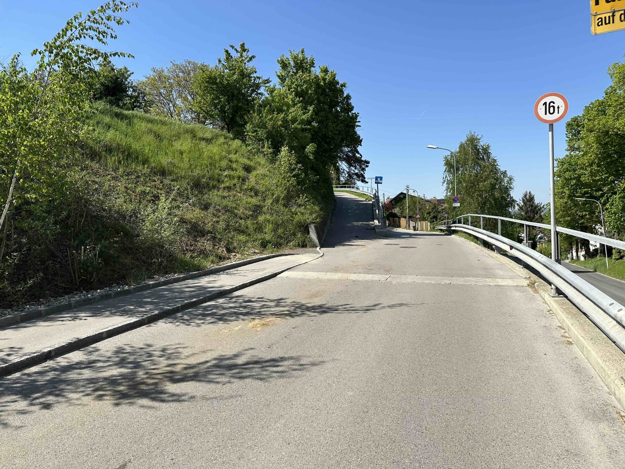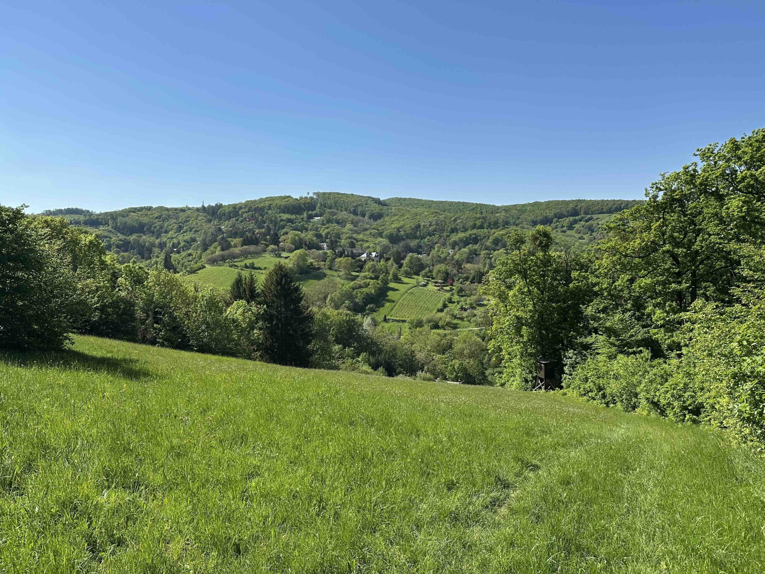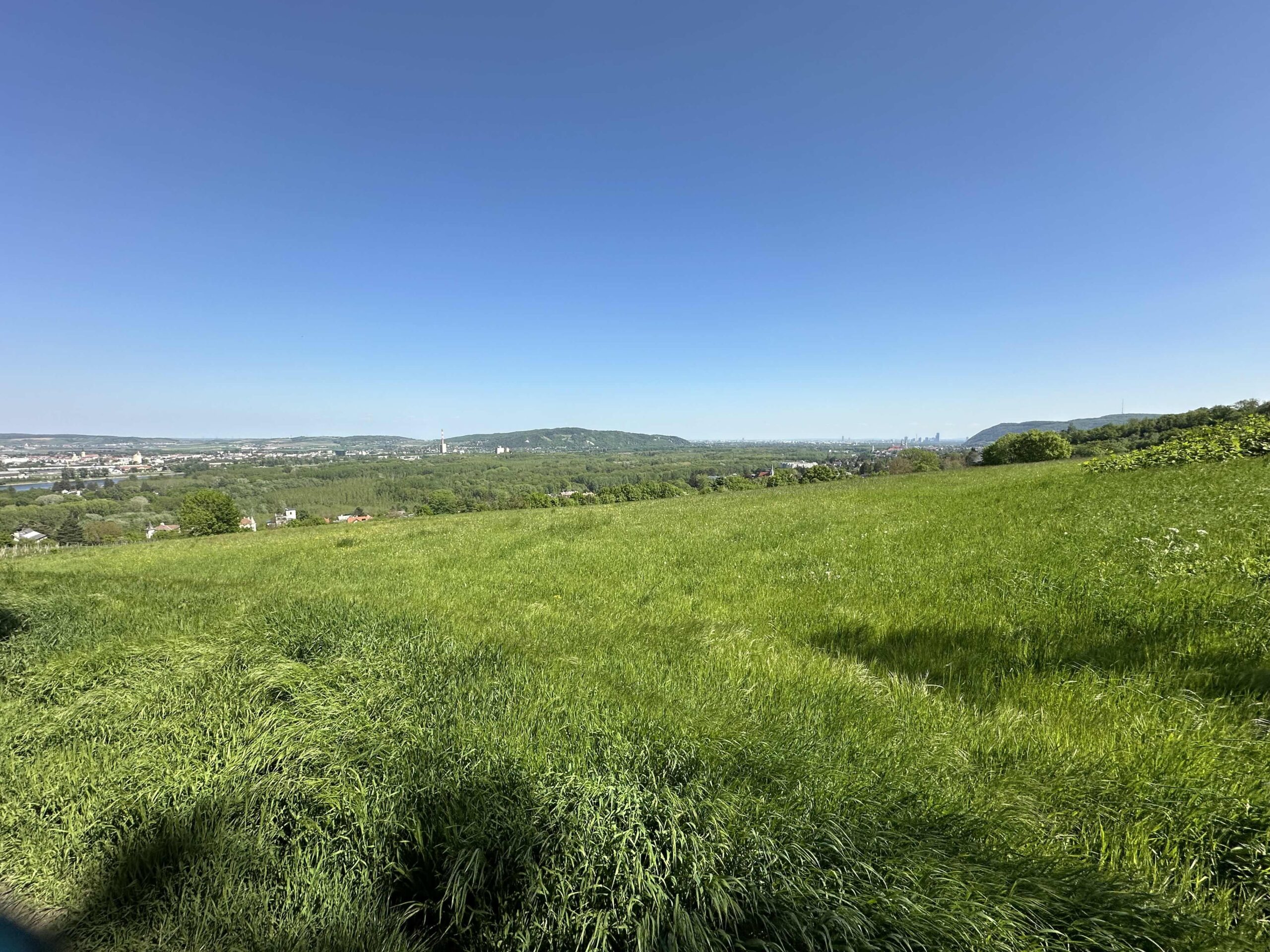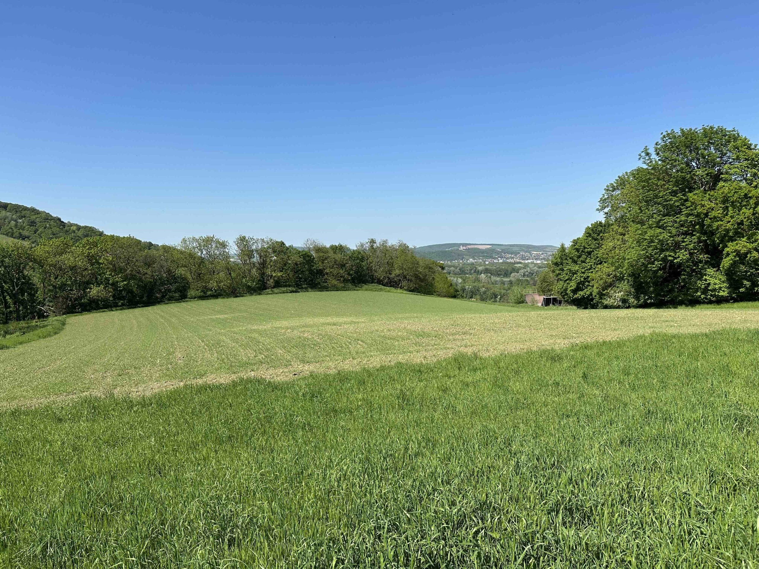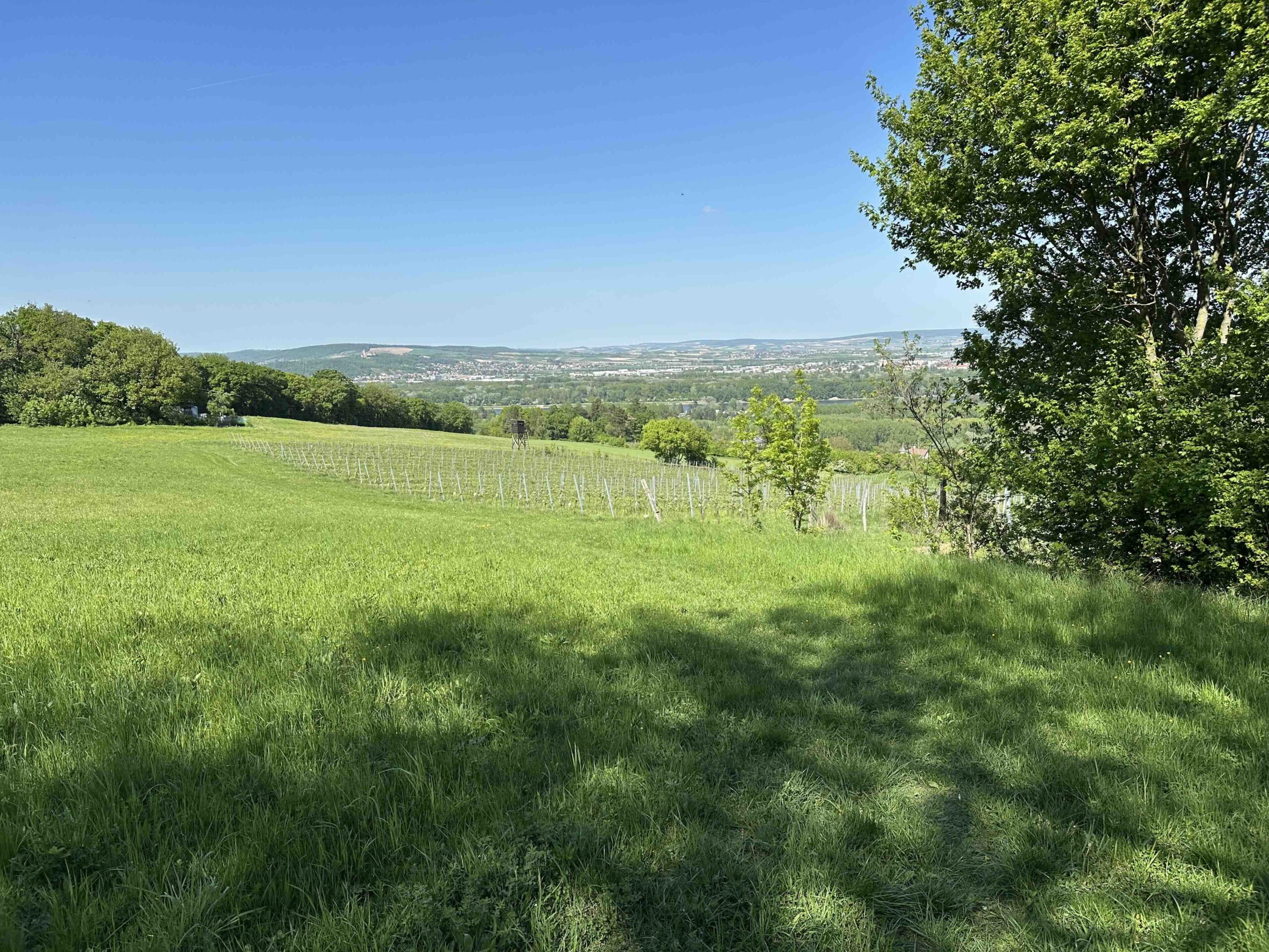 An der Kuppe befindet sich der Wegknoten Ludwig-Jüngling-Gasse (1829-1904, Gemeinderat und Ehrenbürger von Kritzendorf). Dort wendet man sich scharf rechts hinauf in die Feldstraße und danach gleich nochmals links hinauf in die Ludwig-Jüngling-Gasse. Dieser folgt man nun während die Dichte der Verbauung langsam abnimmt. Am Ende der Gasse geht die asphaltierte Straße in einen Feldweg über und es eröffnet sich rechter Hand der Blick Richtung Burg Kreuzenstein und linker Hand Richtung Stift Klosterneuburg bis nach Wien und Korneuburg. Ein kleines Stück kann man den Ausblick geniessen, bis man wieder in den Wald eintaucht. Wer genau schaut erkennt nach ca. 100m einen kleinen Weg der rechts abzweigt. Folgt man diesem Weg für knapp 100m so gelangt man ans obere Ende der Kuhwiesen und wird mit einem Ausblick über das Oberkierlinger Hinterland belohnt. Zurück am ursprünglichen Weg gibt es nach weitern 100m nochmals eine Möglichkeit für einen kleinen Abstecher nach links mit einem Blick über die Felder in der Hofstätten bis über die Donau zur Burg Kreuzenstein und nach Korneuburg. Nach diesem Stück durch den Wald erreichen wir die Bohrstelle Riedenweg wo unser gelber Weg mit dem blauen Weg, der vom Leander-Köhler-Weg kommt, zusammentrifft.