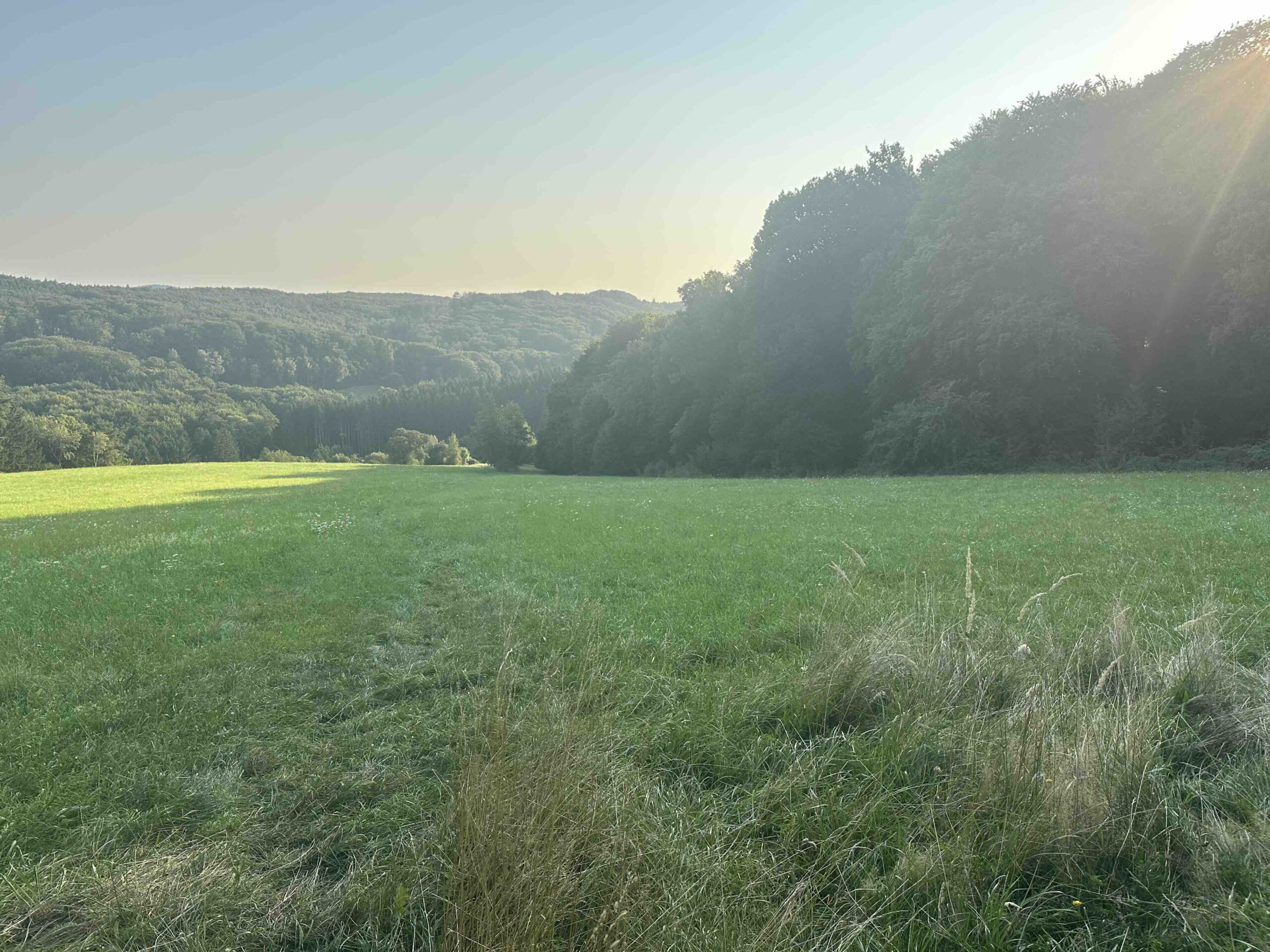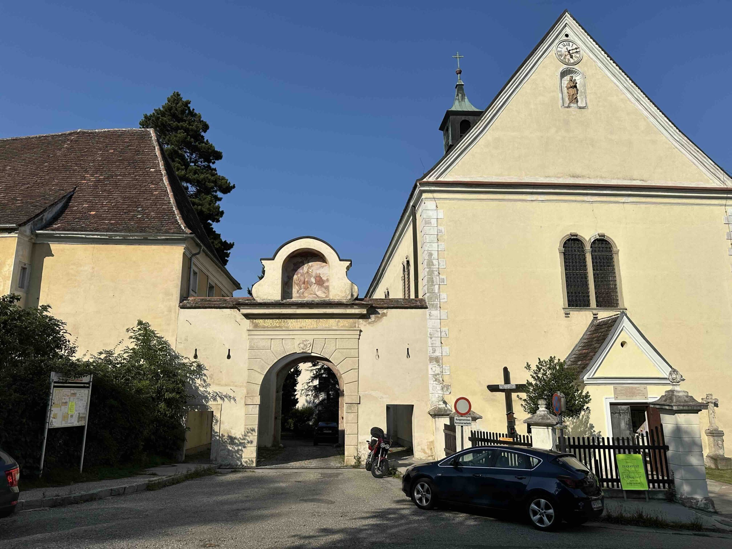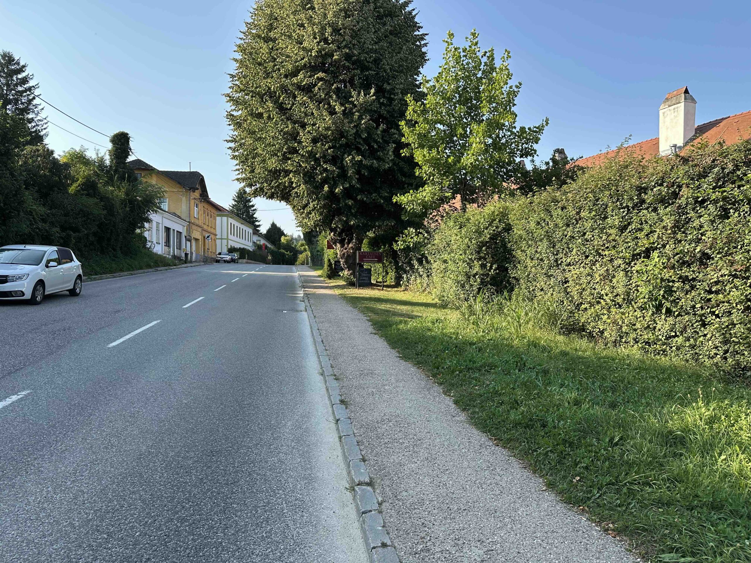 Zunächst geht es leicht bergauf entlang der Straße (L121) vorbei am Kartausen Cafe, Friedhof und dem Ortsende bis auf der linken Seite die Abzweigung zum Reitsportzentrum kommt. Dort biegt man links in die Feldwiesen-Gasse ein. An der Einfahrt des Reitsportzentrums führt rechts ein schmaler Pfad dem Wiesenrand entlang. Diesem folgt man bis zur Ende der Wiese, wo man rechts noch ein Stück am Waldrand entlang geht bis der Pafd auf der linken Seite in den Wald führt. Nun folgt man leicht bergan einem Forstweg. Der Forstweg führt gegen Ende in einer scharfen Rechtskurve aus dem Wald heraus. Hier folgt man geradeaus weiter dem Pfad durch den Wald der, vorbei an der Milleniumseiche, wieder auf die Forststraße trifft. Man folgt geradeaus weiter der breiten Forststraße bis links die Wegweiser wieder in den Wald führen. Am Ende trifft man wieder auf einen Forstweg der links auf eine weite Wiese führt. Man folgt dem Fortweg die Wiese hinunter. Gegen Ende der Wiese macht der Weg eine Linkskurve und nach der Kurve folgt man dem Wegweiser links über einen schmalen Pfad hinunter nach Hirschengarten, dem Ziel dieses Weges.