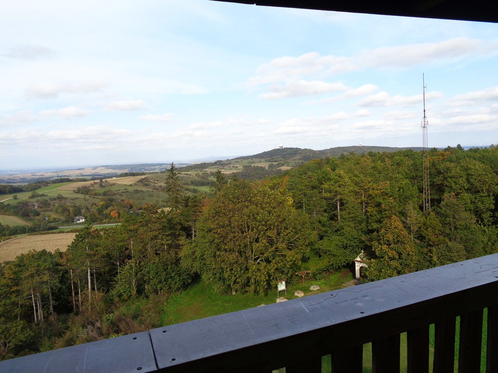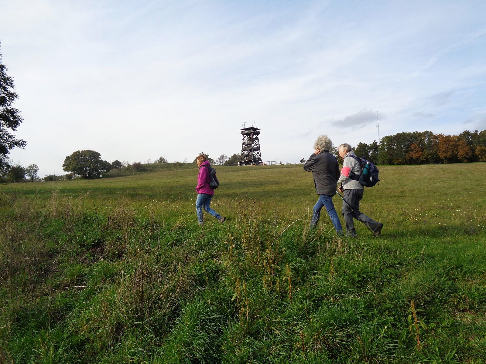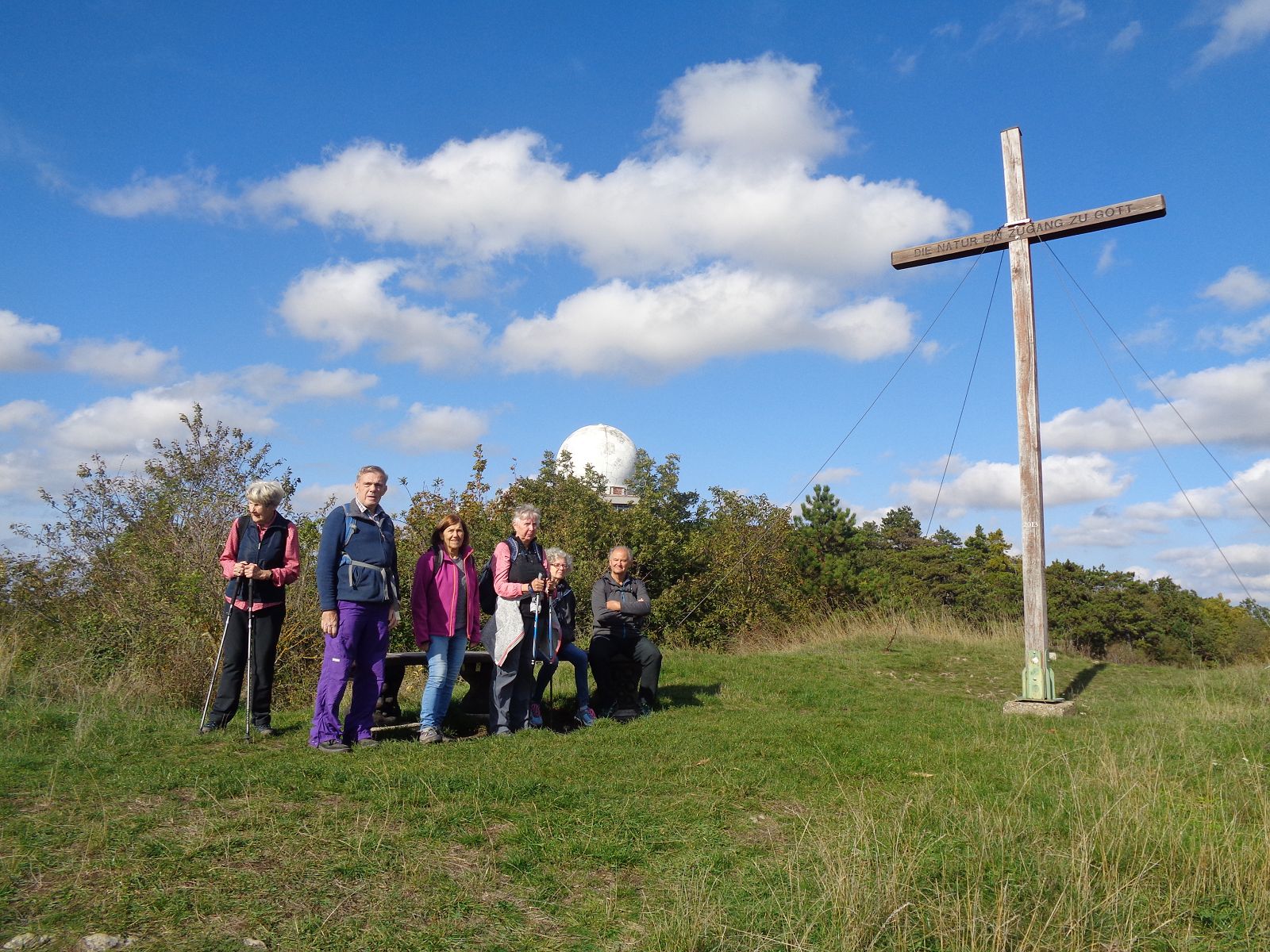 Gestärkt mit der Historie dieses wunderschönen Ortes machten wir uns auf den Weg zum Buschberg mit seiner Radaranlage zur Sicherung des Luftverkehrs im Umkreis von 300 km. Nach einer Stärkung aus dem Rucksack (die Buschberghütte war leider an diesem Wochenende geschlossen) wanderten wir weiter entlang des Zahlberges hinunter nach Au. Die B 6 überquerten wir auf der Römerbrücke nach Oberleis, wo wir die immer am Wochenende geöffnete Aussichtswarte bestiegen. Herrliche Ausblicke entschädigten uns für das Erklimmen der Aussichtsplattform mit 90 Stufen. Rund um die Warte ist ein Freilichtmuseum und im Innenraum des Turms ist eine Ausstellung über „6000 Jahre Wohnberg Oberleis“ zu sehen. Zurück wanderten wir wieder über die Römerbrücke und durch den Ortsteil Au nach Niederleis, wo wir im Gasthaus „Die LandWirtin“ köstlich verpflegt wurden.