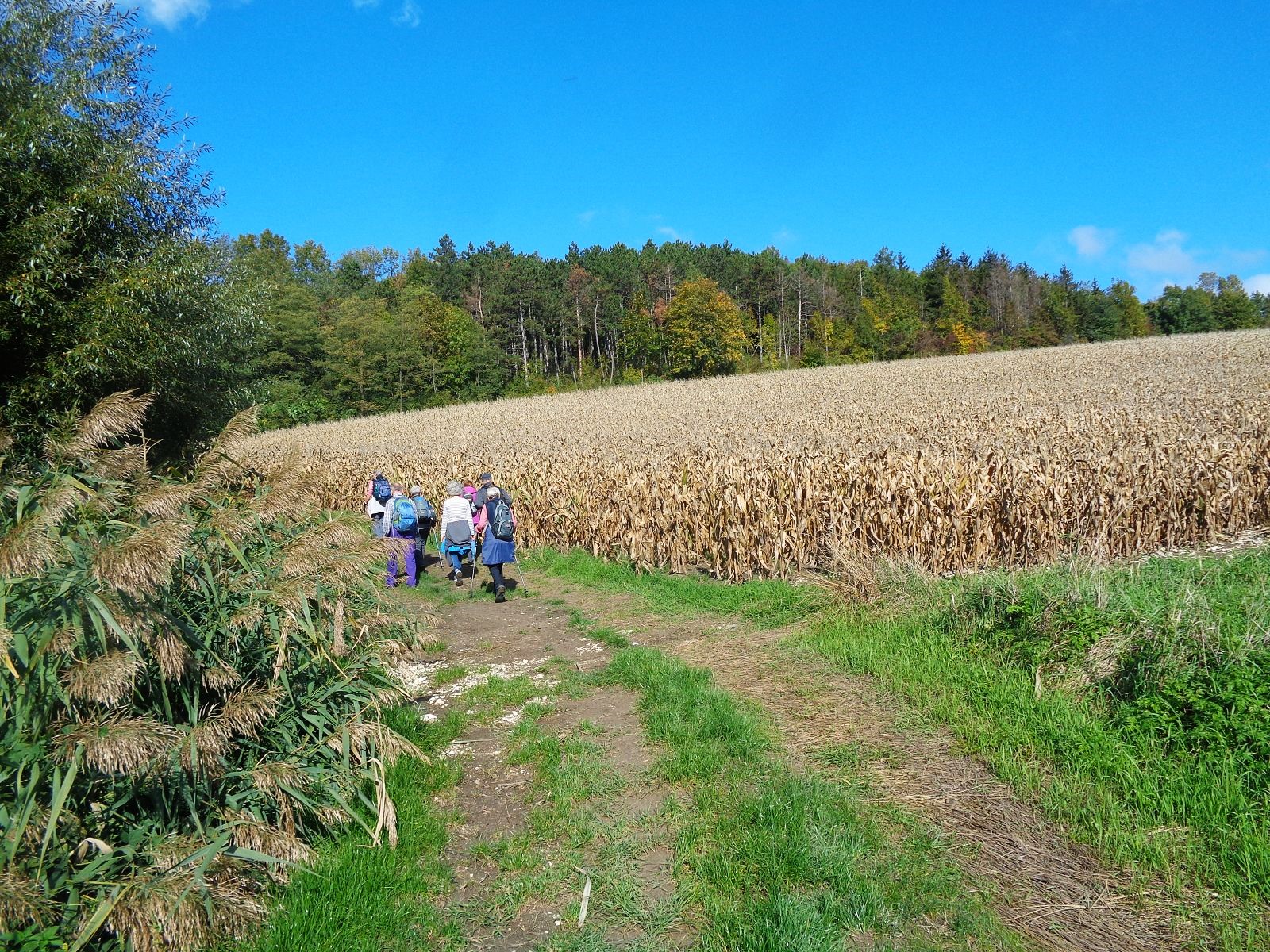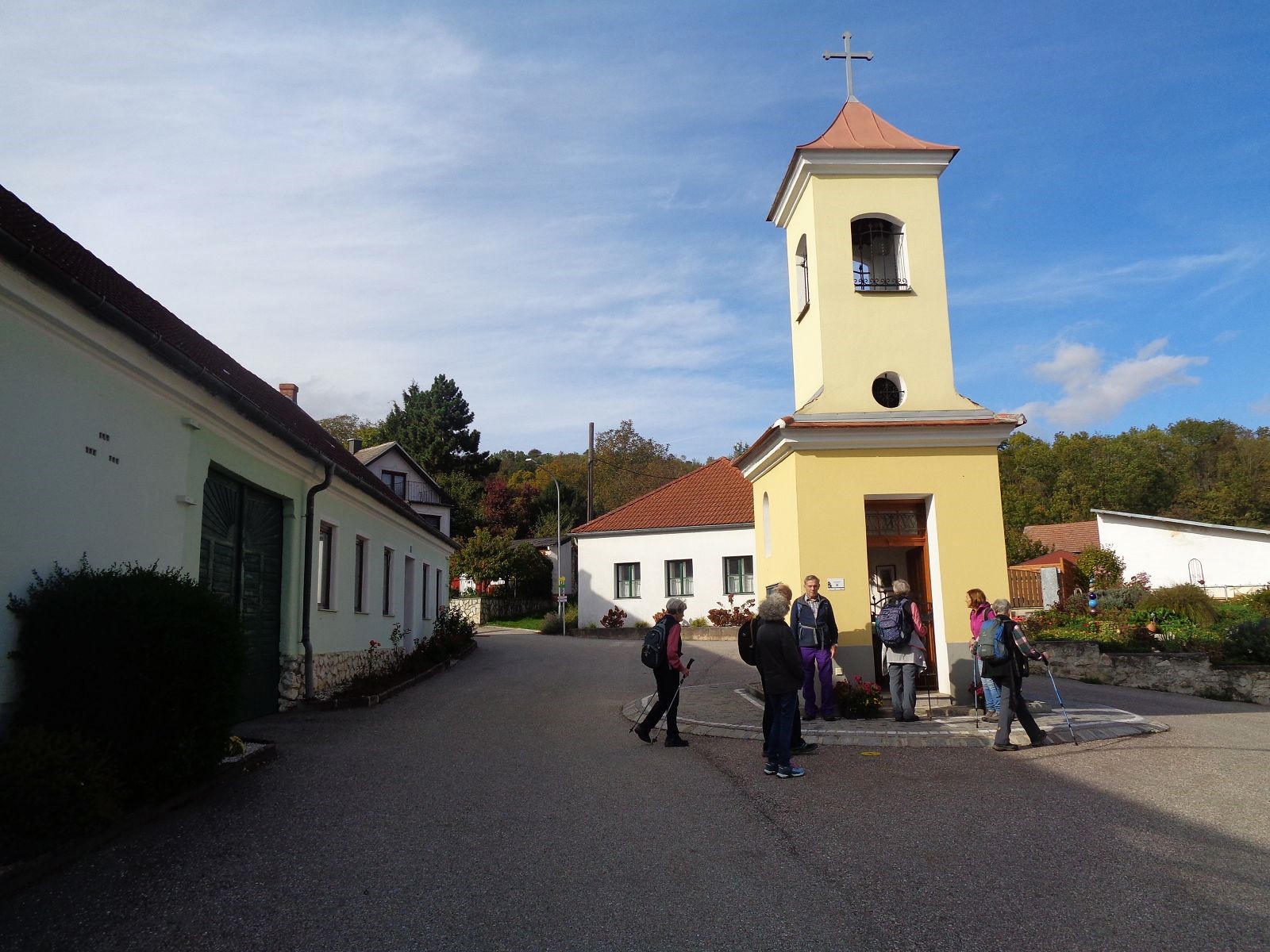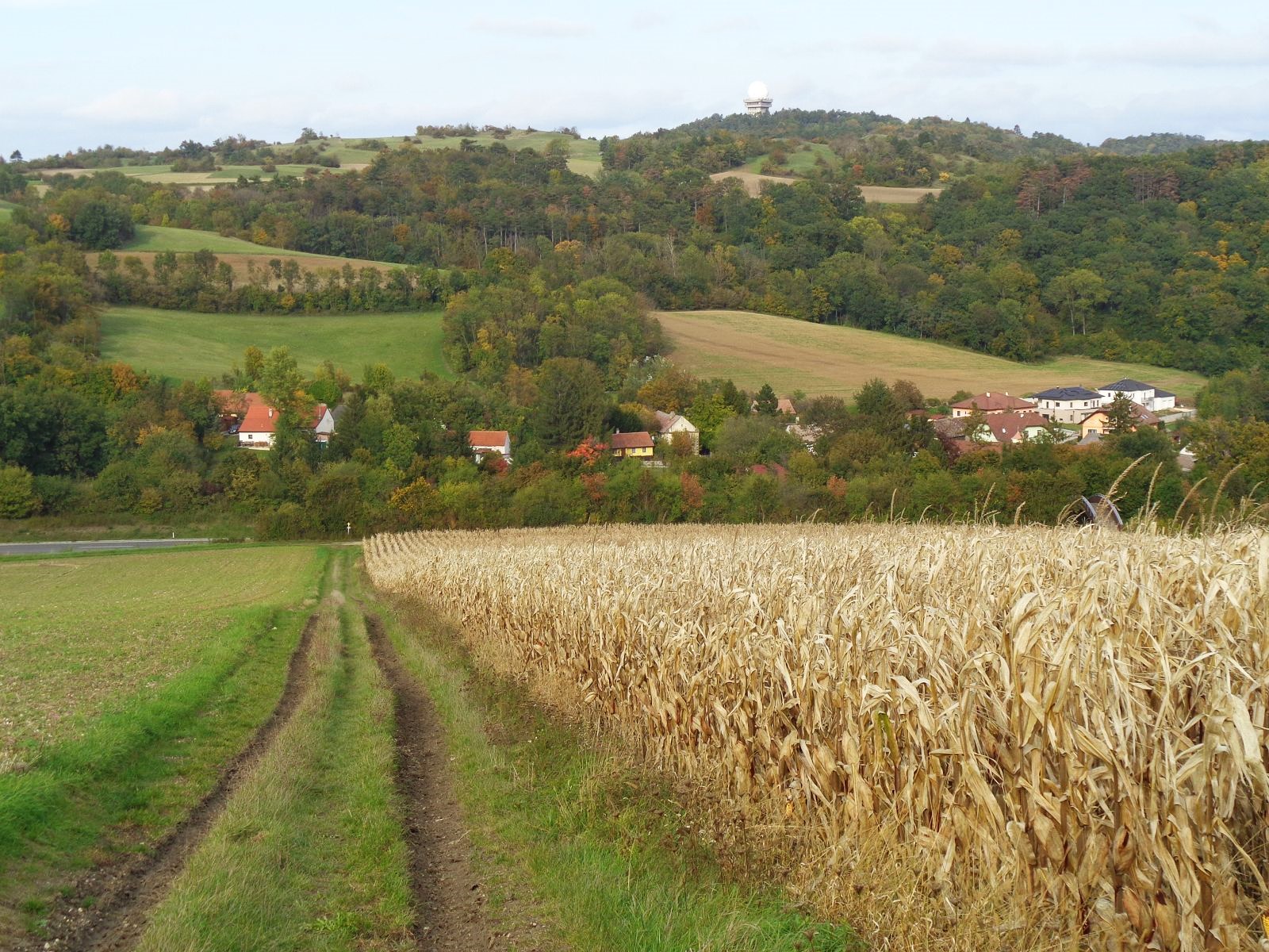 Gestärkt mit der Historie dieses wunderschönen Ortes machten wir uns auf den Weg zum Buschberg mit seiner Radaranlage zur Sicherung des Luftverkehrs im Umkreis von 300 km. Nach einer Stärkung aus dem Rucksack (die Buschberghütte war leider an diesem Wochenende geschlossen) wanderten wir weiter entlang des Zahlberges hinunter nach Au. Die B 6 überquerten wir auf der Römerbrücke nach Oberleis, wo wir die immer am Wochenende geöffnete Aussichtswarte bestiegen. Herrliche Ausblicke entschädigten uns für das Erklimmen der Aussichtsplattform mit 90 Stufen. Rund um die Warte ist ein Freilichtmuseum und im Innenraum des Turms ist eine Ausstellung über „6000 Jahre Wohnberg Oberleis“ zu sehen. Zurück wanderten wir wieder über die Römerbrücke und durch den Ortsteil Au nach Niederleis, wo wir im Gasthaus „Die LandWirtin“ köstlich verpflegt wurden.