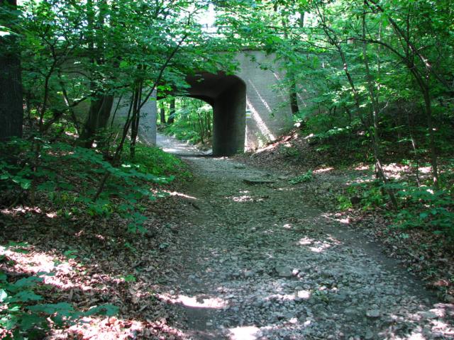 Die gelbe Markierung benützt einen sehr bequemen, kontinuierlich steigenden Waldweg, der den Hang zur Höhenstraße hinauf führt. Kurz vor der Höhenstraßenbrücke trifft der Weg auf die von der Waldandacht kommende grüne Markierung. Die beiden Markierungen laufen die letzten 100 m parallel, unterqueren die Höhenstraße und erreichen gleich darauf den tiefsten Punkt des Höhenrückens, der den Dreimarkstein (453 m) mit dem Hameau und der Sophienalpe (477 m) verbindet. Dieser Wegknotenpunkt trägt die Bezeichnung Höhenstraße/Zwei Gehängte. „Zwei Gehängte“ (447 m) ist ein historischer Flurname, der sich auf die unmittelbar westlich der Einsattelung gelegene Anhöhe bezieht.