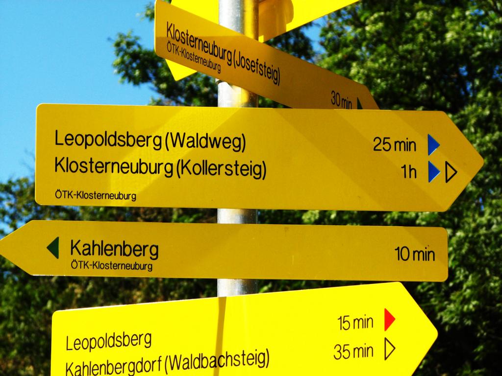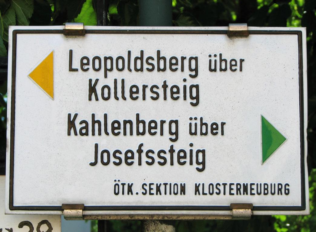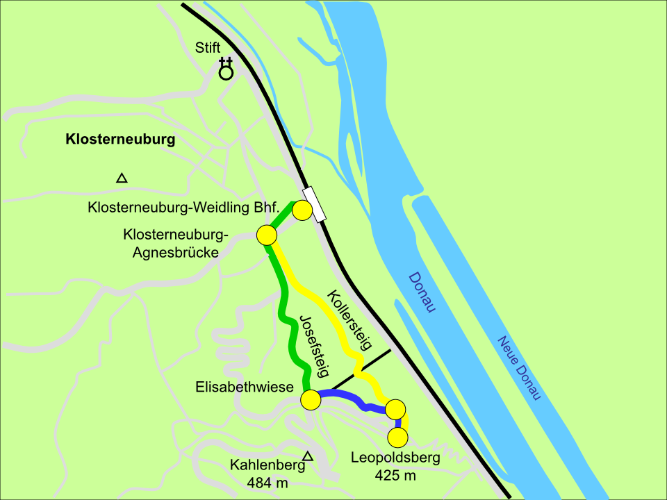 Der grün markierte Wanderweg auf den Kahlenberg (484 m) beginnt beim Bahnhof Klosterneuburg-Weidling. Fernab des Straßenverkehrs, führt die grüne Markierung ein kurzes Stück durch die Schömergasse, folgt 400 m dem Lauf des Weidlingbaches und trifft dann auf die große Straßenkreuzung bei der Agnesbrücke. Hier wendet man sich nach links und überquert die Weidlinger Straße. An dieser Stelle beginnen sowohl der gelb markierte Weg auf den Leopoldsberg (Kollersteig), der als Rückweg dienen wird, als auch der grün markierte Weg (Josefsteig), der auf den Kahlenberg führt. Der Josefsteig ist nach der kleinen Ansiedlung am Kahlenberg, die 1784 nach der Aufhebung der Kamaldulensereremitage durch Josef II. (1741-1790) den Namen Josefsdorf erhielt, benannt. Man folgt den Straßenzügen Sachsengasse, Josefsteig und Zwergjoch, die alle zügig bergauf Richtung Elisabethwiese und Kahlenberg (484 m) führen. Im unteren Teil des Siedlungsgebietes trifft man noch auf sehr viele alte Villen mit romantisch gegliederten Fassaden und schönen Dachlandschaften. Im oberen Teil werden die Häuser immer moderner und die Grundstücke immer aussichtsreicher. Der Blick zurück auf Klosterneuburg mit seinem Stift ist immer wieder lohnend. Bis auf 350 Höhenmeter erstreckt sich bereits der Siedlungsbereich, dann beginnt ein unbefestigter Fahrweg durch den Wald. Der grün markierte Josefsteig biegt nun rechts ab und erreicht nach 400 m bei der Elisabethwiese die Wiener Höhenstraße. Hier befinden sich die Gastwirtschaft Josefinenhütte und der Waldseilpark Kahlenberg. Von hier wären es noch 10 Minuten bis zur großen Kahlenbergterrasse. Der hier beschriebene Rundweg meidet aber das touristische Geschehen, überquert nicht die Höhenstraße, sondern benützt den links neben dem Parkplatz beginnenden blau markierten Waldweg.