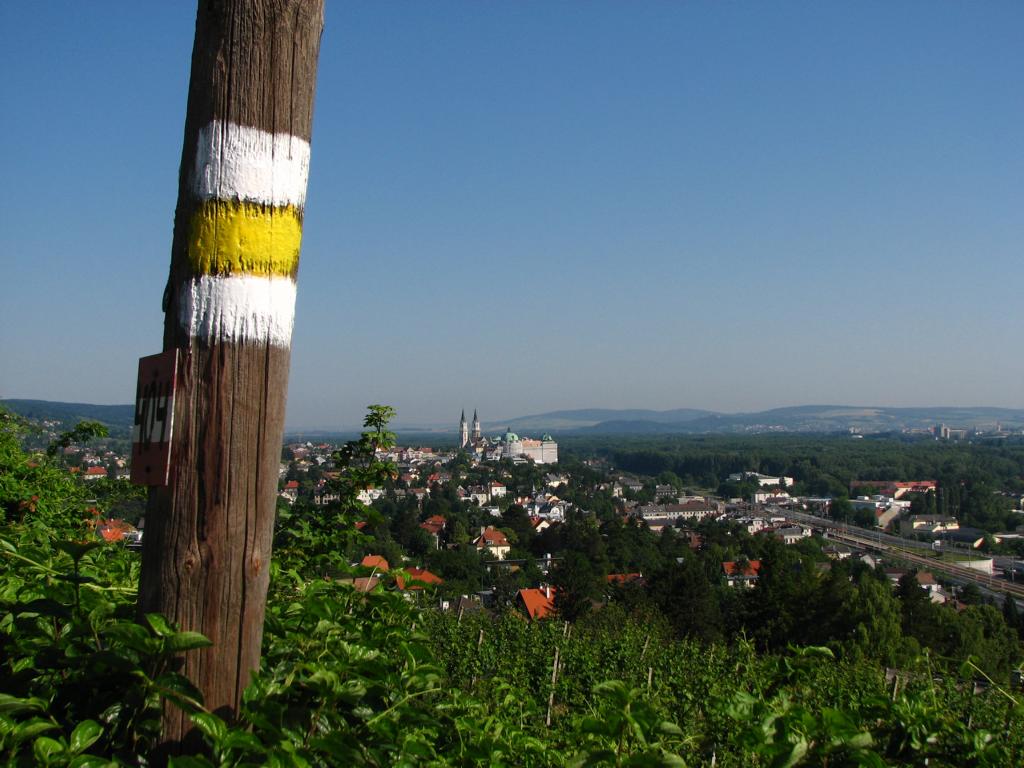Wie man sieht, hat der Kollersteig eine lange Geschichte. Ein Aspekt blieb bis jetzt aber noch unbeachtet. Der geradlinig nach Nordwesten verlaufende Weg ist die am Abhang des Leopoldsberges nachmarkierte Flugroute des Schleiers der Markgräfin Agnes. Um die Geschichte auch physisch zu Ende zu bringen, wäre es fast schon zwingend notwendig, auch jenen Ort zu besuchen, wo der Schleier nach seinem 3,6 Kilometer langen Flug niedergegangen ist – das Stift Klosterneuburg.