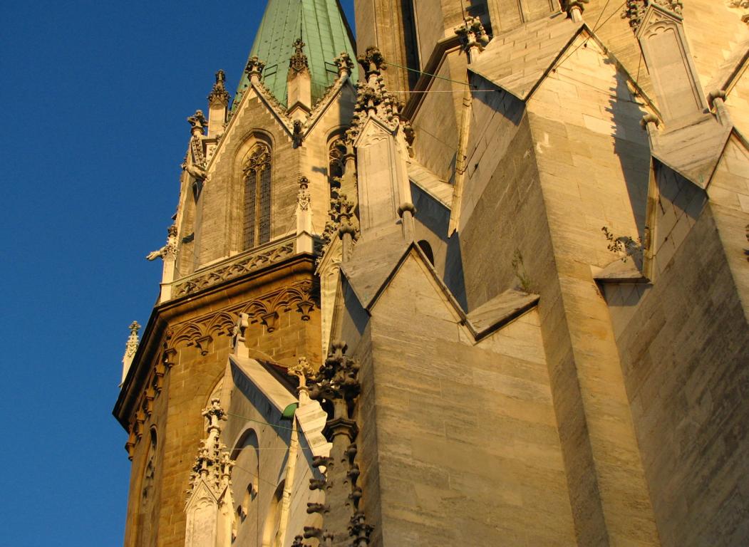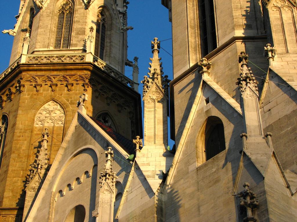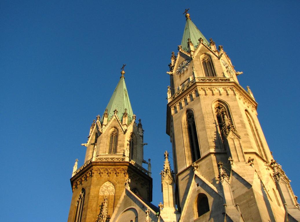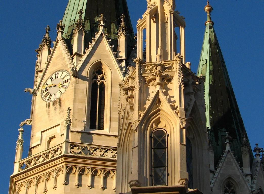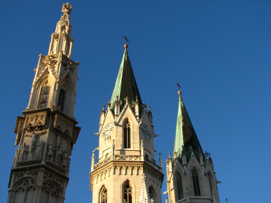 Das Herzstück der Klosteranlage, die ursprünglich romanische Stiftskirche, veränderte im Lauf der Jahrhunderte ihr Aussehen durch mehrere Umbau- und Renovierungsphasen erheblich. Ihr heutiges Erscheinungsbild erhielt sie am Ende des 19. Jahrhunderts. Die augenscheinlichste Veränderung war wohl der Um- bzw. Neubau der beiden Kirchtürme. Die Pläne für diesen Umbau stammten vom Dombaumeister des Wiener Stephansdoms, dem Architekten Friedrich von Schmidt (1825-1891). Schmidt, der den Wienern vor allem als der Schöpfer des Wiener Rathauses bekannt ist, war ein prominenter Vertreter des Historismus, insbesondere der gotischen Formensprache. Er wohnte zuletzt in Dornbach in der Andergasse an der roten Markierung hinauf zur Kreuzeichenwiese. Einer seiner namhaftesten Schüler war der Architekt Franz von Neumann jun. (1844-1905), der von Anfang an maßgeblich in den Wiener Rathausbau involviert war. Neumann war Mitglied des ÖTK und plante die Habsburgwarte auf dem Hermannskogel (542 m). Wen wundert es daher, dass die einst „schönste Warte der Monarchie“ als neogotischer Wehrturm errichtet wurde?