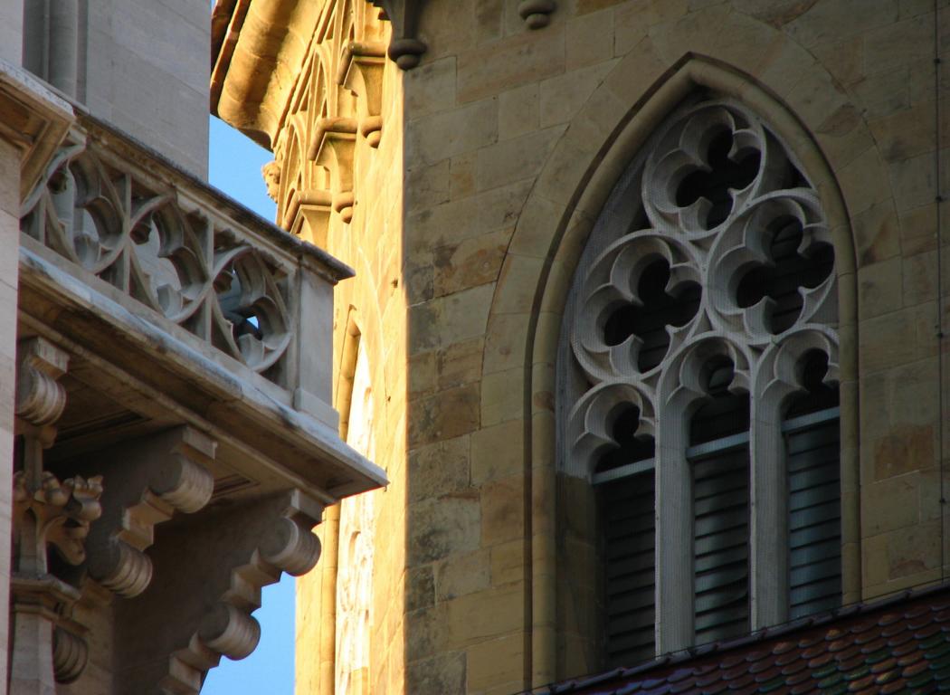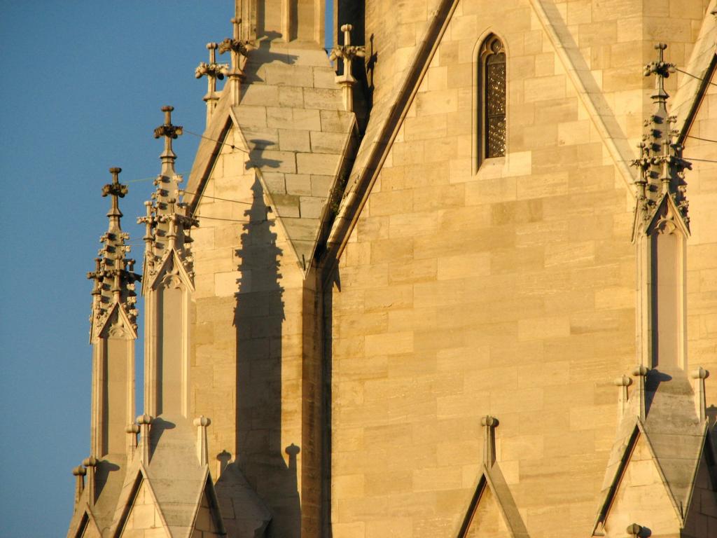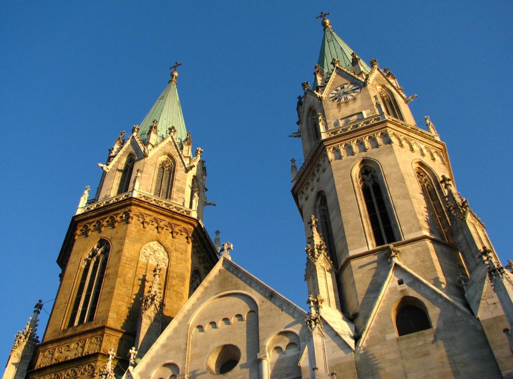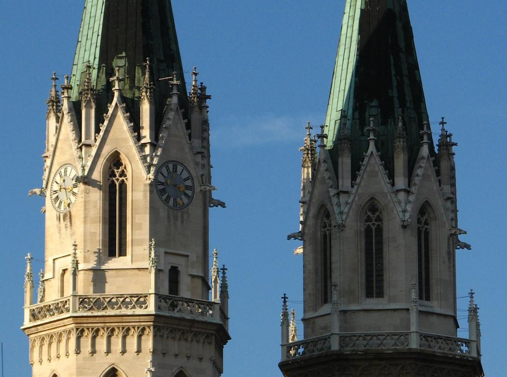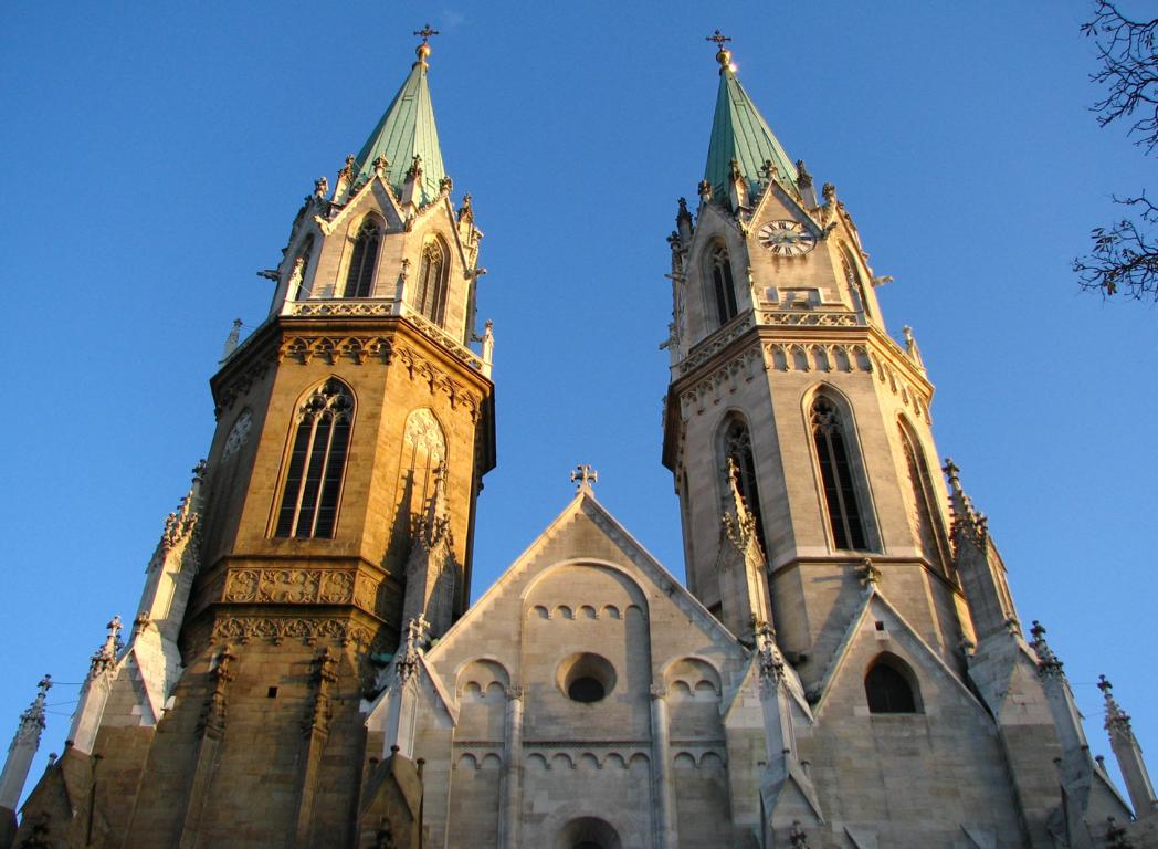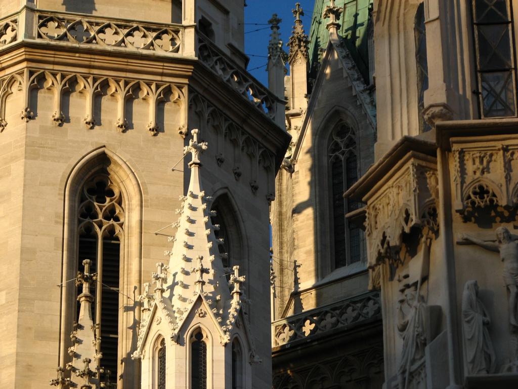 Das Herzstück der Klosteranlage, die ursprünglich romanische Stiftskirche, veränderte im Lauf der Jahrhunderte ihr Aussehen durch mehrere Umbau- und Renovierungsphasen erheblich. Ihr heutiges Erscheinungsbild erhielt sie am Ende des 19. Jahrhunderts. Die augenscheinlichste Veränderung war wohl der Um- bzw. Neubau der beiden Kirchtürme. Die Pläne für diesen Umbau stammten vom Dombaumeister des Wiener Stephansdoms, dem Architekten Friedrich von Schmidt (1825-1891). Schmidt, der den Wienern vor allem als der Schöpfer des Wiener Rathauses bekannt ist, war ein prominenter Vertreter des Historismus, insbesondere der gotischen Formensprache. Er wohnte zuletzt in Dornbach in der Andergasse an der roten Markierung hinauf zur Kreuzeichenwiese. Einer seiner namhaftesten Schüler war der Architekt Franz von Neumann jun. (1844-1905), der von Anfang an maßgeblich in den Wiener Rathausbau involviert war. Neumann war Mitglied des ÖTK und plante die Habsburgwarte auf dem Hermannskogel (542 m). Wen wundert es daher, dass die einst „schönste Warte der Monarchie“ als neogotischer Wehrturm errichtet wurde?