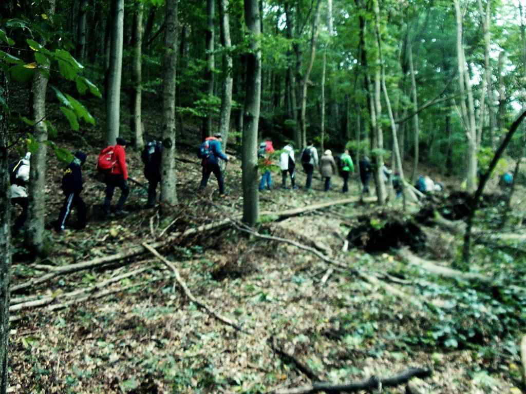 Nach der Begrüßung durch Hans ging es dann auch schon über das Brückerl auf die „richtige“ Seite der jungen Schwechat und stetig bergauf durch den Wald. Teile des Hohen Lindkogels sind Naturschutzgebiet, weshalb wir uns an die Wege hielten und in einem herbsteltend Wald, der aber noch in grüner Pracht stand langsam Höhenmeter für Höhenmeter bezwangen. Der Wienerwald scheint so lieblich, hatte aber von diesen doch 600 Höhenmeter und bäumte sich kurz vor dem Ziel als richtiger Ausläufer der Alpen noch kräftig auf. Die Abstände im Gänsemarsch haben sich dabei spätestens ab der Karlsruhe ziemlich gestreckt. Nach zweieinhalb Stunden erreichten wir dann final das Ziel das Eiserne-Tor-Schutzhaus mit seiner Sina-Warte. Geschafft! Nachfuhr von Flüssigkeit und köstlich schmeckenden Kalorien in Form vom Käsespätzle, Gulasch, Linsen und Nachspeisen liesen die Anstrengungen vergessen.