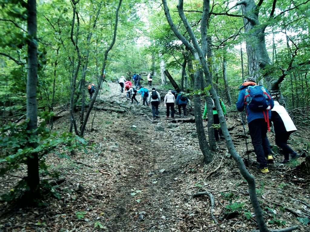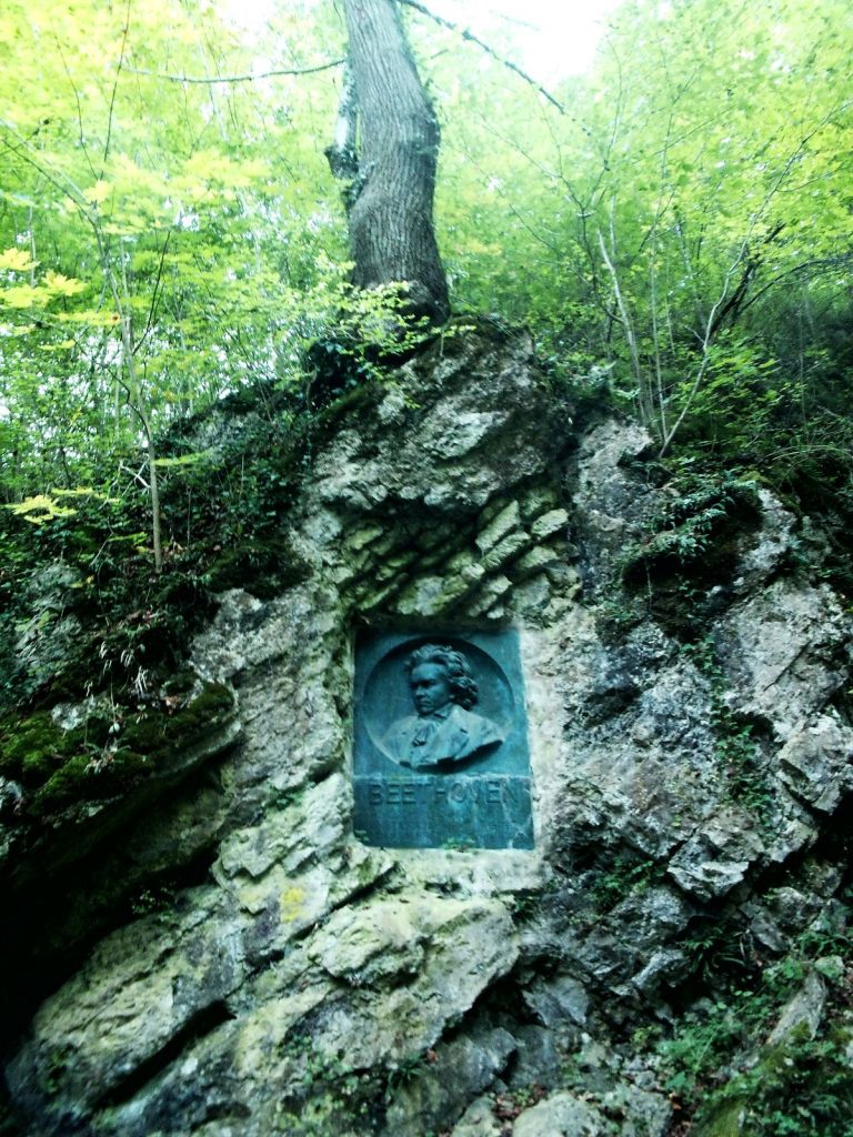 Danach folgte der Abstieg über den „steinigen Weg“, der seinem Namen alle Ehre machte und zu vorsichtigem Tritt ob der herauserodierenden Steine mahnte. Die Sonne lies sich ab und zu blicken und in Lichtungen konnte man den Blick über den südlichen Wienerwald bis nach Wien schweifen lassen. Wäre es ein klarer Tag gewesen sicherlich noch viel weiter, aber das machte nichts und so erreichten wir viel mehr plaudernd, da die Höhenmeter jetzt bergab gingen, wieder den Boden des Helenentals und passierten am Rückweg noch den Beethoven-Felsen bevor wir am Ausgangspunkt ankamen. Viele saßen dann noch im Gasthaus „Cholerakapelle“ beisammen, wir hatten aber einen Zug zu erwischen, den wir ohne Wartezeit erreichten.