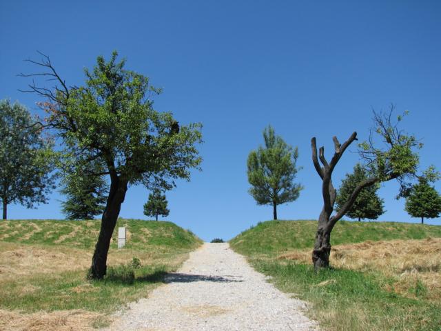 Hier befindet sich auch der Wegknotenpunkt Am Himmel, von dem eine rote Markierung zum Staubecken des Erbsenbaches hinunter führt. Die Höhenstraße ist nicht nur Wiens beliebteste Aussichtsstraße, sie ist hier auch die Grenze zwischen Wein und Wald.