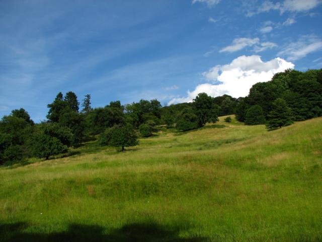 Der Weg führt vorerst gut 200 m parallel mit der grünen Markierung die Steinbachstraße aufwärts, bis er zum Autobuswendeplatz gelangt. Hier teilen sich die beiden Wege. Die gelbe Markierung zweigt nach rechts ab, überquert den Steinbach und benutzt nun die Serpentinen der stark ansteigenden Lebereckstraße. Beim Erreichen des Waldrandes wendet sich der Weg auf einer Forststraße nach links, dann gleich wieder nach rechts und führt nun als schöner Waldweg auf bzw. über das Lebereck (460 m) zum Wegknotenpunkt Moosbrunner Boden. Der erste Teil des Weges ist stetig steigend, der zweite Teil, ab der Querung der Hochspannungsleitung, verläuft fast eben durch einen schönen, abgeschiedenen Buchenhochwald.