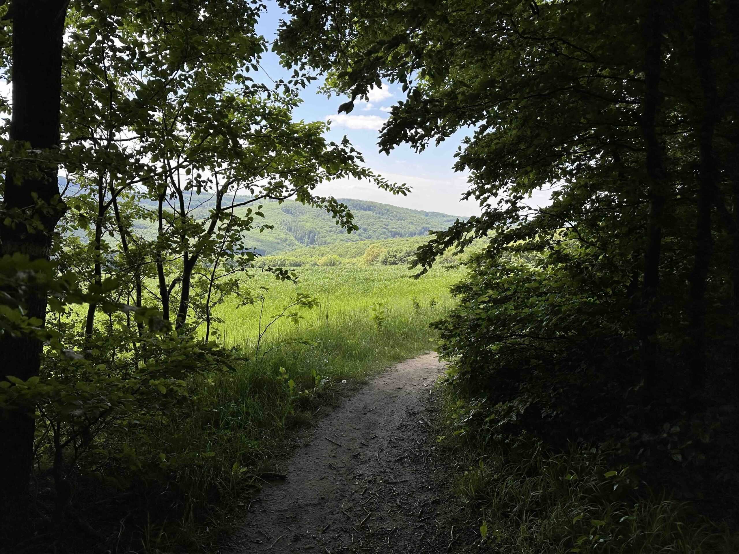 Der Weg schlängelt sich ein Stück hinauf in den Wald bis sich der Blick auf die Stockhammerwiese Richtung Exelberg eröffnet.