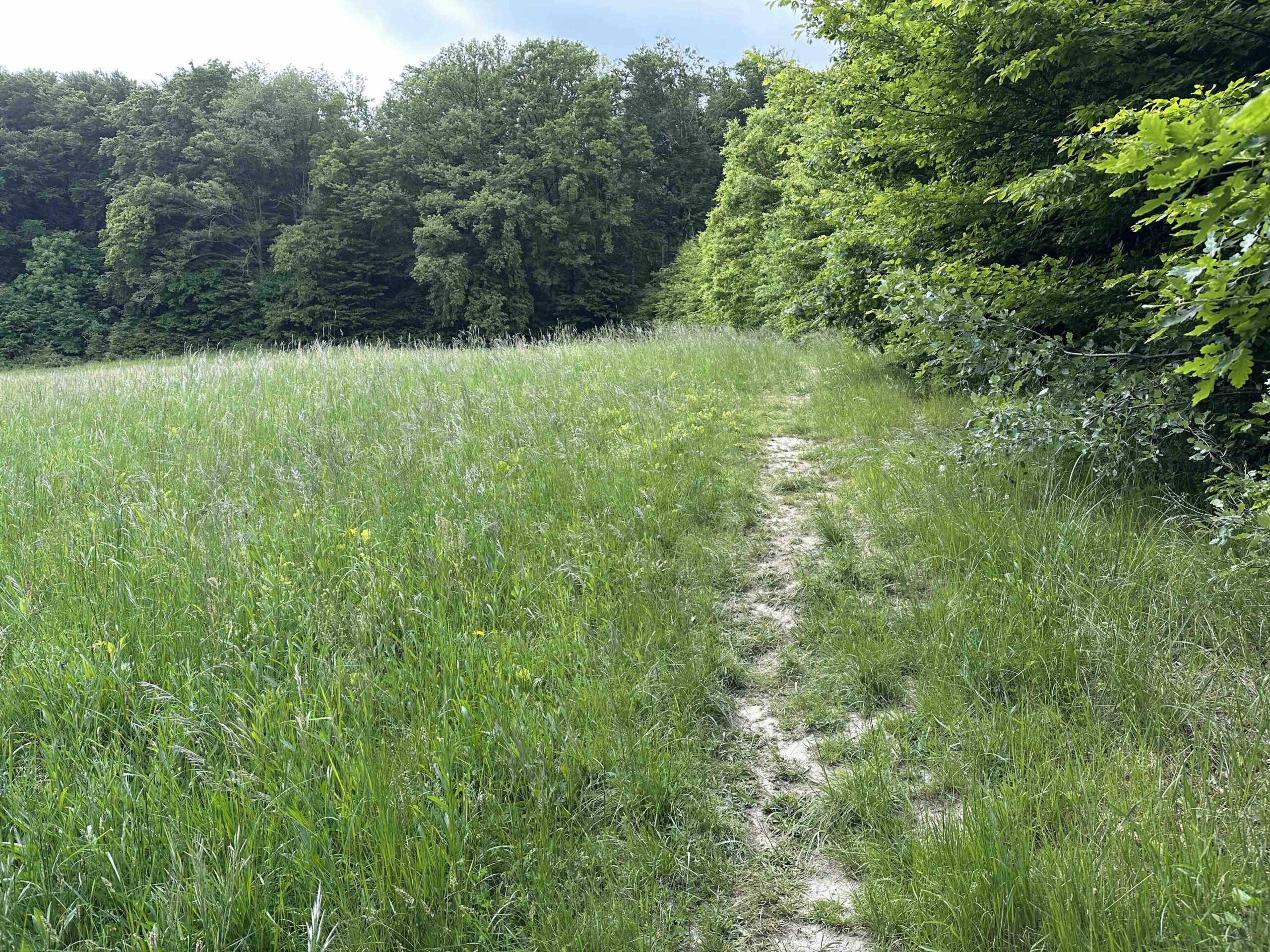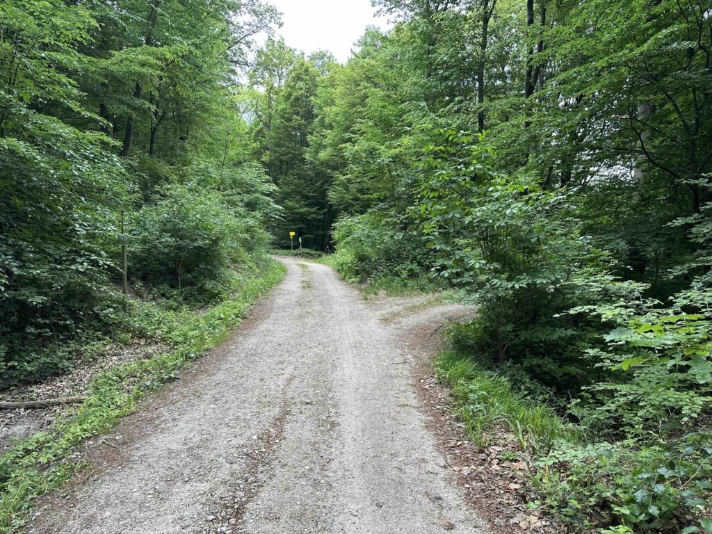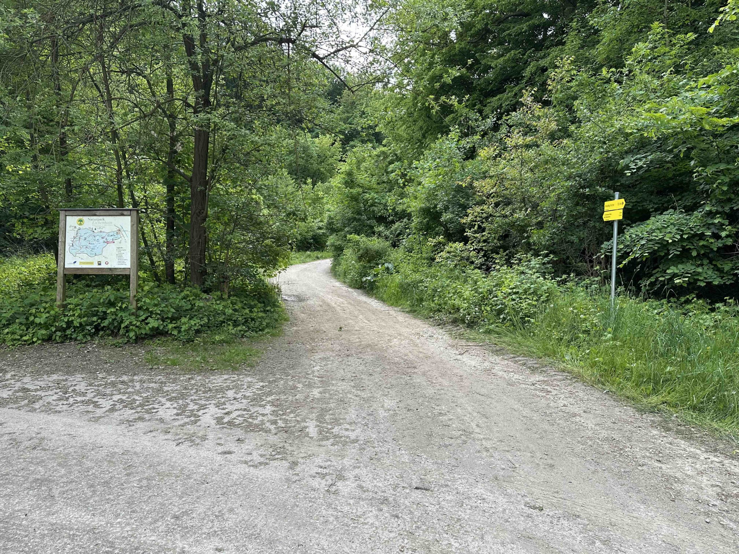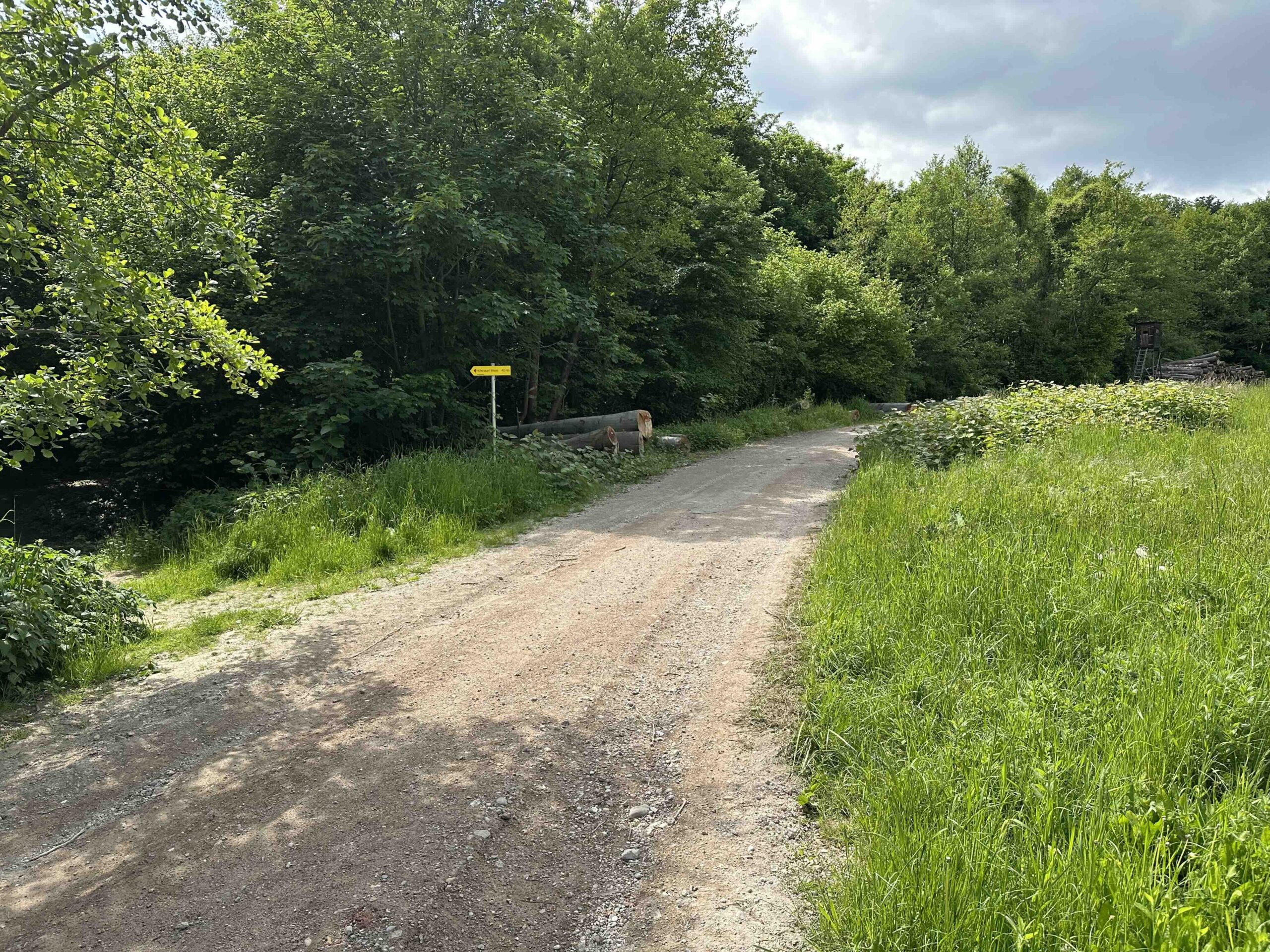 Gleich danach liegt der Wegknoten Weidling/Rotgraben, wo geradeaus der grün markierte Weg zur Windischhütte beginnt. Hier hält man sich rechts und kurz danach links in einen etwas versteckten Feldweg der zu einer idyllischen Wiese führt.