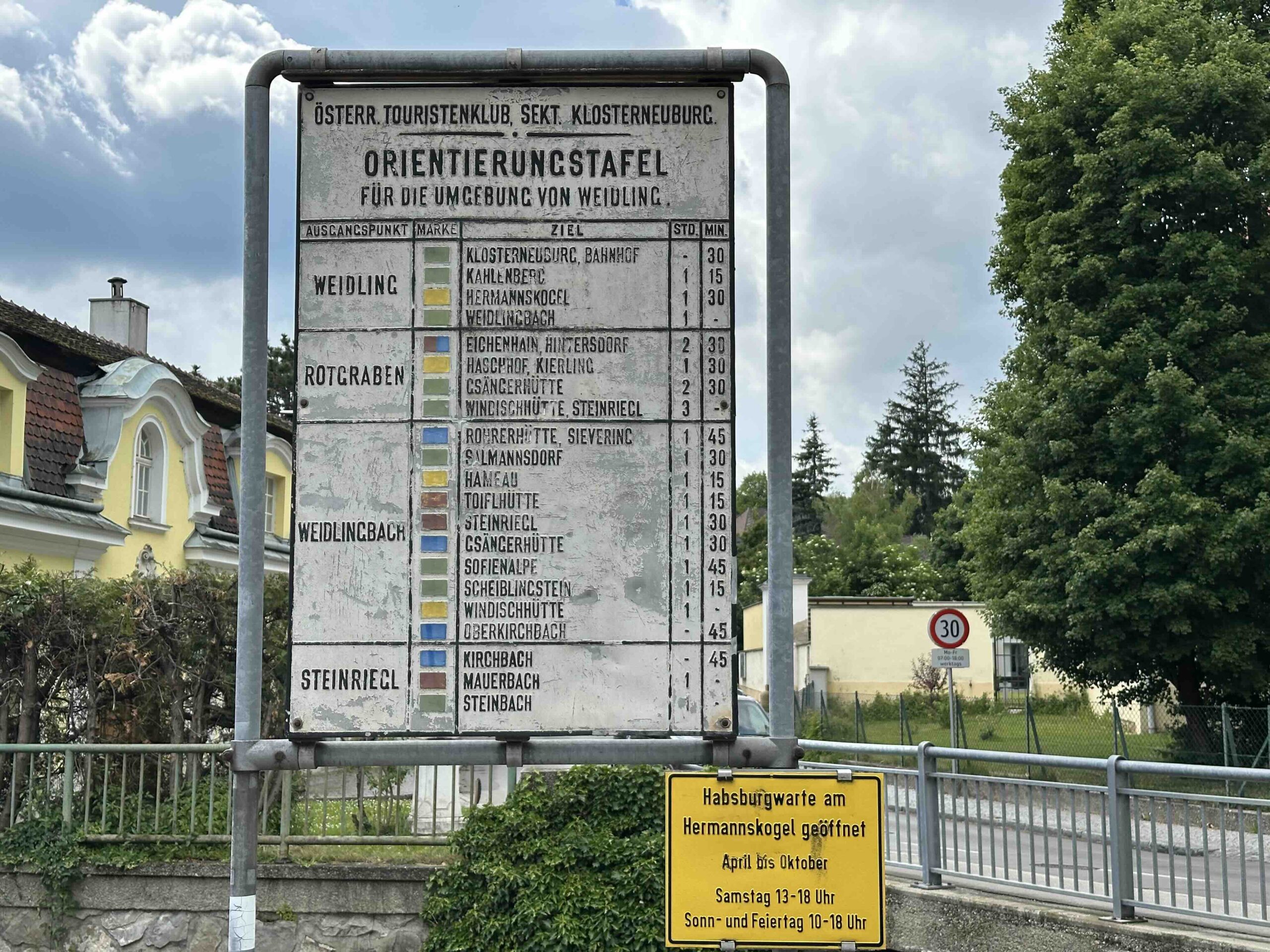 Von hier kann man entweder der blauen Markierung Richtung Windischhütte oder Richtung Kierling folgen. Oder der grünen Markierung Richtung Klosterneuburg.