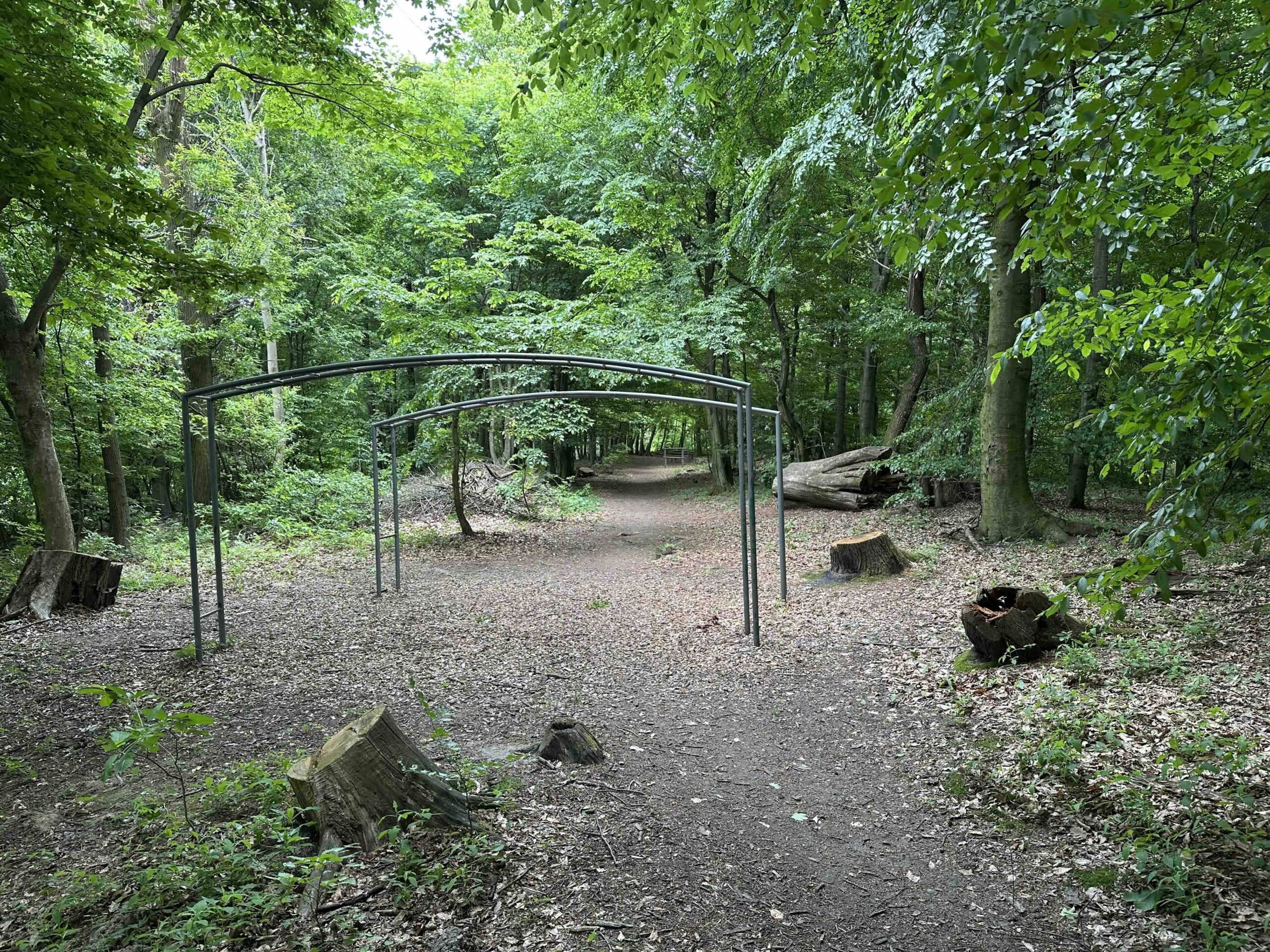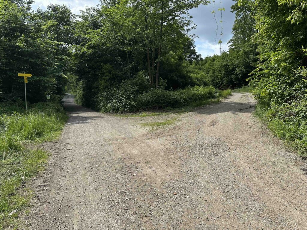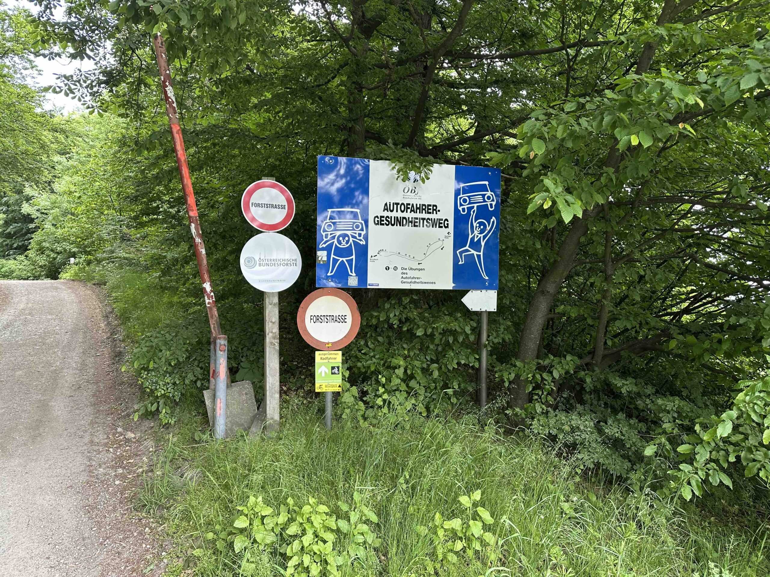 Man quert die Wegkreuzung geradeaus und folgt weiter der Forststraße bis zum Wegknoten Fitnessparcours, wo der rot markierte Weg vom Taferlberg einmündet. Kurz danach zweigt rechts der „Autofahrer Gesundheitsweg“ ab, der parallel zur Forststraße verläuft und die Möglichkeit bietet ein paar Übungen und eine kurze Rast einzubauen.