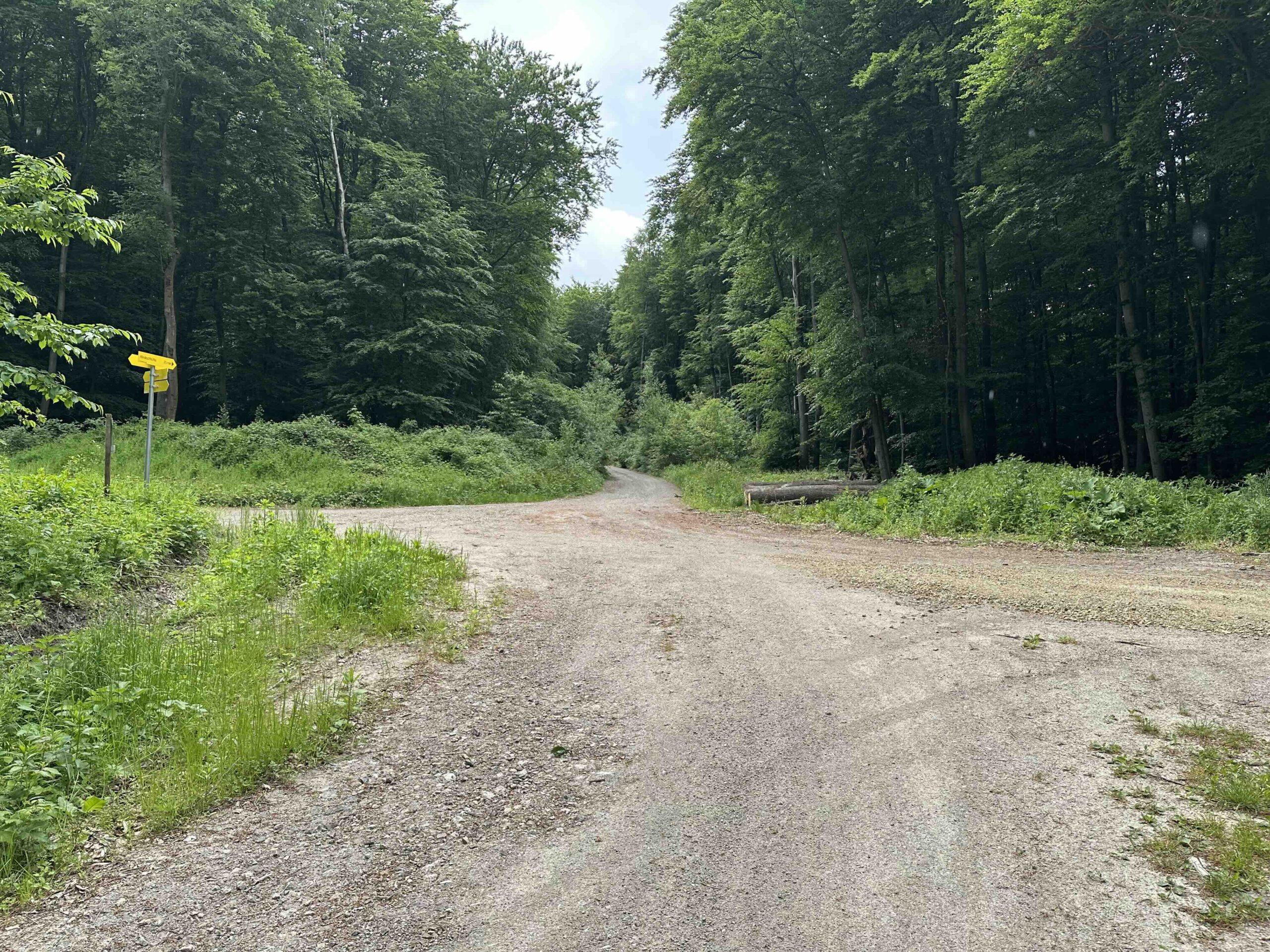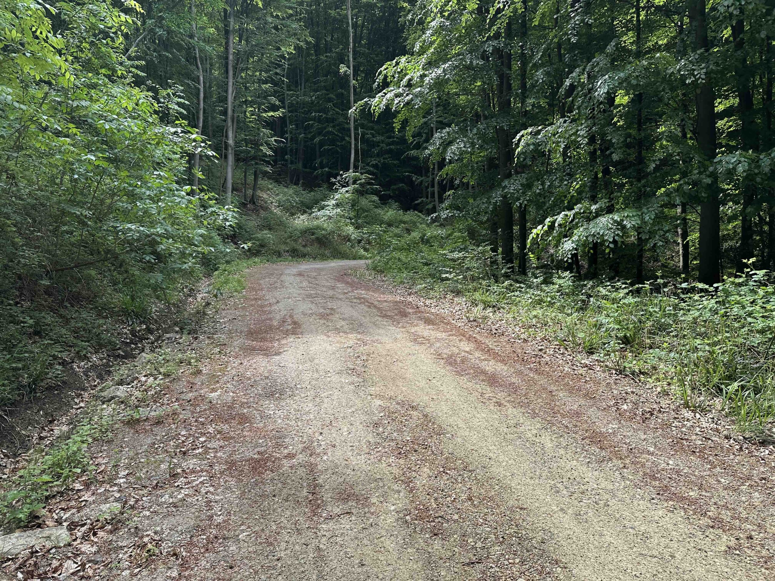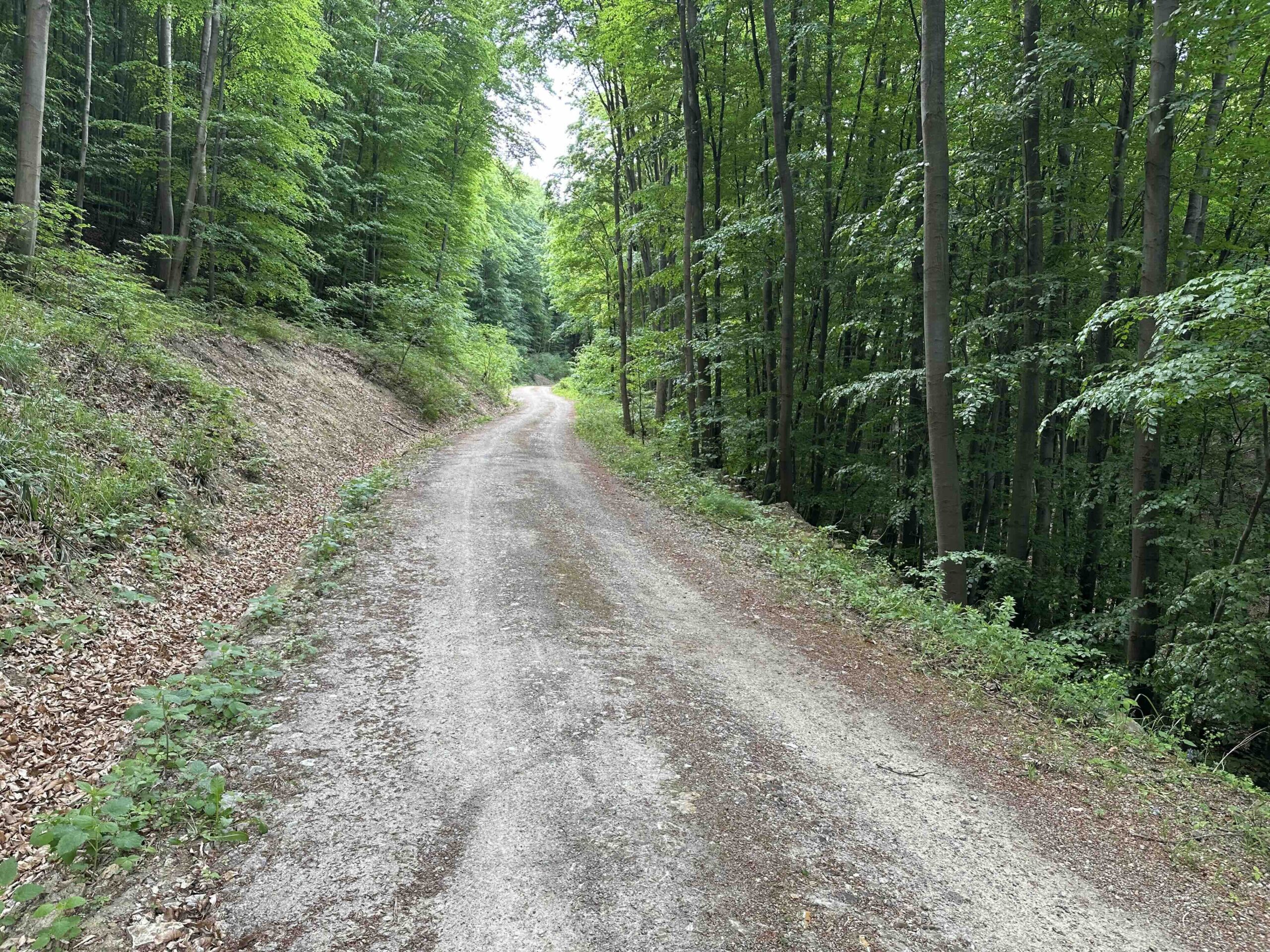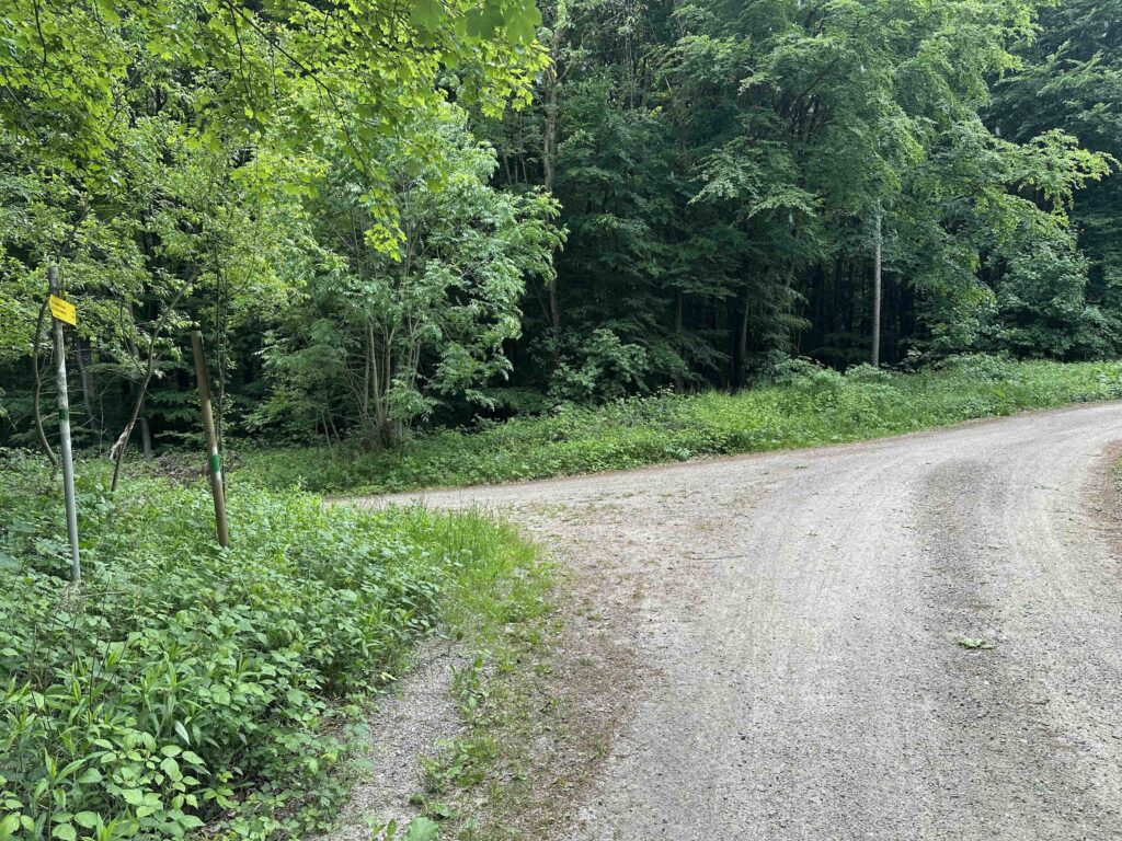 Hier hält man sich links und folgt der Forststraße bis links eine weitere Forststraße abzweigt in die man abbiegt. Nach einem kurzen Stück, an der nächsten Kreuzung, rechts und nun geht es weiter eine breite Forststraße oberhalb des tiefen Rotgrabens durch einen alten Blätterwald bis zum Wegknoten Rotwald, wo man die blaue Markierung vom Taferlberg nach Eichenhain kreuzt.