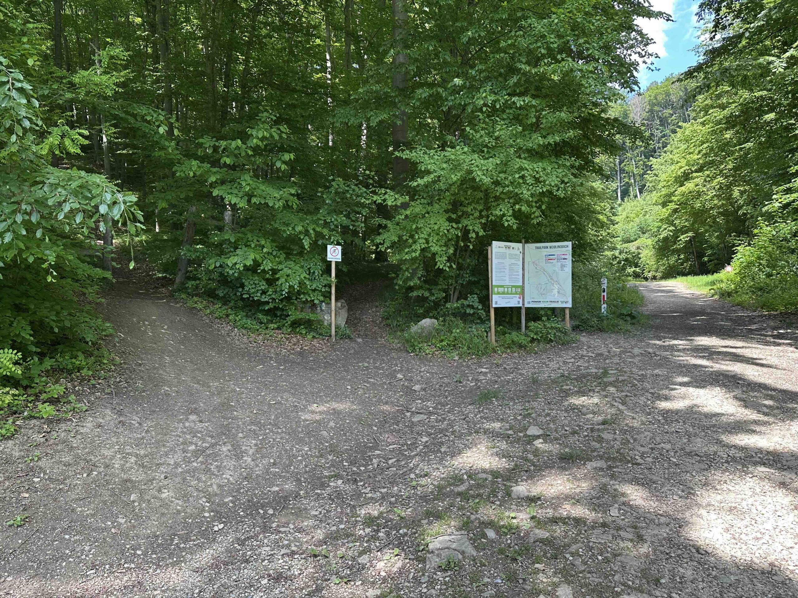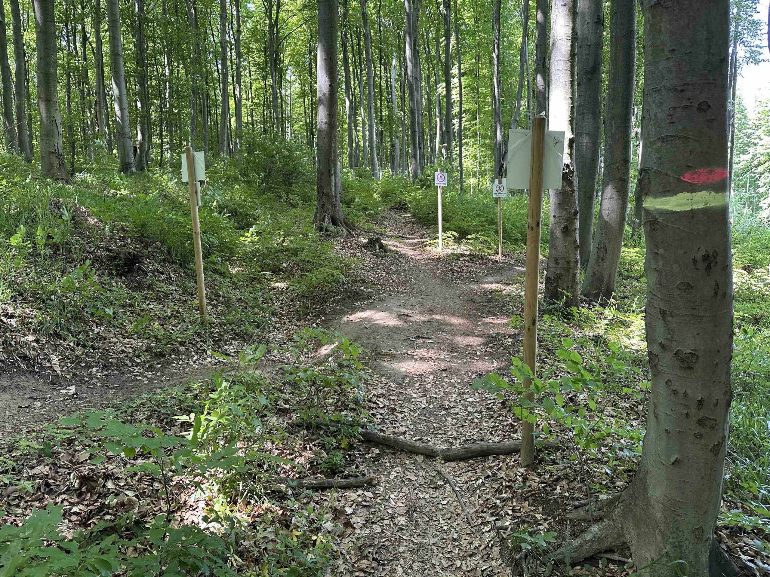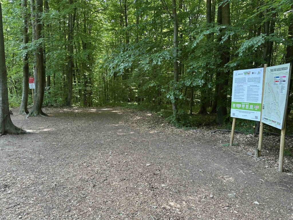 Hier, beim Schranken, führt die Forststraße weiter (auf der linken Seite des Grabens) auf den Taferlberg. Hier beginnt der eigentliche Wanderweg (mittig zwischen Infotafeln rechts und einem Mountainbiketrail links), der sich zwischen den Trails (von denen man aber nicht viel mitbekommt) den Wald hinauf schlängelt. Anfangs etwas steiler und danach, ab der Querung mit einem Verbindungstrail auf halber Höhe, flacher und schnurstracks nach oben. Am Ende befindet sich eine kleine Lichtung auf der wir wieder auf die Forststraße treffen.
