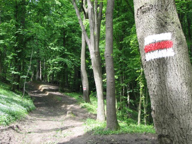Der rot markierte Weg führt auf einem gepflegten Forstweg kontinuierlich steigend durch das ruhige Tal des Spießbaches. Besonders beachtenswert sind der tief eingeschnittene Bachlauf und der am gegenüberliegenden Hang gut einsehbare Buchenhochwald mit seinem alten Baumbestand. Nach gut einem Kilometer werden die Höhenstraße und kurz darauf auch der Höhenstraßen-Begleitweg übersetzt. Der Weg wird nun etwas enger und erreicht nach einer kurzen Steigungsstrecke den Parkplatz beim Häuserl am Roan. Hier tritt man aus dem Wald und wird mit einem herrlichen Blick auf Wien belohnt. Das Häuserl am Roan, ein direkt an der Wiener Höhenstraße gelegenes und beliebtes Wienerwaldrestaurant, befindet sich einige Meter unterhalb des unscheinbaren Gipfels des Dreimarksteins (453 m).